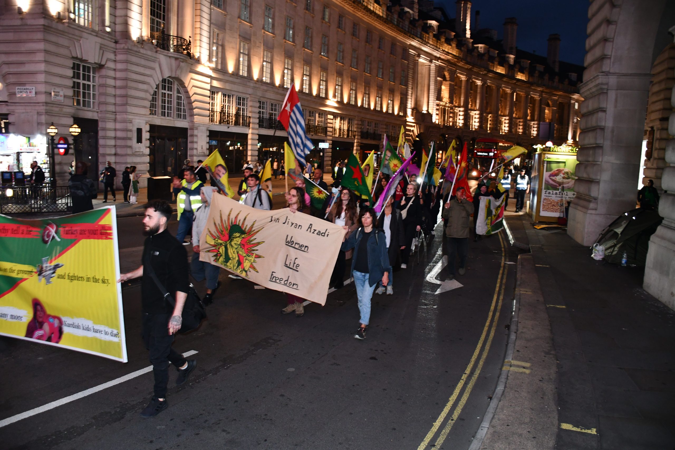 PKK hareketinin temel sloganı, kadın devrimini sembolize eden “Jin, Jîyan, Azadî” sloganı, Jîna Amini ve onun gibi faşist-ataerkil devlet sistemlerinin kurbanı olan binlerce kadının intikamının ruhuyla Londra sokaklarında devamlı yankılandı.