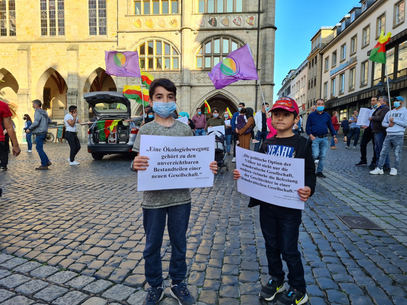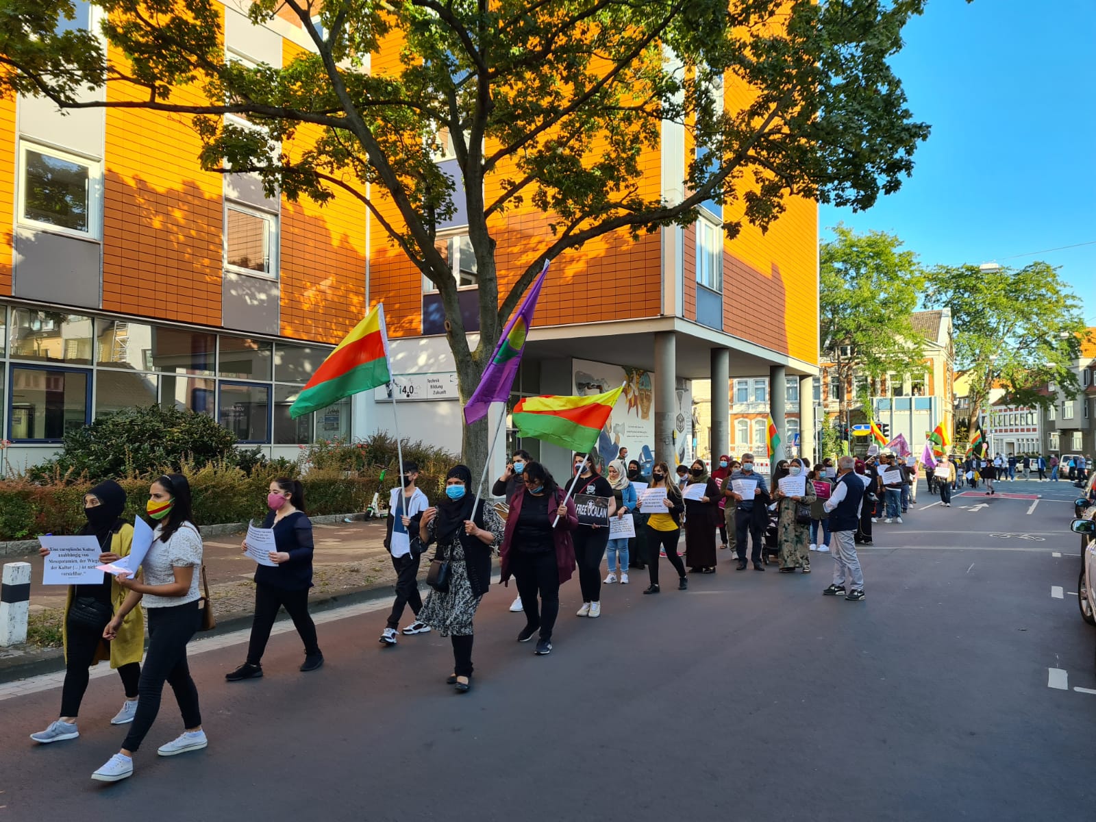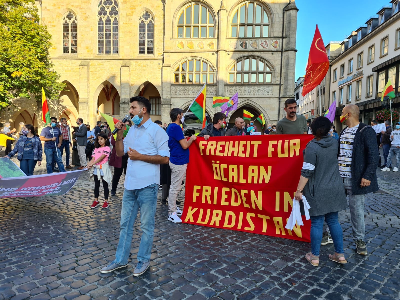 Eylem, saat 16’da Kardinal Bertram Str’de bir dakikalık saygı duruşu ile başladı. Almanca pankart ve dövizlerin taşındığı yürüyüşte sık sık, “Bijî Serok Apo”, “Be Serok Jiyan Nabe”, “Eslebe Öcalan”, “Bijî Partiya Karkeren Kurdistan” ve “Jin Jiyan Azadi” sloganları atıldı.