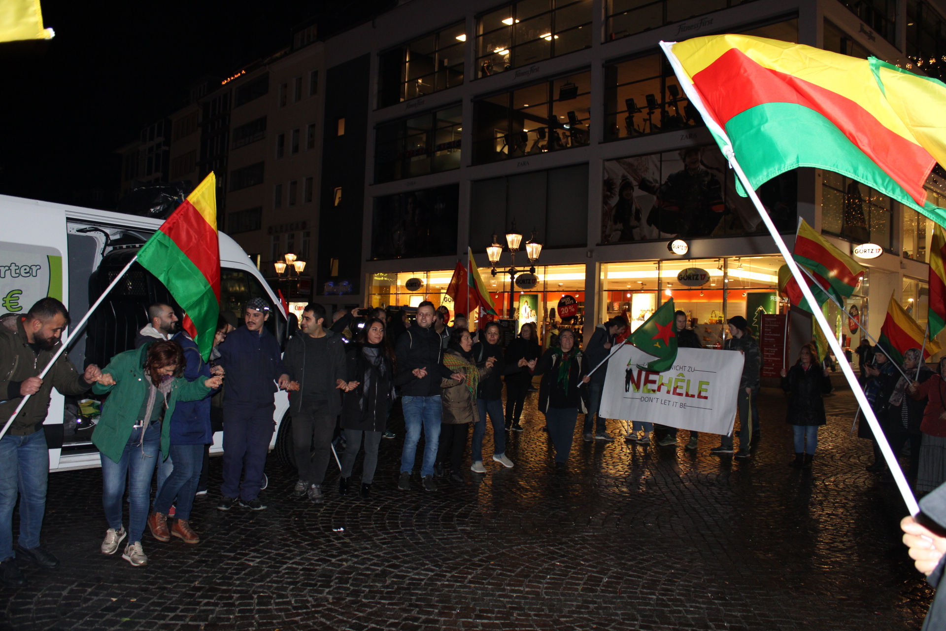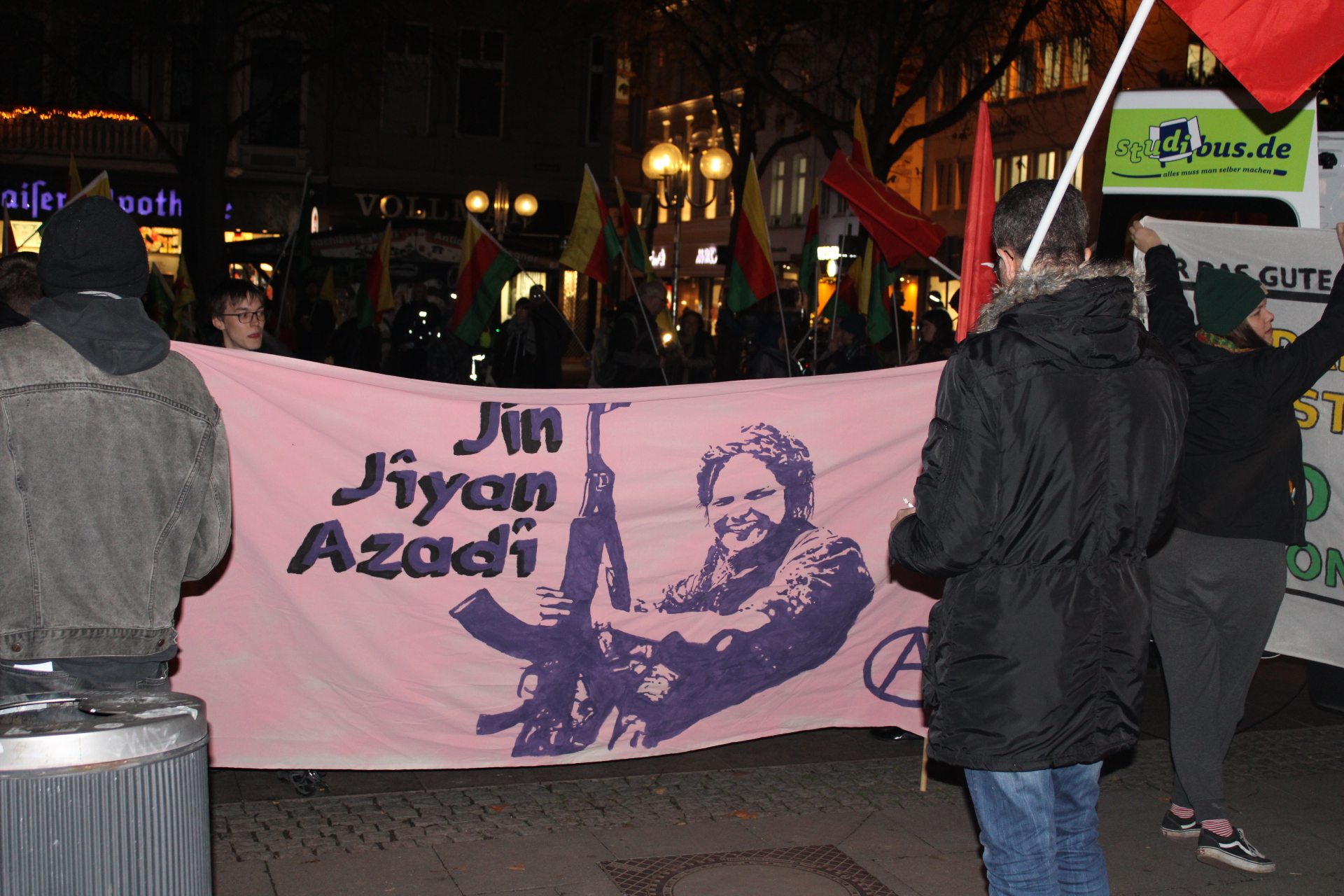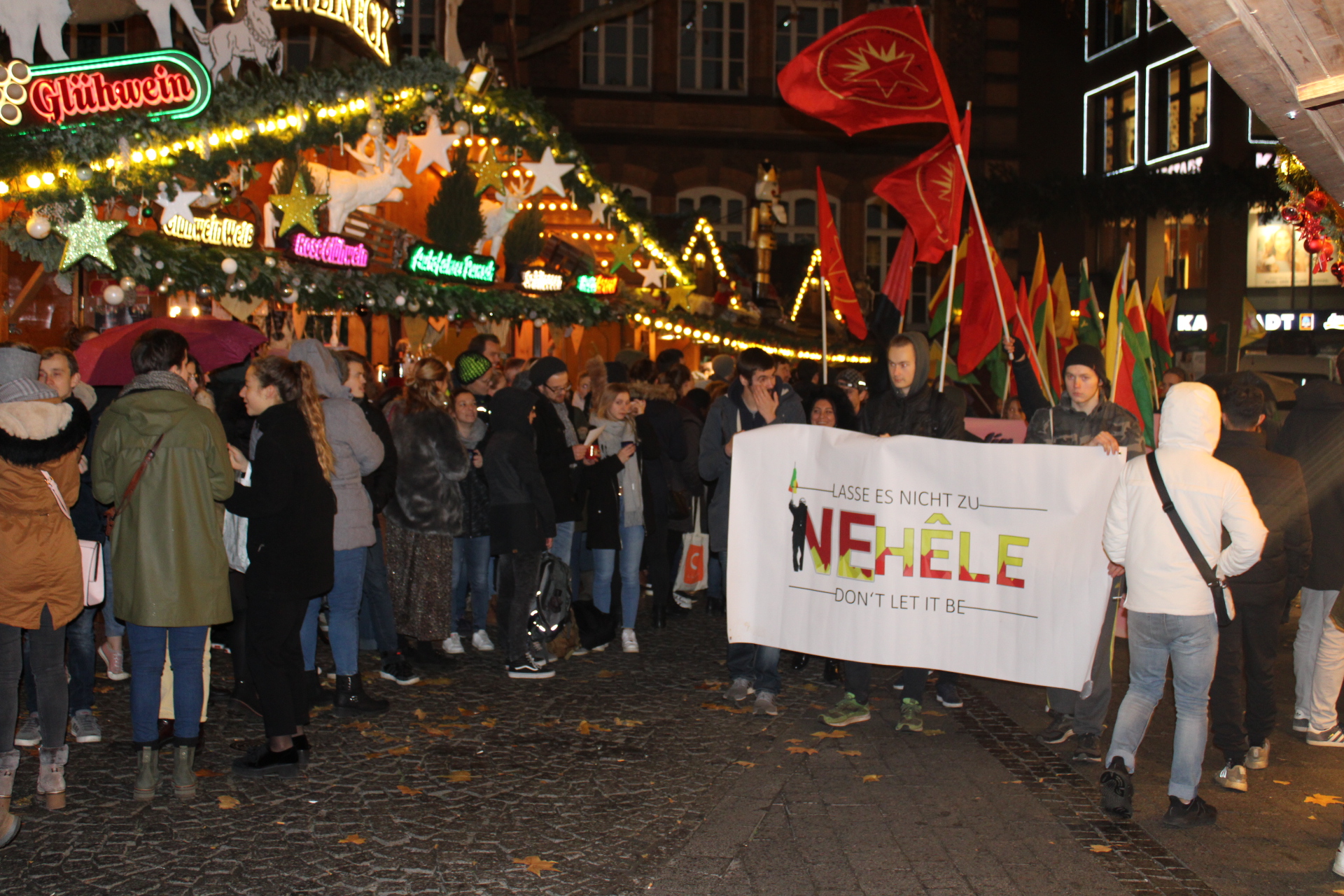 27 Kasım akşam 18’de Bonn Kaiser Platz’da toplanan gençler, burada Kürdistan devrim şehitleri anısına durulan bir dakikalık saygı duruşunun ardından yürüyüş başladı. Üzerinde Almanca, İngilizce ve Kürtçe “İzin Verme” ve “Jin, Jiyan, Azadî” yazan pankartlar başlayan yürüyüşte çok sayıda YPG-YPJ, TEV-DEM ve TCŞ flamaları taşındı. Sık sık “Bijî PKK”, “Bijî Serok APO” ve “Bijî berxwedana Rojava” sloganları atılırken, yaklaşık 2 saatin sonunda yürüyüş Münster Platz’da son buldu. Burada 42 yıl dönümünde PKK mücadelesi üzerine kısa konuşmalar yapıldıktan sonra kutlama halaylar ile devam etti.