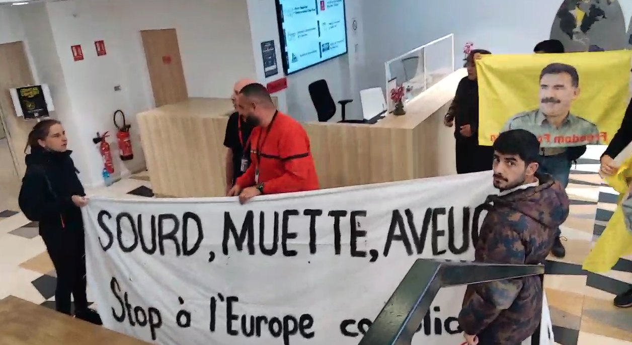 MARSİLYA – Gençler Fransızca “Önder APO’ya Özgürlük” yazılı pankart ve sık sık “Liberté pour Öcalan”, “Freedom For Kurdistan” sloganları ile binaya girdiler.