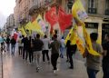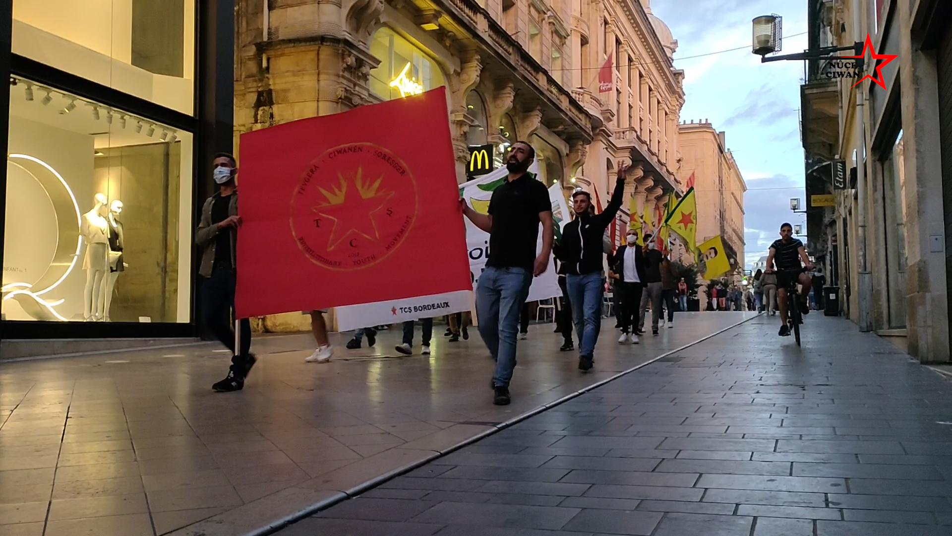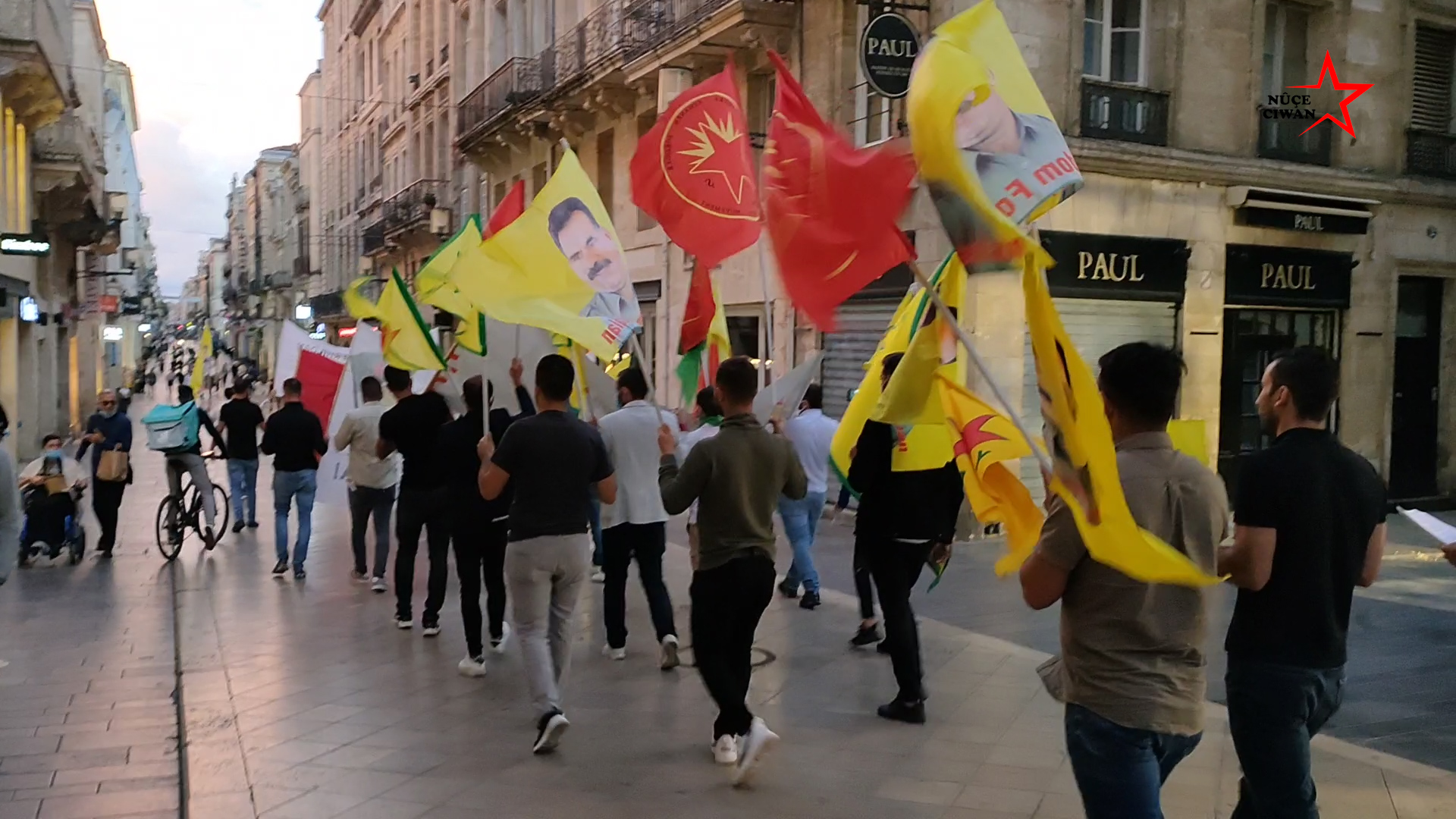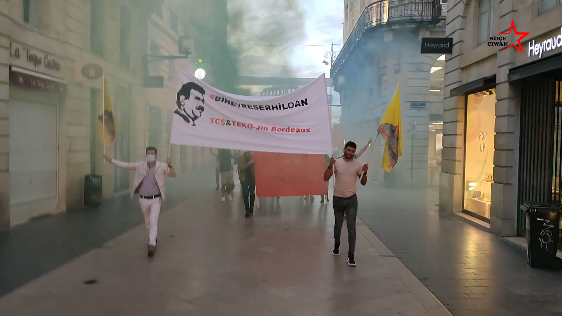 Rue Sainte Catherine caddesinde yapılan yürüyüşte, Fransızca ve Kürtçe “Bi Hev Re Serhildan”, “Rojava’yı Savun” pankartları ve büyük bir TCŞ bayrağı açıldı. Renkli dumanlar ile yürüyüşe ilgi çeken gençler, Fransızca ve Kürtçe sloganlar ile Halklar Önderi Öcalan’a özgürlük talebinde bulunurlarken, Cenga Heftanîn direnişine de destek verdiler.