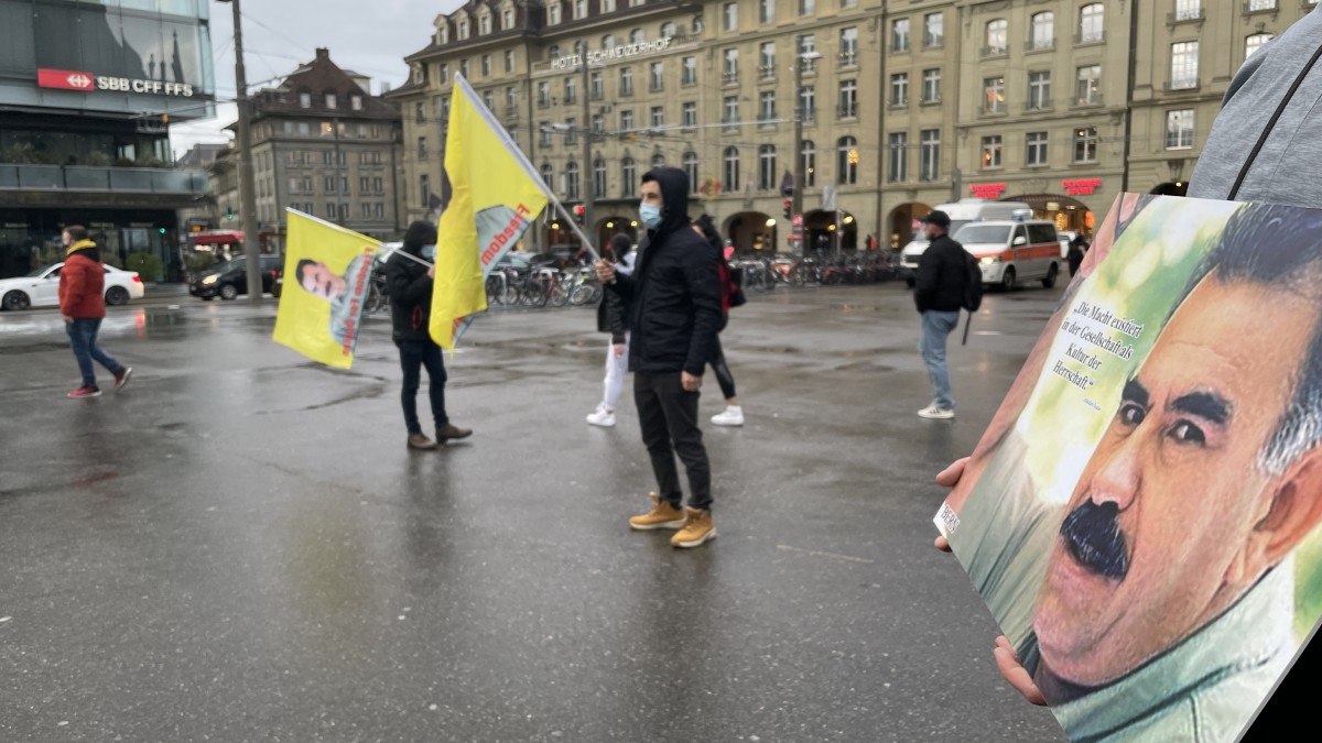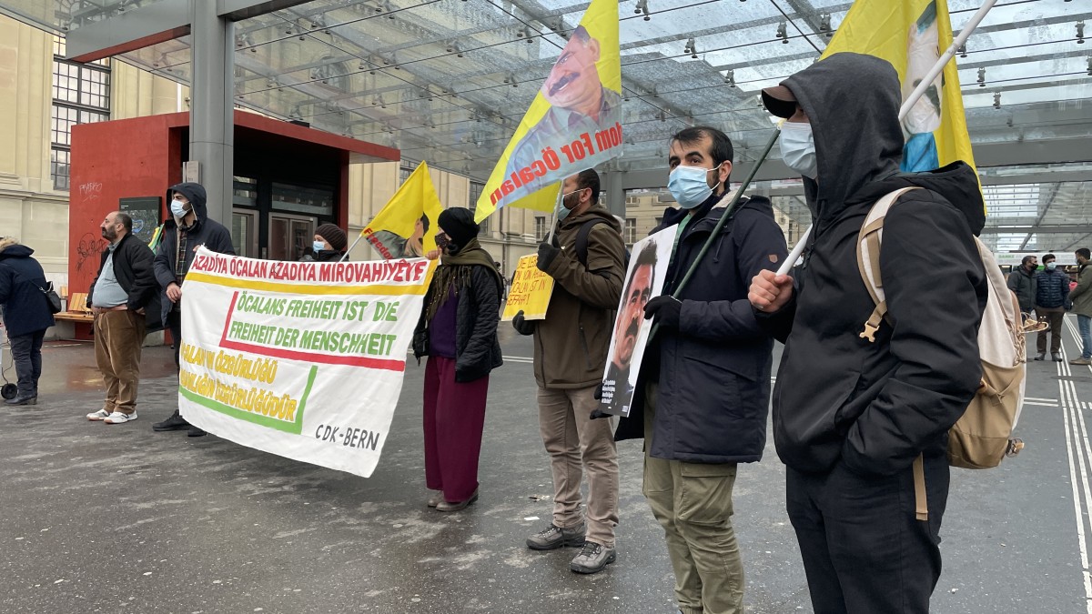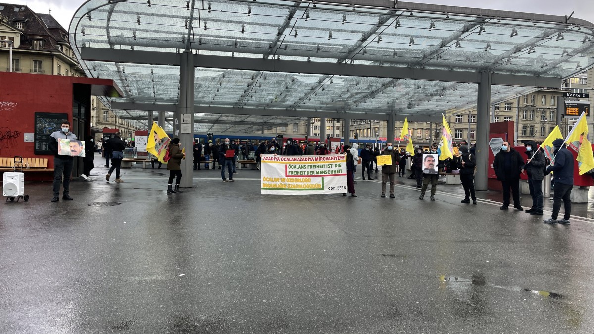 ‘Tecride, Faşizme, İşgale Son – Bi Hev Re Serhildan’ hamlesi kapsamında ve ‘acil çağrı’ ile gerçekleştirilen eylem, saat 17.30’da Bern merkez tren istasyonu önünde başladı.