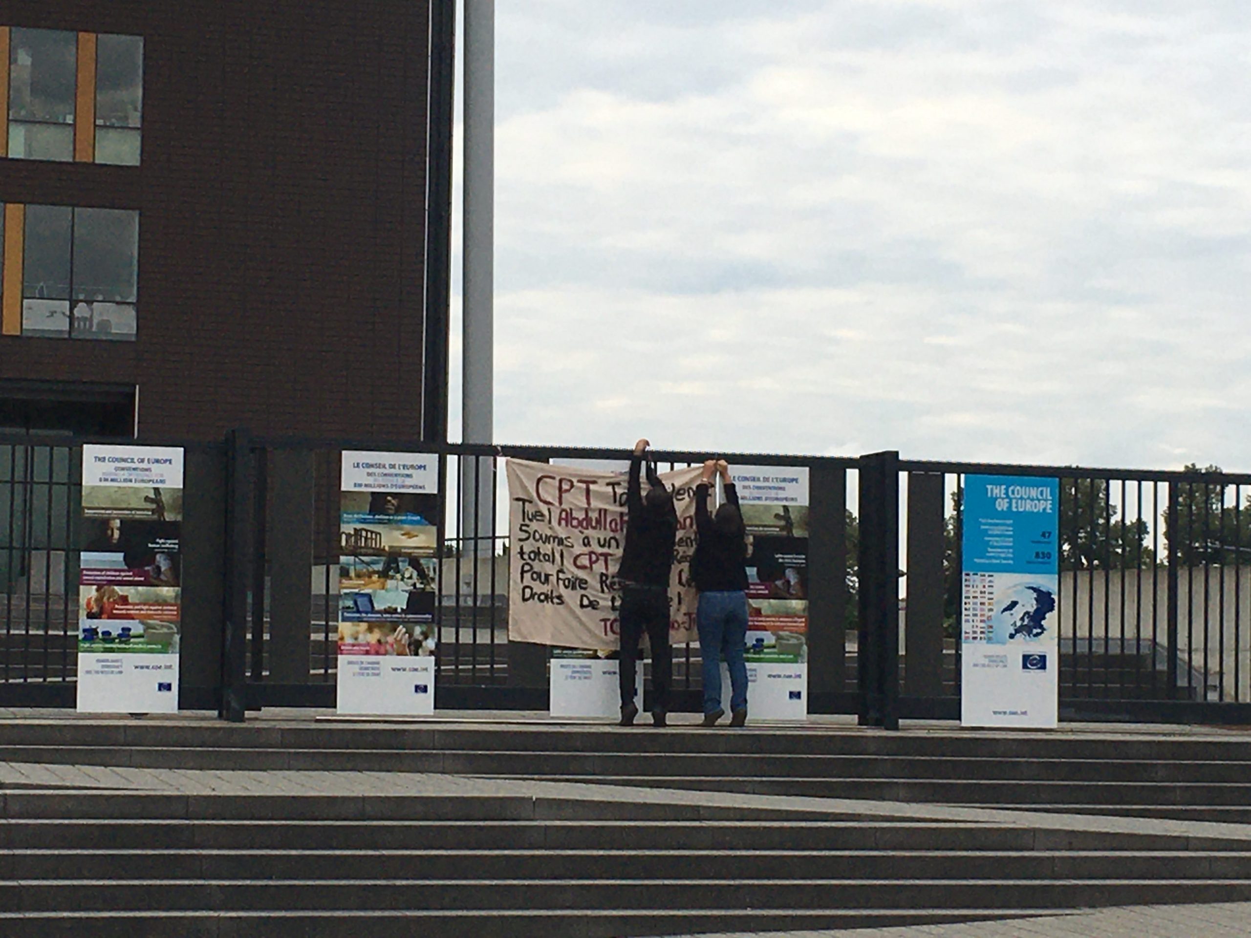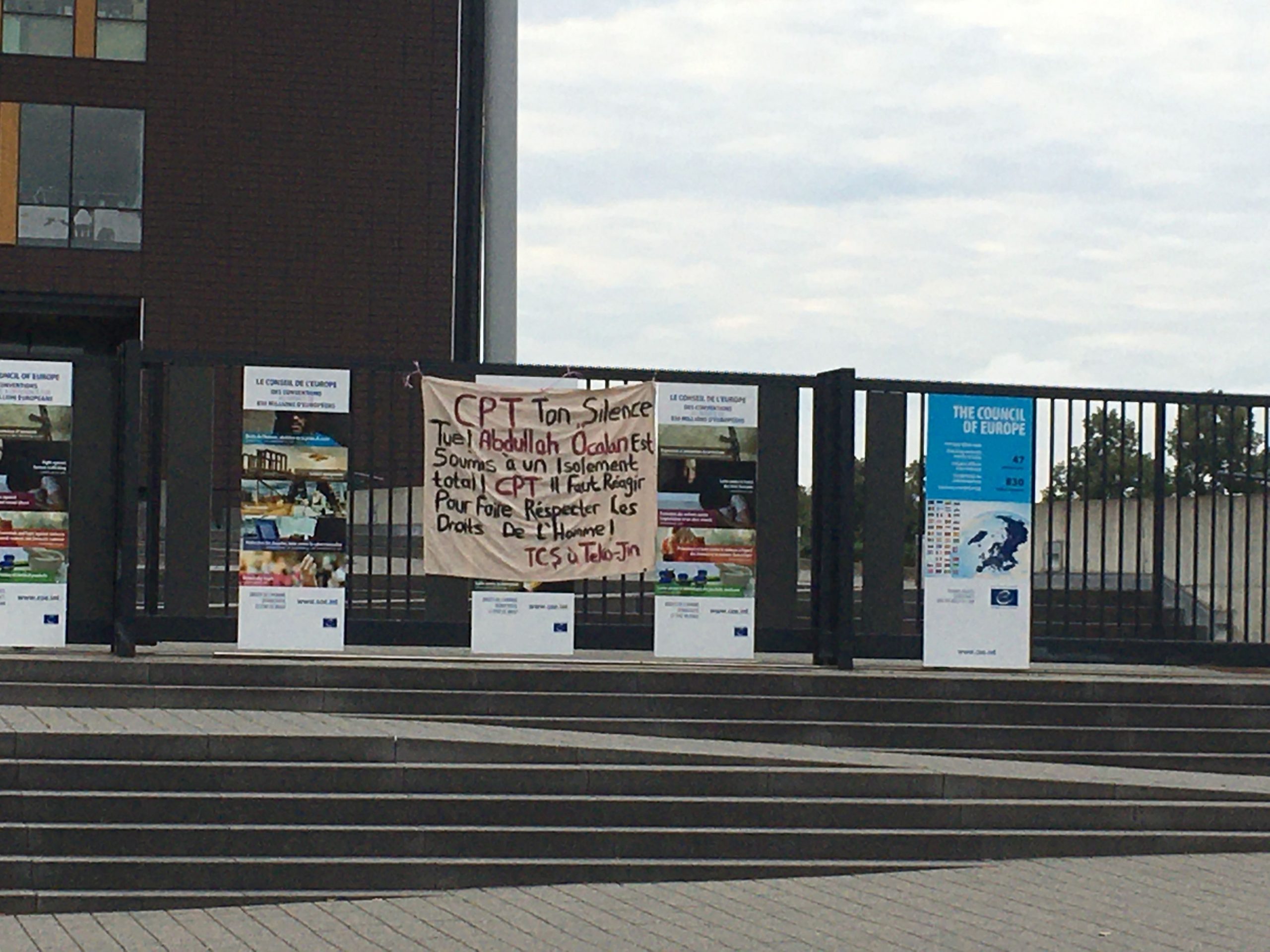 Mesai saatlerinin başladığı sırada konseyin giriş kapısına pankart asan gençler, CPT’yi harekete geçmeye çağırdı. Pankartta Fransızca, “CPT, sessizliğiniz öldürür! Abdullah Öcalan tamamen tecride maruz bırakılıyor! CPT, insan haklarına saygıyı sağlamak için tepki vermeliyiz!” yazarken, gençler ajansımıza gönderdikleri açıklamada şunları belirtti: