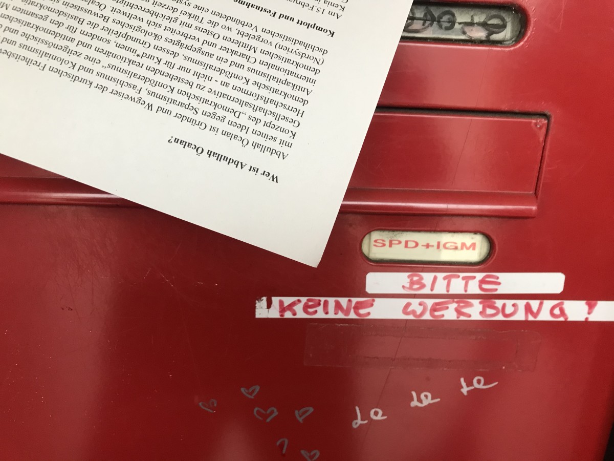 HAMBURG – 22 yıldır Önder Öcalan’a yönelik İmralı’da uygulanan ağırlaştırılmış tecrid ve sistematik işkenceye karşı Alman halkında duyarlılık yaratmak isteyen gençler, Hamburg’da 4 farklı bölgede evlerin posta kutularına hazırladıkları bildirileri bıraktılar.