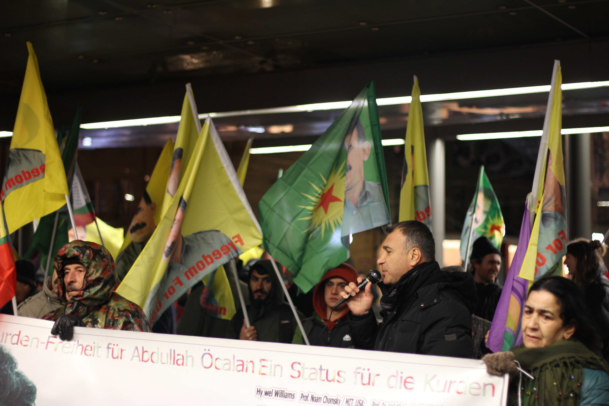 “Kürdistan’a statü, Öcalan’a özgürlük” pankartı arkasında gerçekleştirilen eylemde Halklar Önderi Öcalan posterleri taşındı. Öcalan’ın sağlığı ve yaşamından duyulan kaygılarının dile getirildiği eylemde Almanca bildiriler okundu. Kürt siyasetçi Nejdet Atalay “Sayın Öcalan’ın yaşamından endişeliyiz. Avukatlarıyla ya da bir heyet tarafından Öcalan görüştürülünceye kadar Kürdistanlılar olarak her gün kesintisiz eylemlerle alanlarda olacağız” dedi.