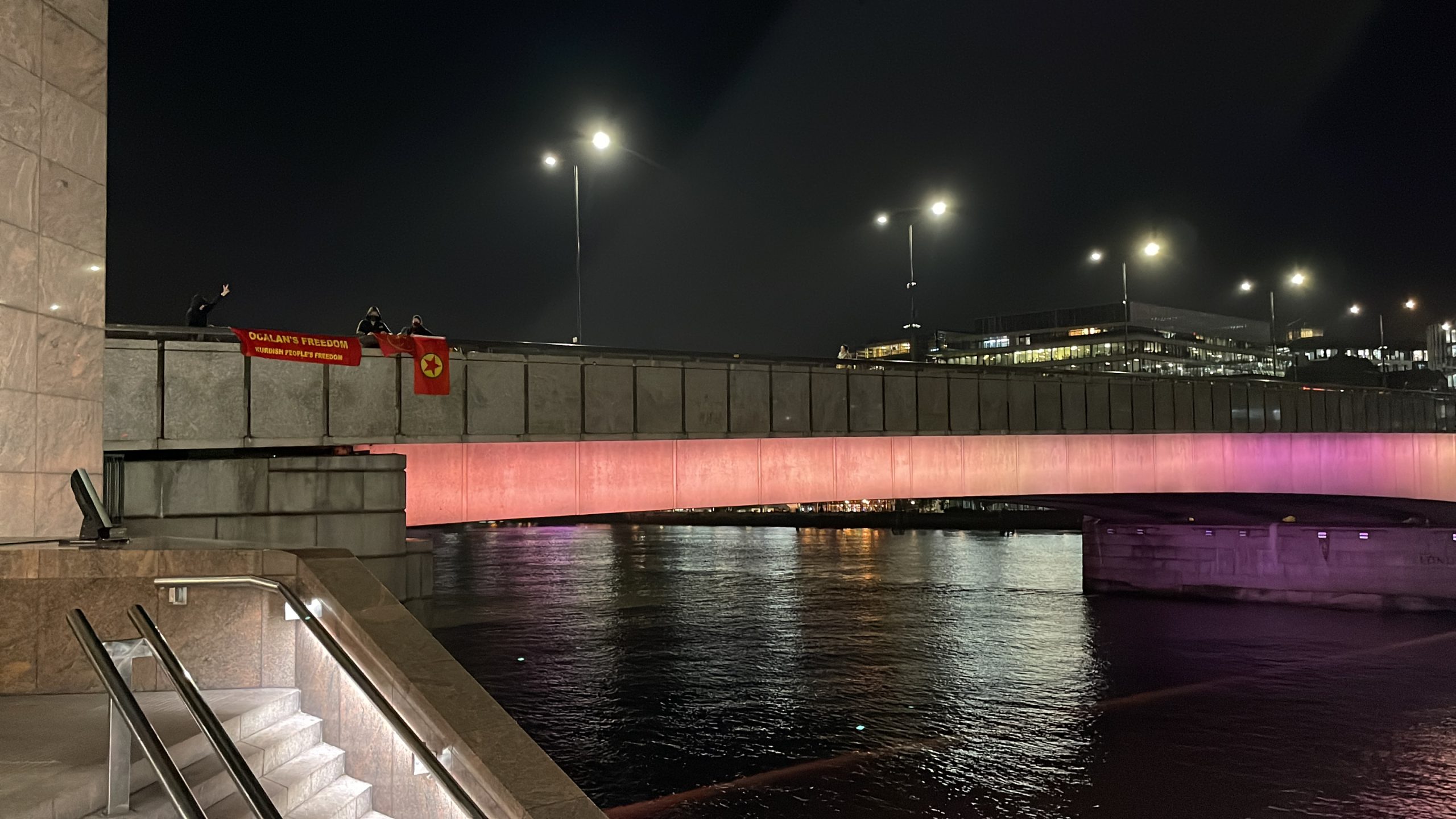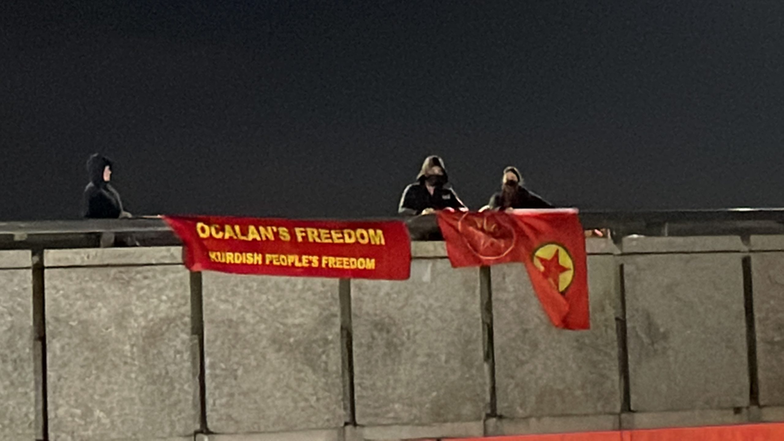 Açıklamalarını gerçekleştiren gençler, köprüye “Ocalan’s freedom Kurdish people’s freedom” (Öcalan’ın özgürlüğü Kürt halkının özgürlüğüdür) yazılı pankart asıldı.