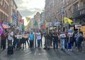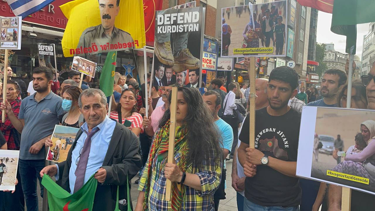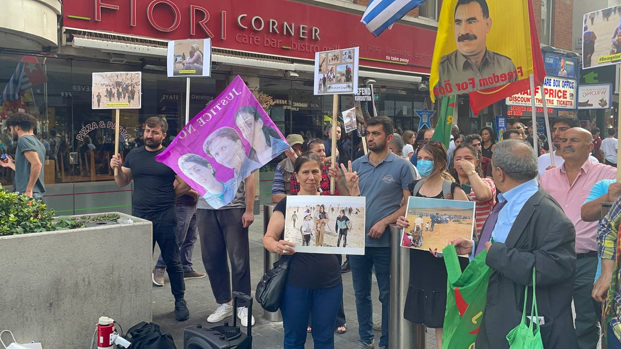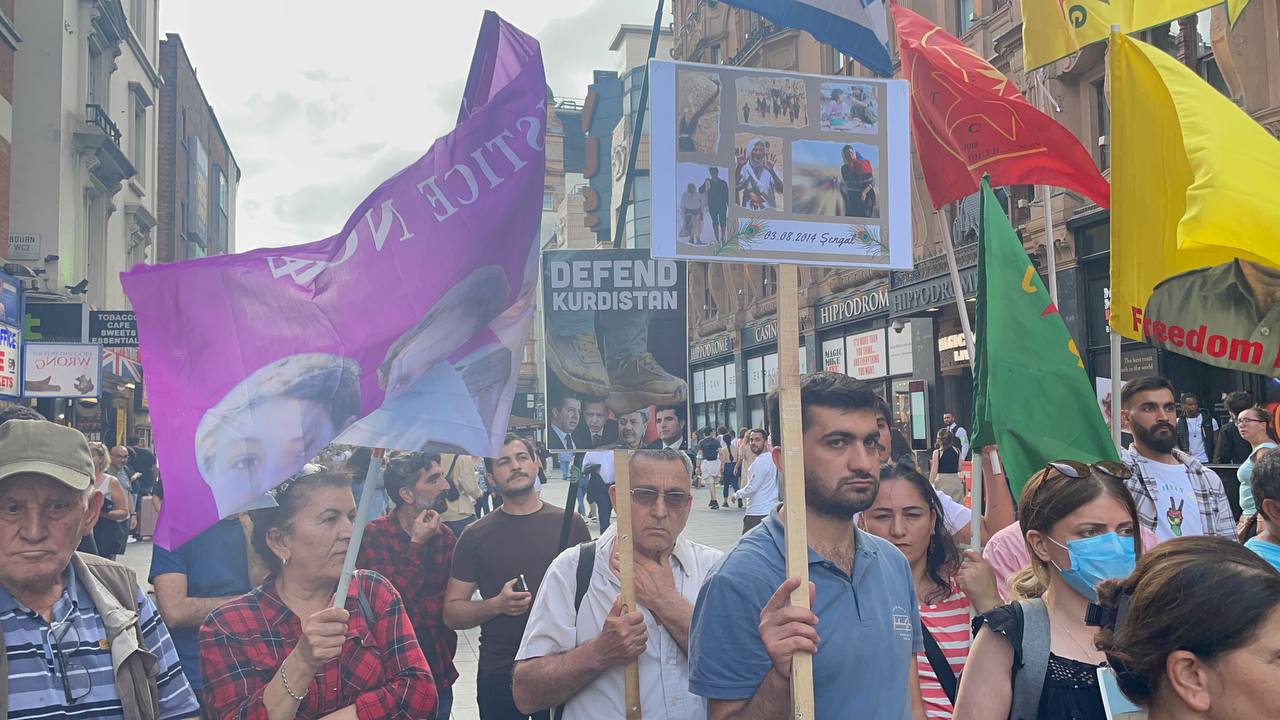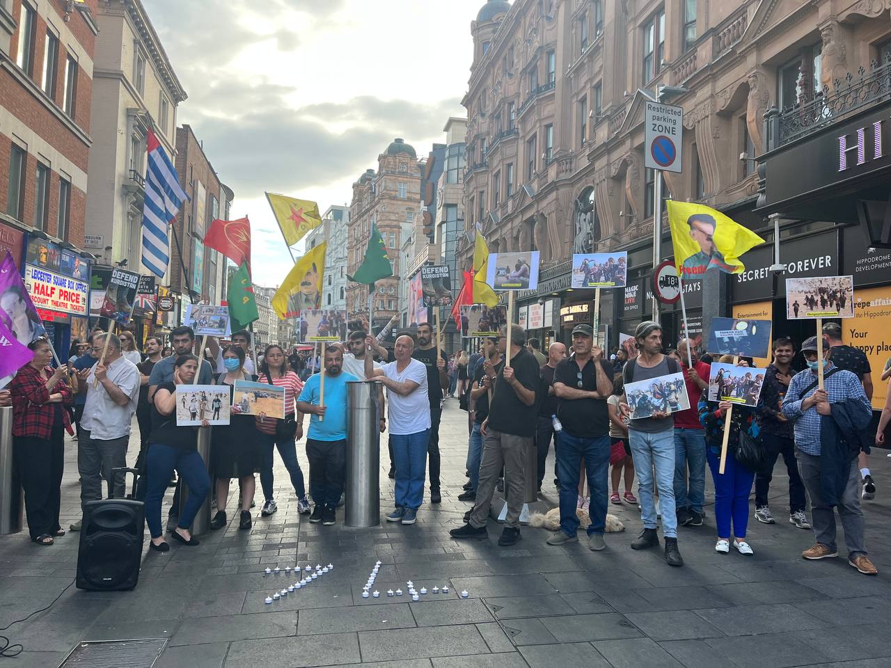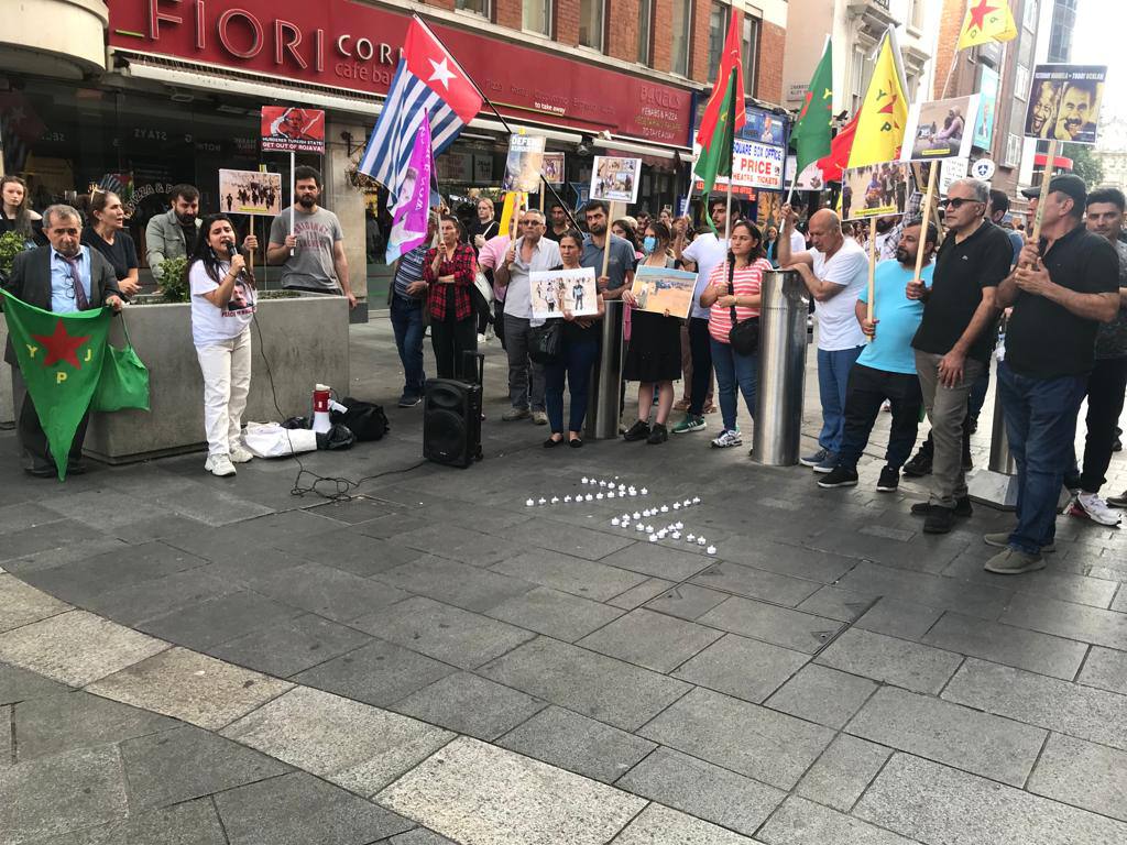 Eylemciler, PKK’nin AB, İngiltere ve ABD’nin terör örgütleri listesinden çıkarılması çağrısında bulundu ve faşist Türk devletini silah sattığı, eğittiği ve DAİŞ ile anlaşmalar yaptığı için kınadılar; Gösteri boyunca slogan olarak “Türk devleti DAİŞ, Türk devleti terörist, Türk devleti ırkçı” ve “Türkiye DAİŞ’i eğitiyor” sloganları atıldı.