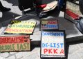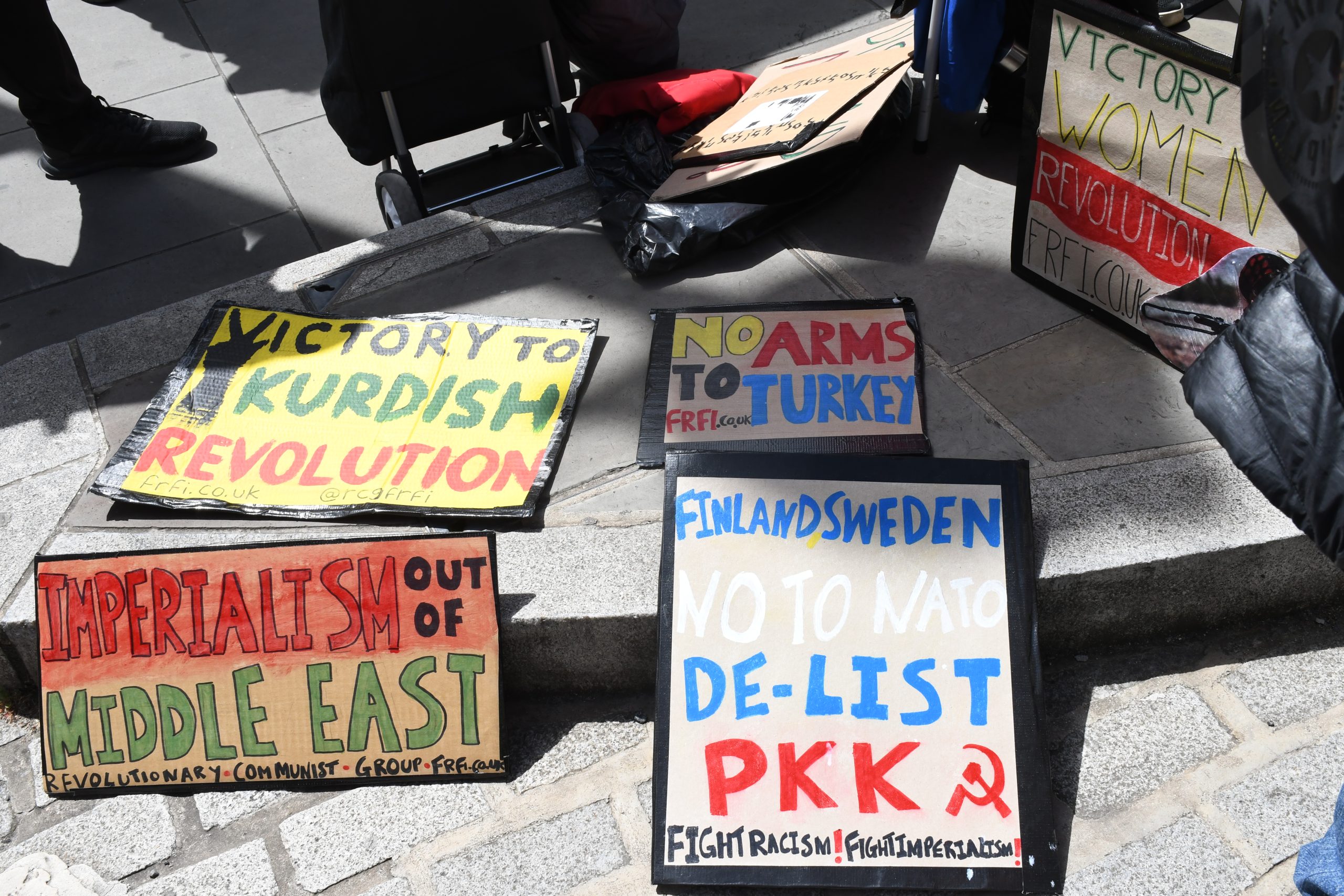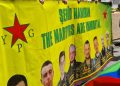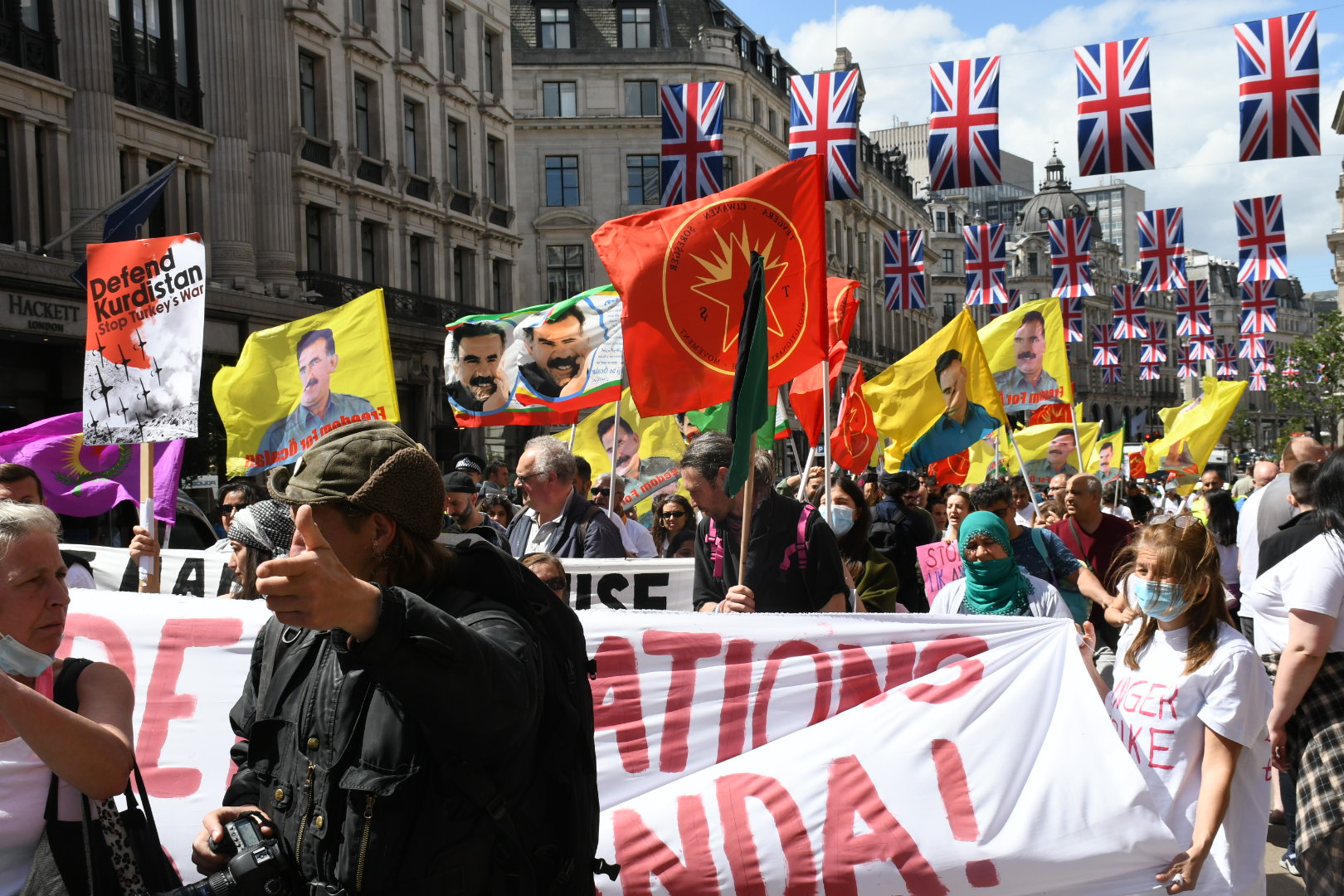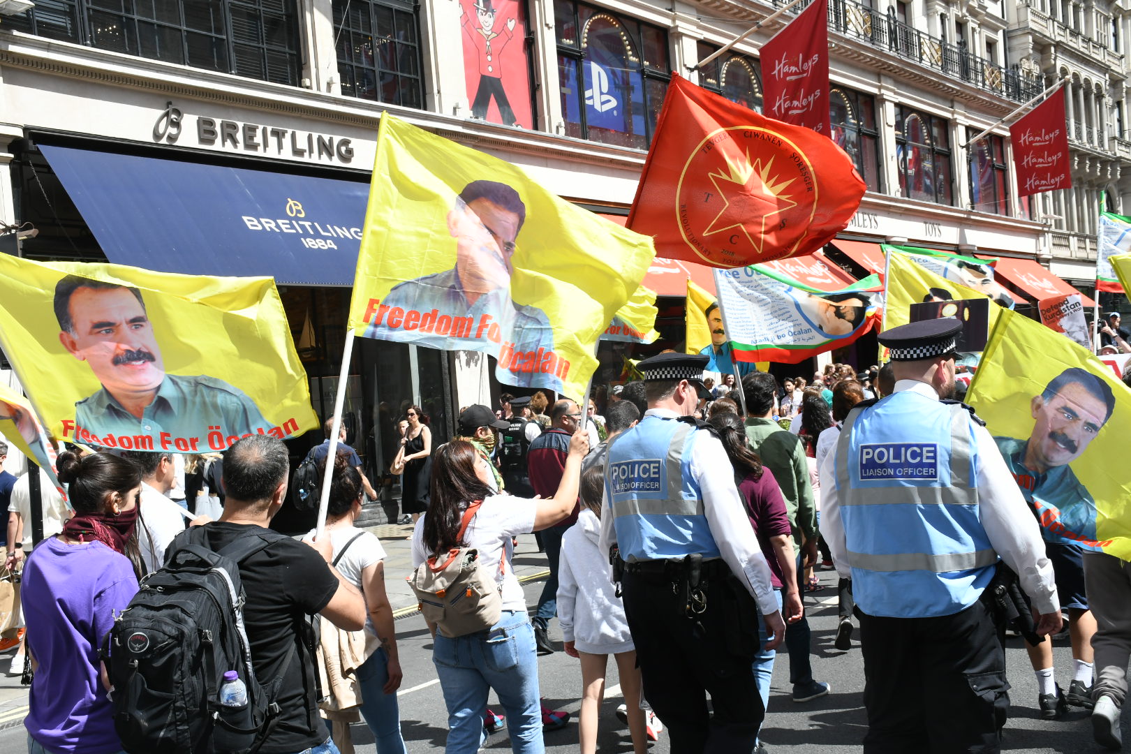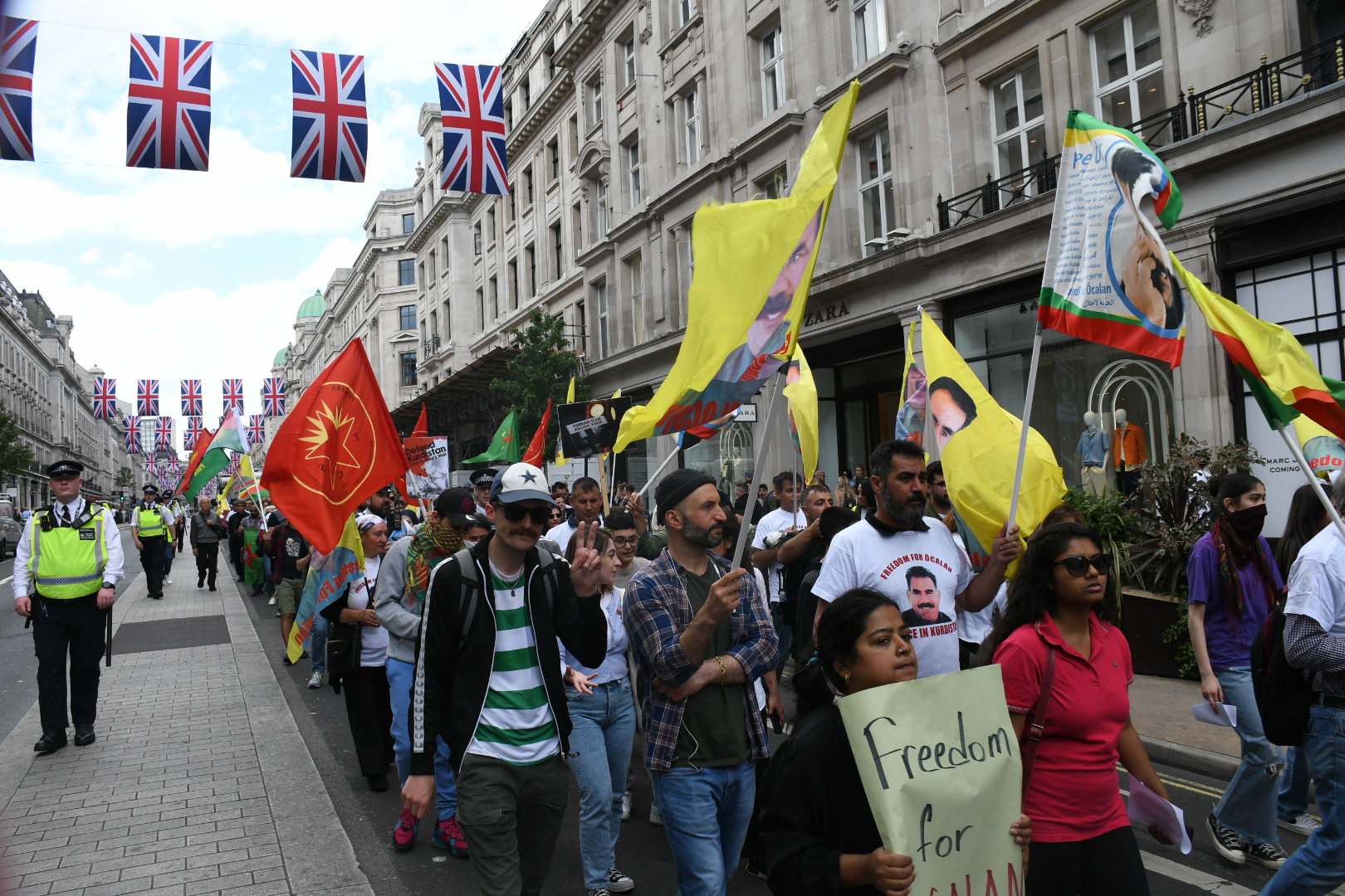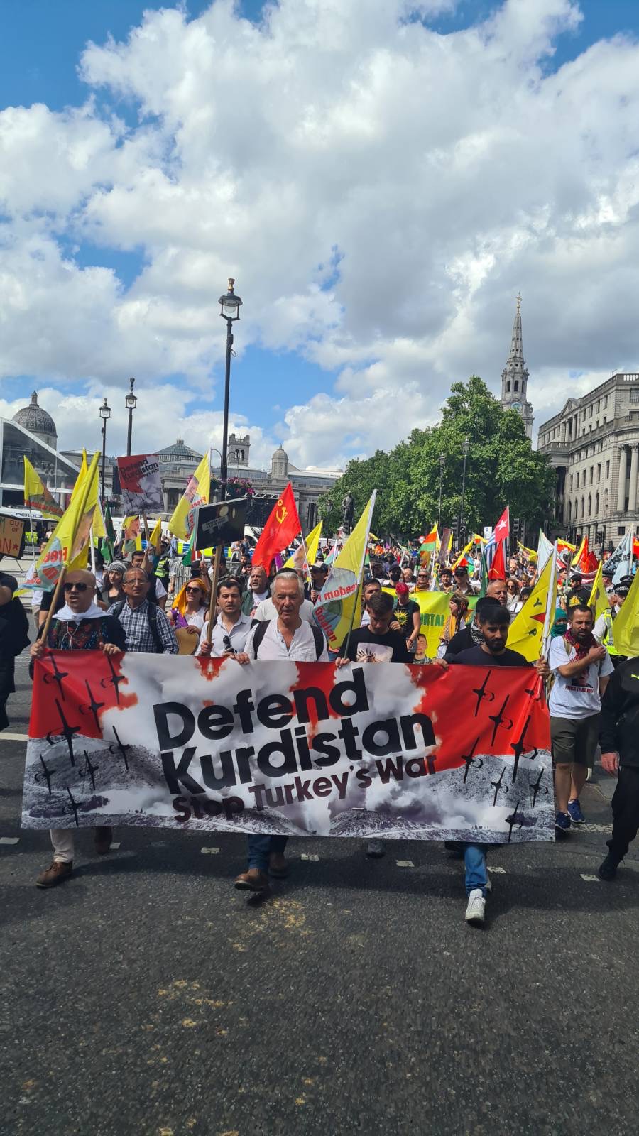 Eylemde “Defend Kurdistan, Stop Turkey’s War on Kurds” pankartları, YJA-STAR, YPG, YPJ, Rojava, Freedom for Öcalan flamaları taşındı.
