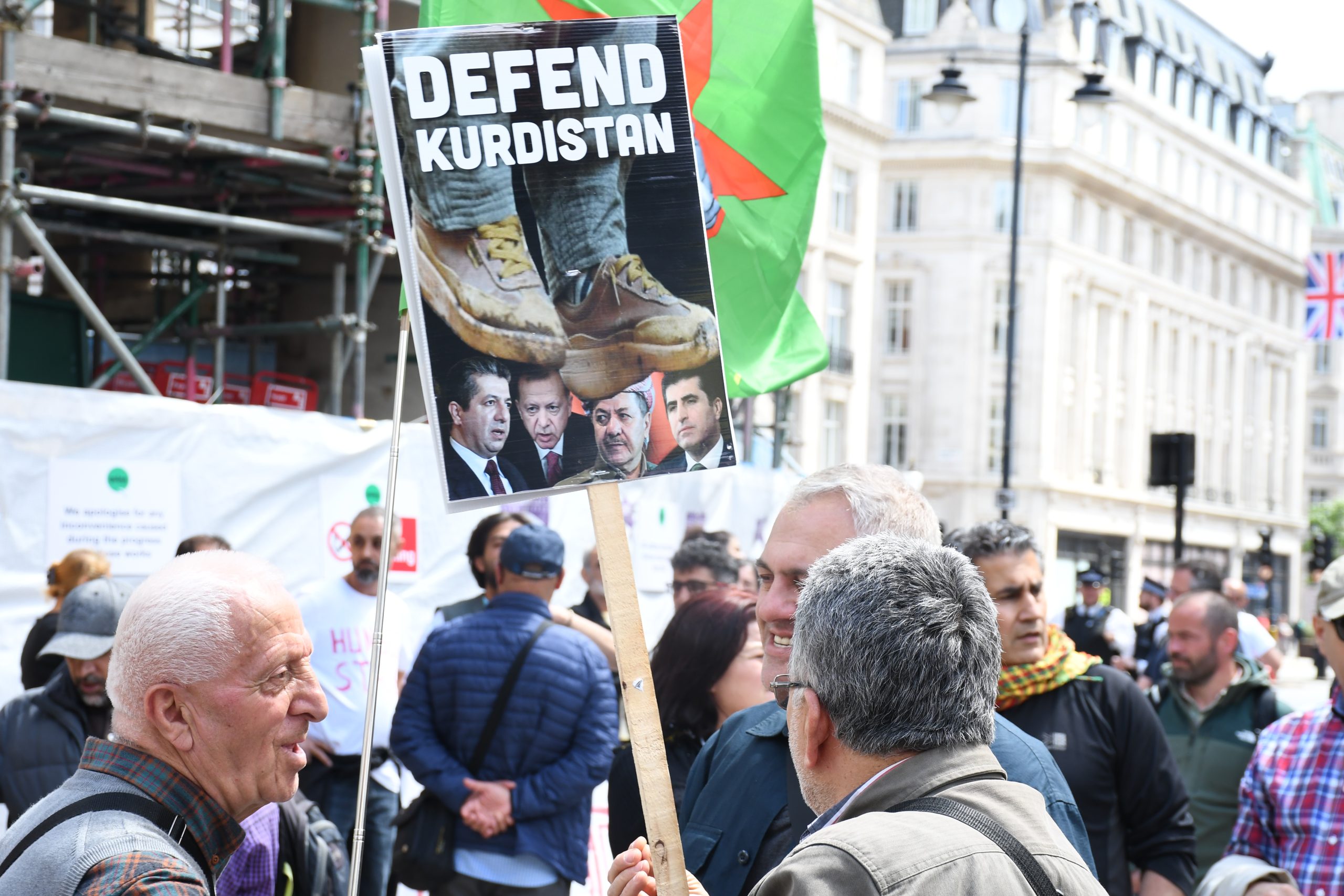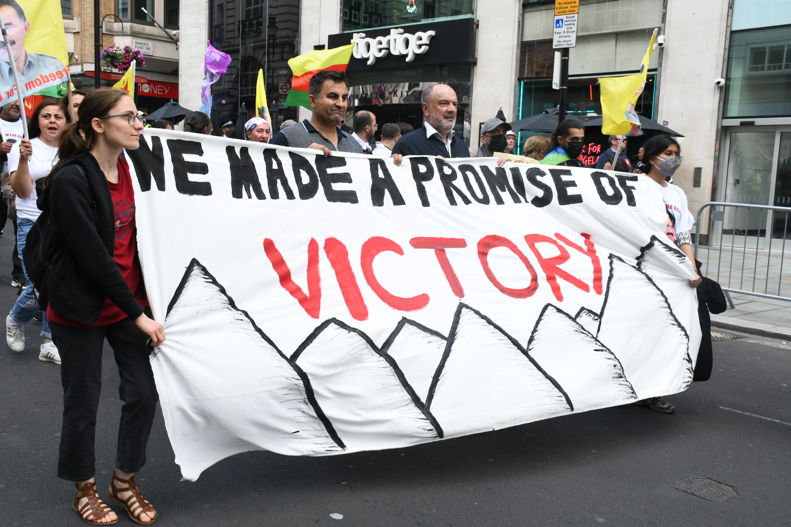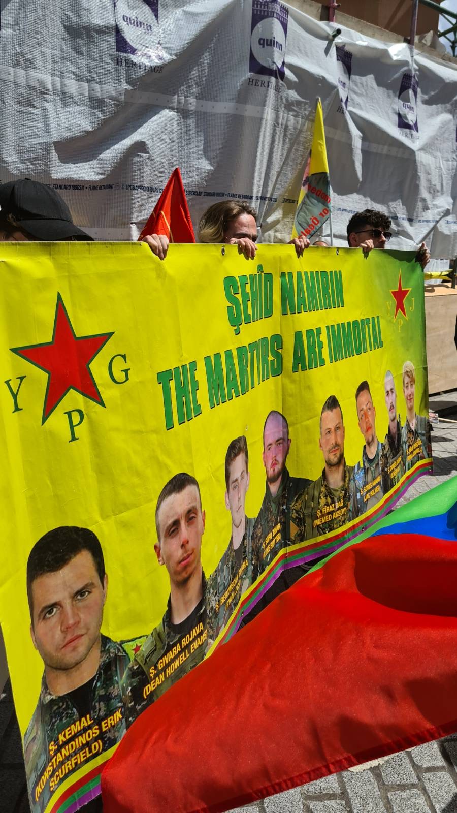Ayrıca Britanya Kürt Halk Meclisi adına Elif Sarıcan, Freedom for Öcalan kampanyasının öncülerinden Unite the Union International sendikasından Simon Dubbins, ve Britanya’lı YPJ şehidi Anna Campbell’in babası Dirk Campbell işgal ve ihanete karşı vurgular yaptı.