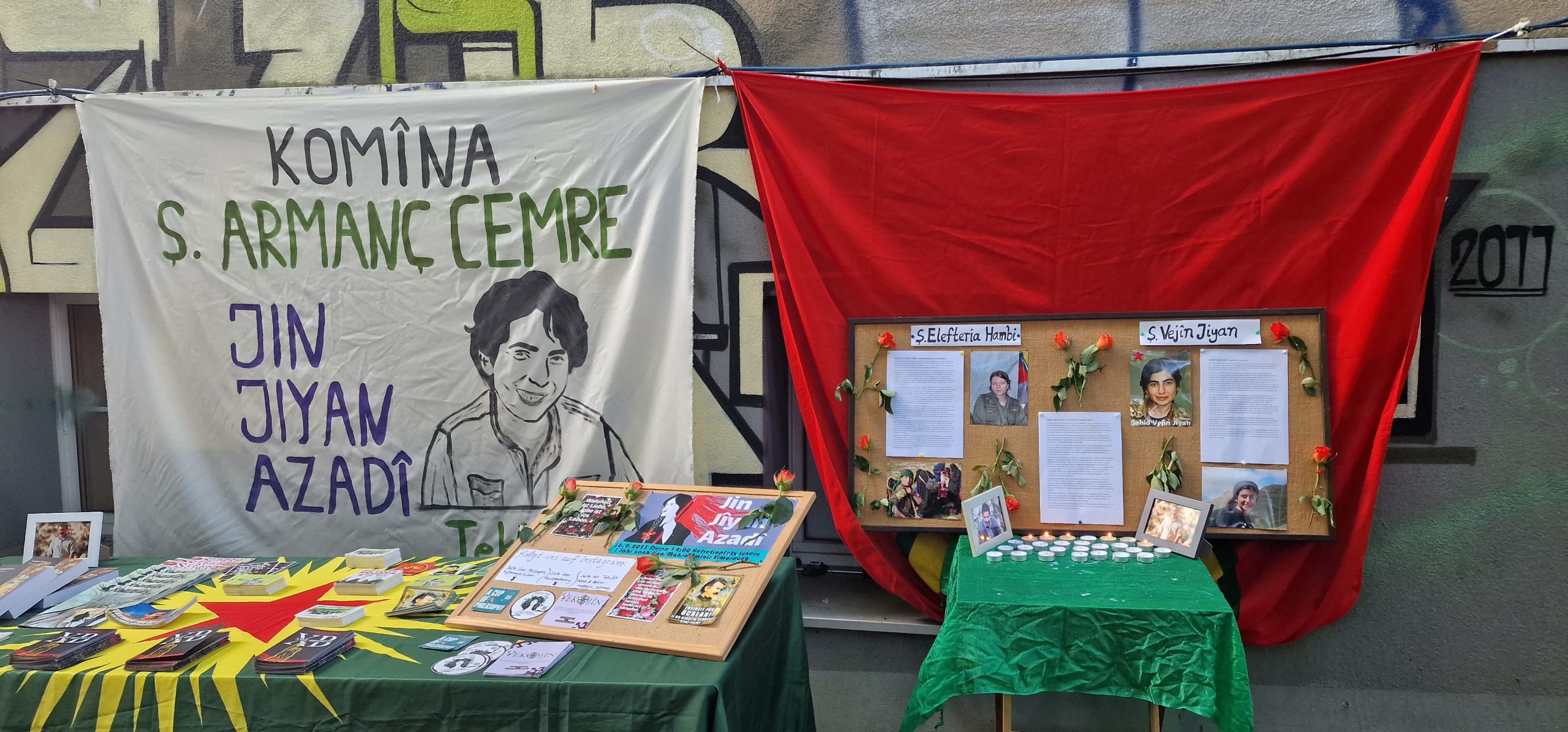 Etkinlikte Rojava’da şehit olan Ş.Vejin Jiyan ve Ş.Elefteria Hambi’nin yaşamları, nasıl yaşadıkları, mücadele ile nasıl tanıştıkları ve Önderliğin ideolojisini nasıl yaşamsallaştırıp Özgür yaşamın fedaileri olduğunu anlatan konuşma gerçekleşti.