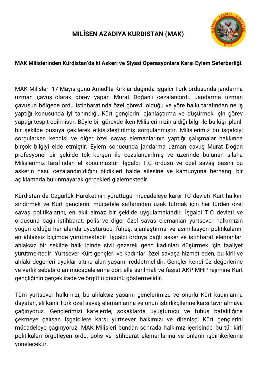HABER MERKEZİ- MAK (Milîsên Azadiyê Kurdîstan) yayınladığı yazılı bir açıklama ile 17 Mayıs günü İşgalci uzman çavuş Murat Doğanın MAK Milisleri tarafından Amed’te cezalandırıldığı eylemin detaylarını açıkladı.