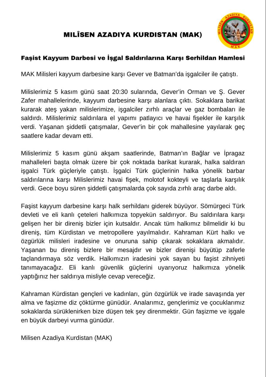 Milislerimiz 5 kasım günü akşam saatlerinde, Batman’ın Bağlar ve İpragaz mahalleleri başta olmak üzere bir çok noktada barikat kurarak, halka saldıran işgalci Türk güçleriyle çatıştı. İşgalci Türk güçlerinin halka yönelik barbar saldırılarına karşı Milislerimiz havai fişek, molotof kokteyli ve taşlarla karşılık verdi. Gece boyu süren şiddetli çatışmalarda çok sayıda zırhlı araç darbe aldı. “