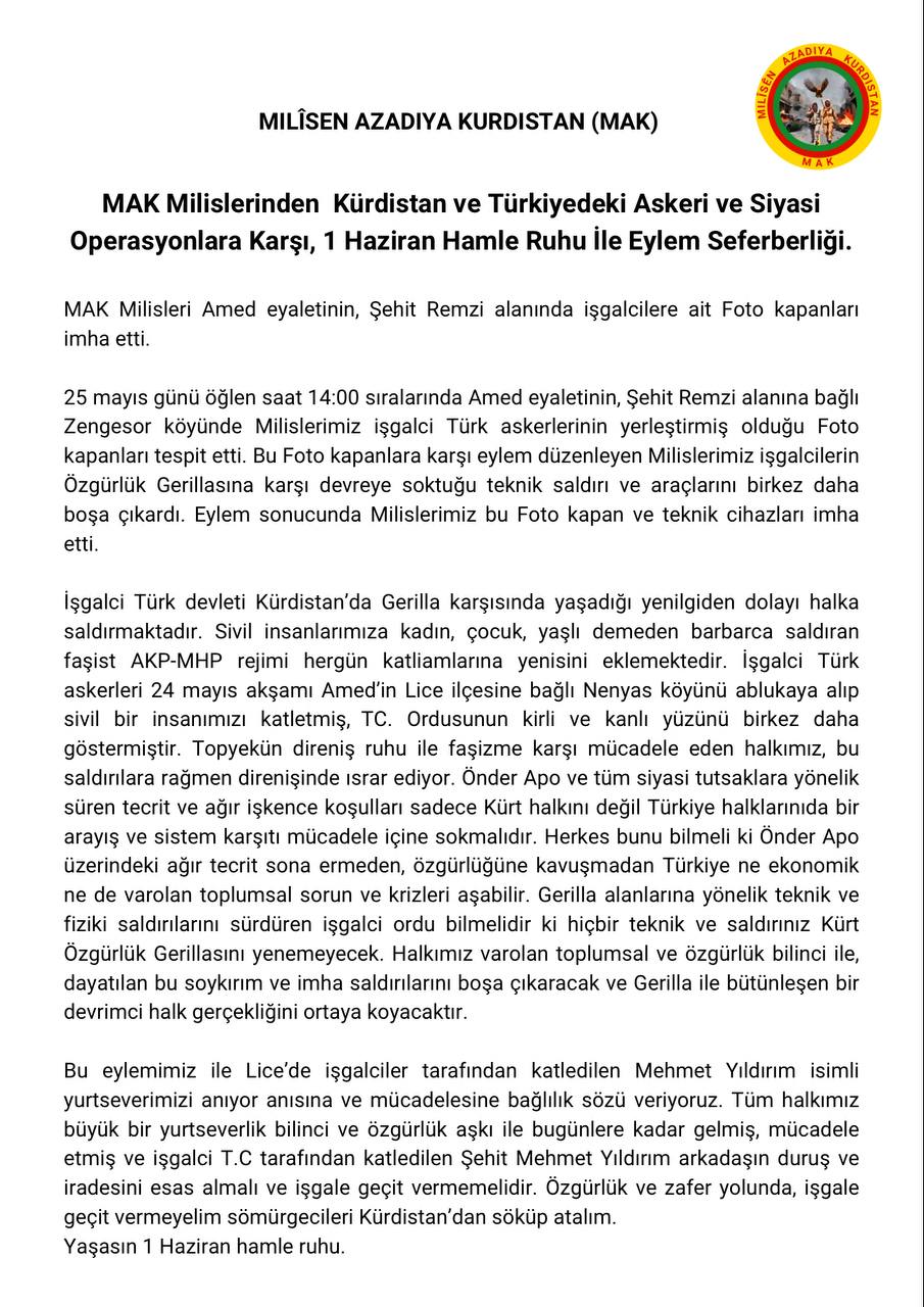 HABER MERKEZİ- MAK (Milîsên Azadiyê Kurdîstan) yayınladığı yazılı bir  açıklama ile 25 mayıs günü Amed Şehit Remzi alanı, Zengesor köyünde işgalci güçlere ait fotokapanları imha ettiklerini açıkladı.