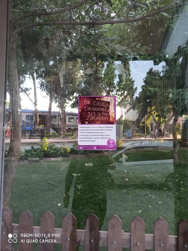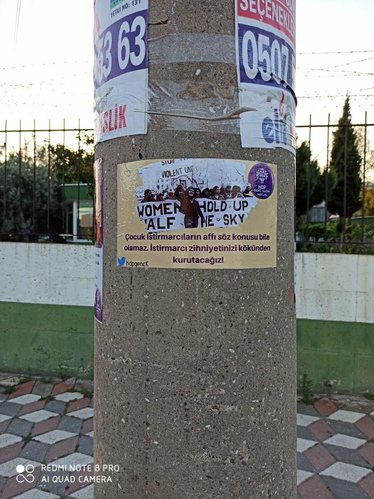 Genç Kadınlar sokak ve caddelere, ‘bir çocuğun çıkaramadığı ses olmak zorundasın’, ‘çocuğa karşı işlenen suç af edilemez’, ‘kadın katliamlarına karşı hiçbir önlem alamayan iktidar şiddete teşvik edecek yasalar çıkarmaya devam ediyor’ yazılı stickerları yapıştırdılar.