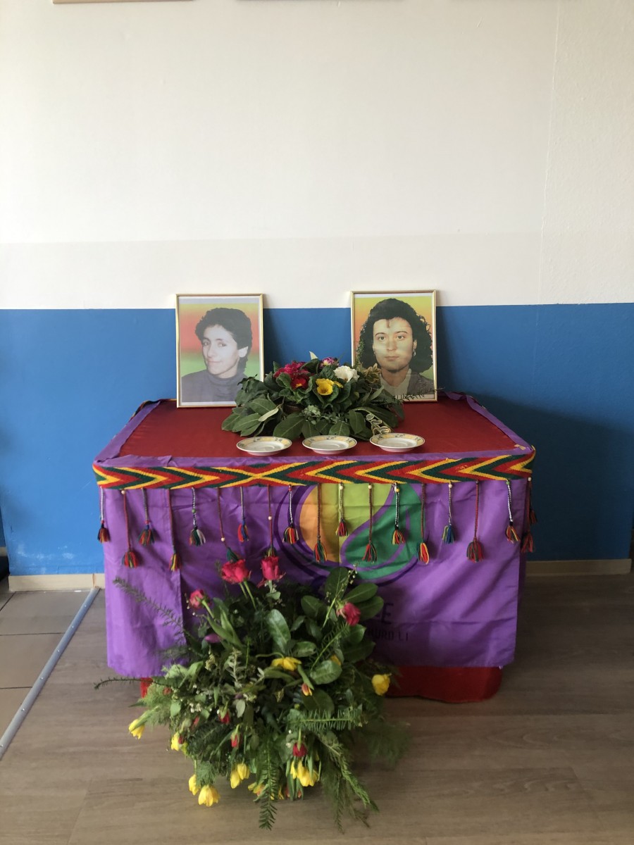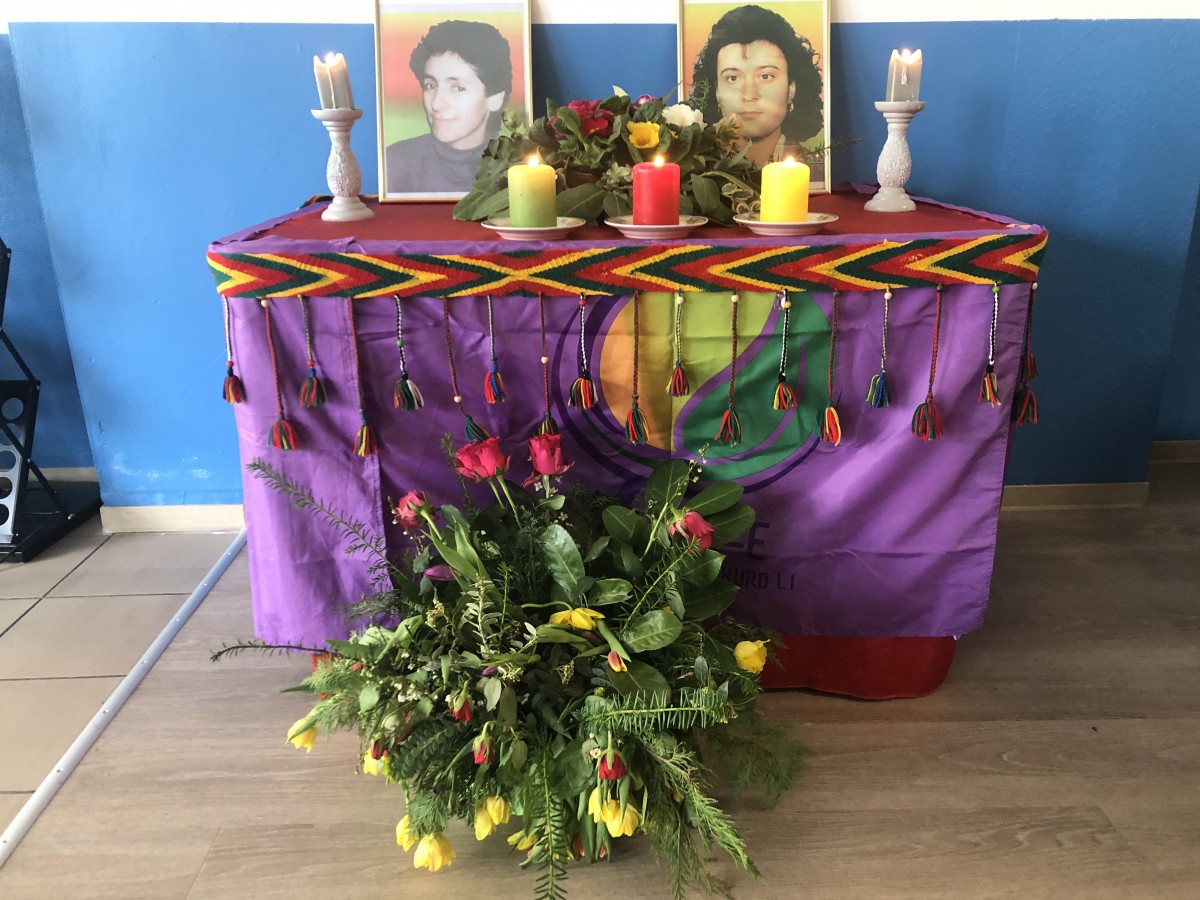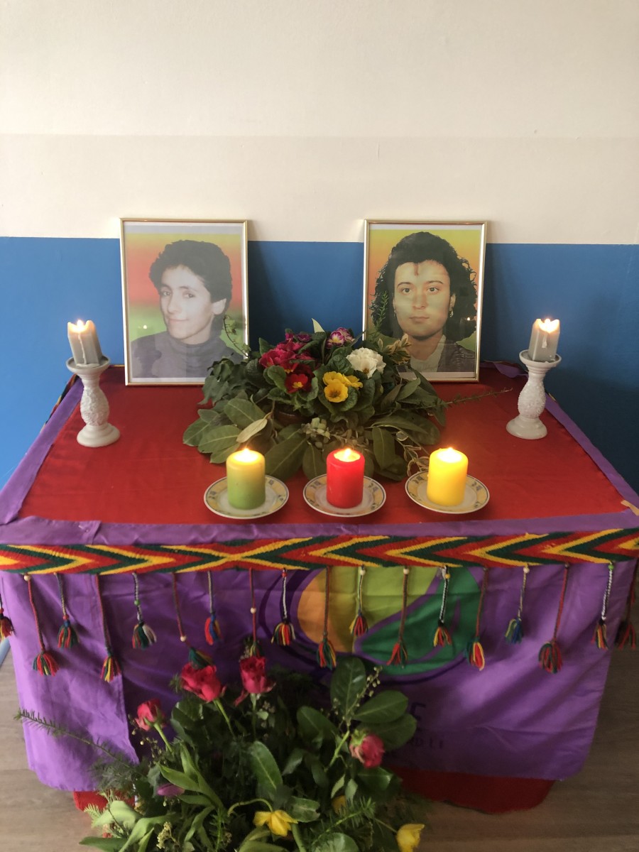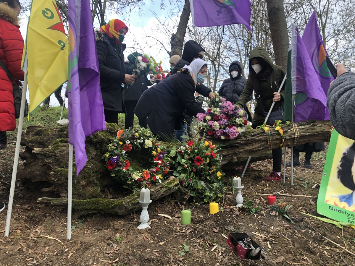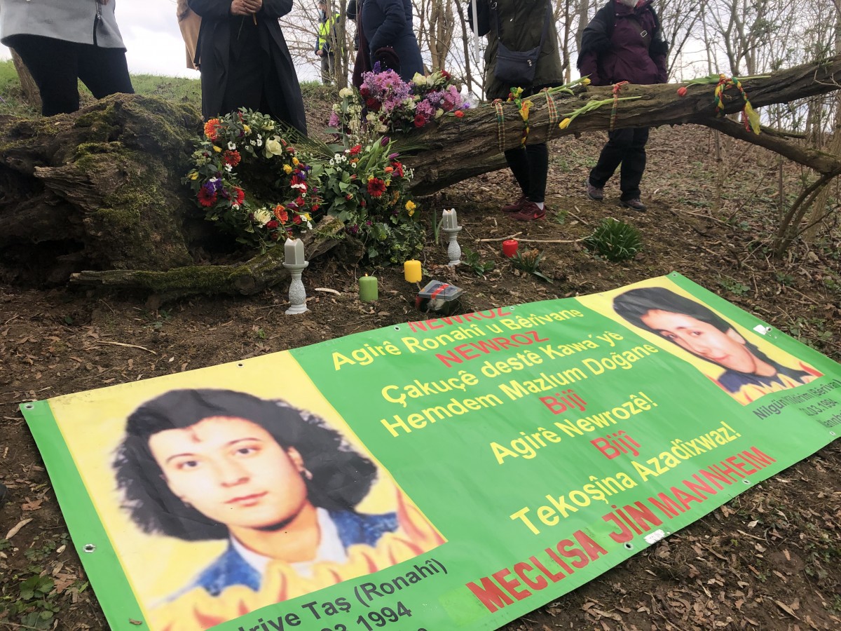 “Bijî Serok APO” sloganlarıyla ve taşıdıkları „Özgürlük kolay olsaydı, Ronahî ve Berîvan kendini yakmazdı“ pankartıyla bedenlerini ateşe verdikleri suya güller attılar.