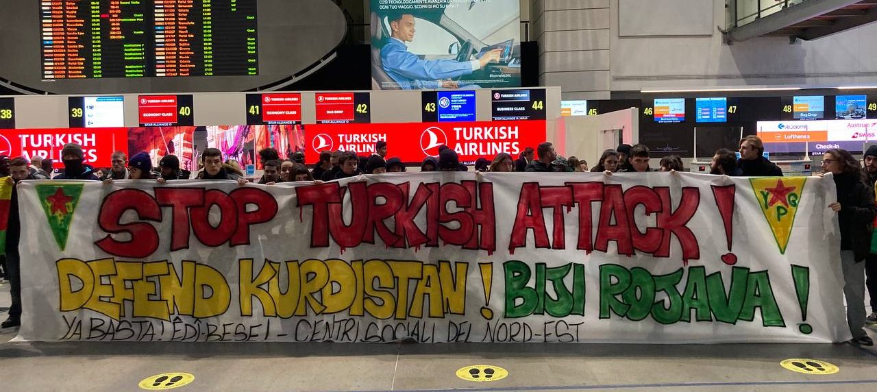 Bu sabah bir grup İtalyan aktivist işgalci Türk devletini protesto etmek ve Rojava halkıyla dayanışmak için Venedik Marco Polo Uluslararası Havalimanı'ndaki Türk Hava Yolları check-in kontuarında eylem gerçekleştirdi.