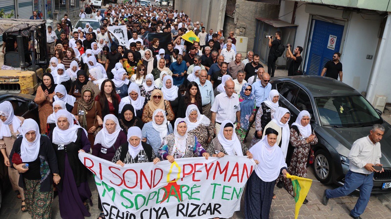 Gençler öncülüğünde taziyeye kitlesel bir yürüyüşle ziyaret gerçekleştirildi. Medeniyetler Beşiğinde Yakınlarını Kaybeden Ailelerle Yardımlaşma ve Dayanışma Derneği (MEBYA-DER) yöneticileri ile çok sayıda siyasetçi de taziyeye katıldı. Narin Yaşam Parkı’nda bir araya gelen kitle, taziyenin kurulduğu Poyraz Mahallesi Taziye Evi’ne kadar yürüdü. Yürüyüşe katılanlar, yakalarına Şehit Çiya Rizgar’ın fotoğraflarını taktı. Yürüyüş boyunca “Dağlarda arama Apocular her yerde”, “Savaşta barışta seninleyiz Öcalan”, “Şehîd namirin” ve “Bê Serok jiyan nabe” sloganları atıldı. Ayrıca “Bi sond û peyman em şopdare te ne” yazılı pankart ile Önder APO’nun, Hüseyin Akdoğan (Armanc Kerboran) ve Şehit Çiya Rizgar’ın fotoğrafları, ve Komalên Ciwan- Komalên Jinên Ciwan bayrakları taşındı.