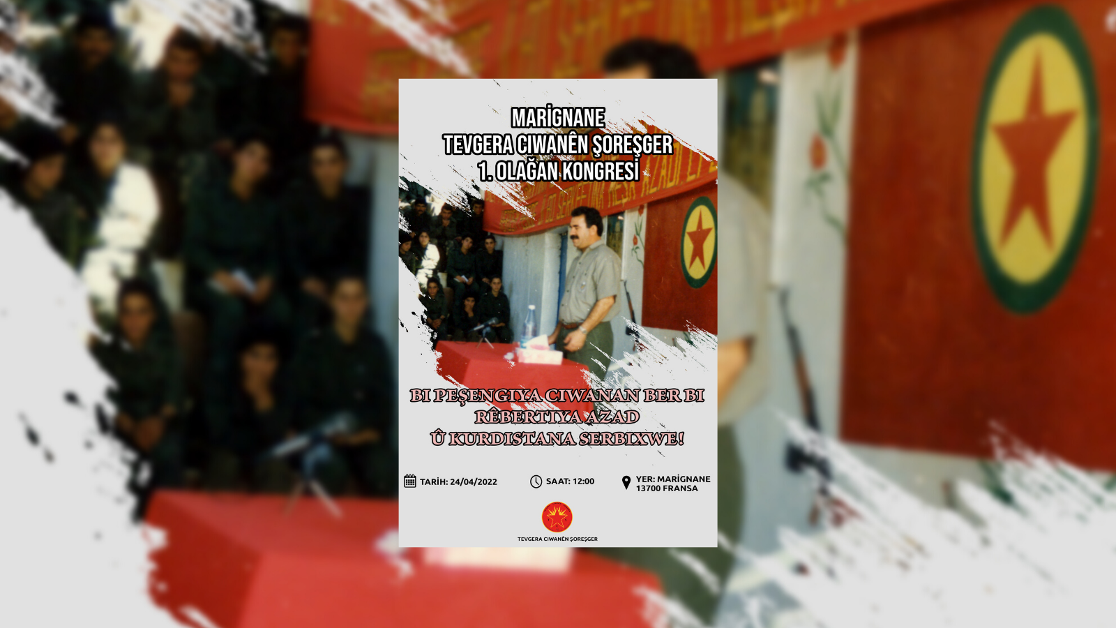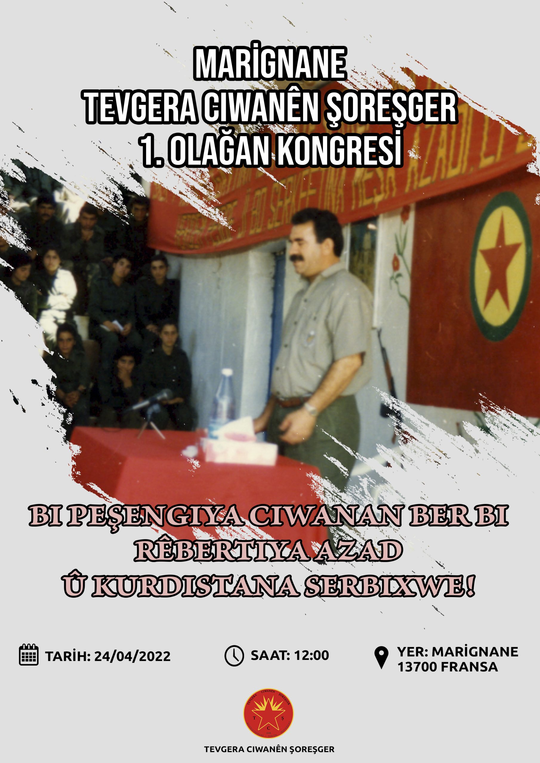 HABER MERKEZİ – Marignane Tevgera Ciwanen Şoreşger (TCŞ) aktivistleri, “Bi peşengiya ciwanan ber bi Rêbertiya azad û Kurdistana serbixwe!” şiarı ile “Werin Cenga Azadiyê” hamlesi kapsamında gerçekleştirecekleri 1. TCŞ Olağan Kongrelerine ilişkin bir çağrıda bulundu.