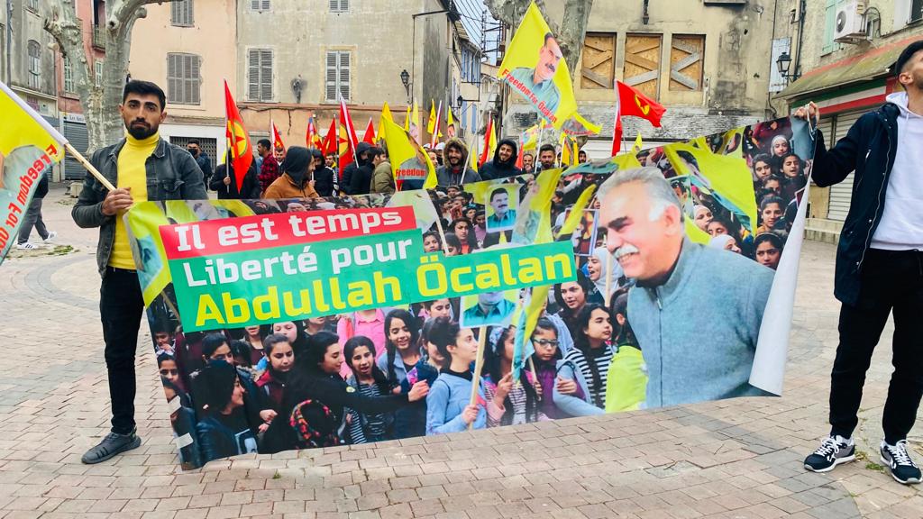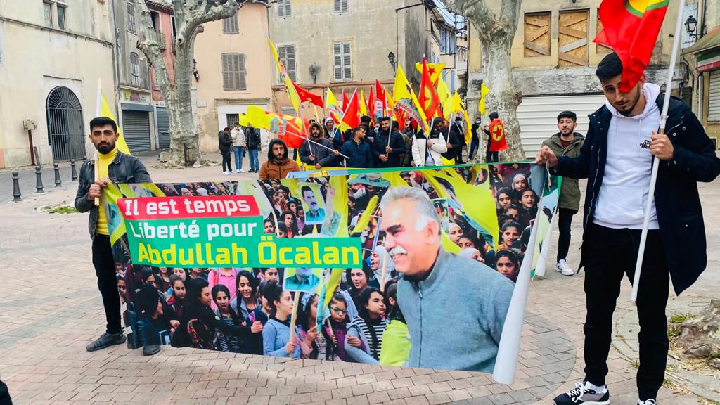 Gençlerin yoğun katıldığı eylemde sık sık “Bijî Serok APO”, “Libere Öcalan”, “Terorist Erdogan” ve “A bas le régime fasciste en Turquie (Kahrolsun Faşist Türk Rejimi)” sloganları atıldı.