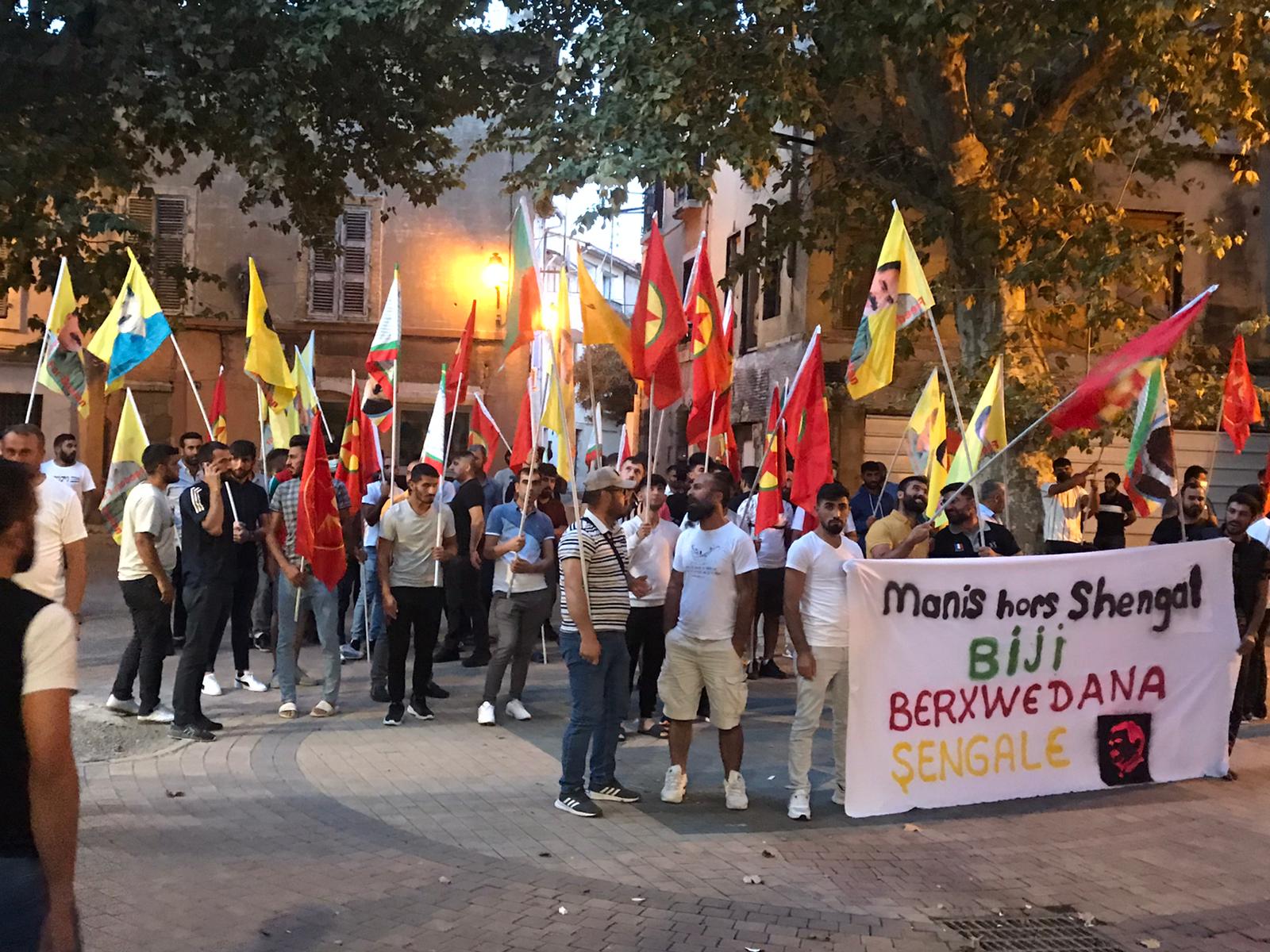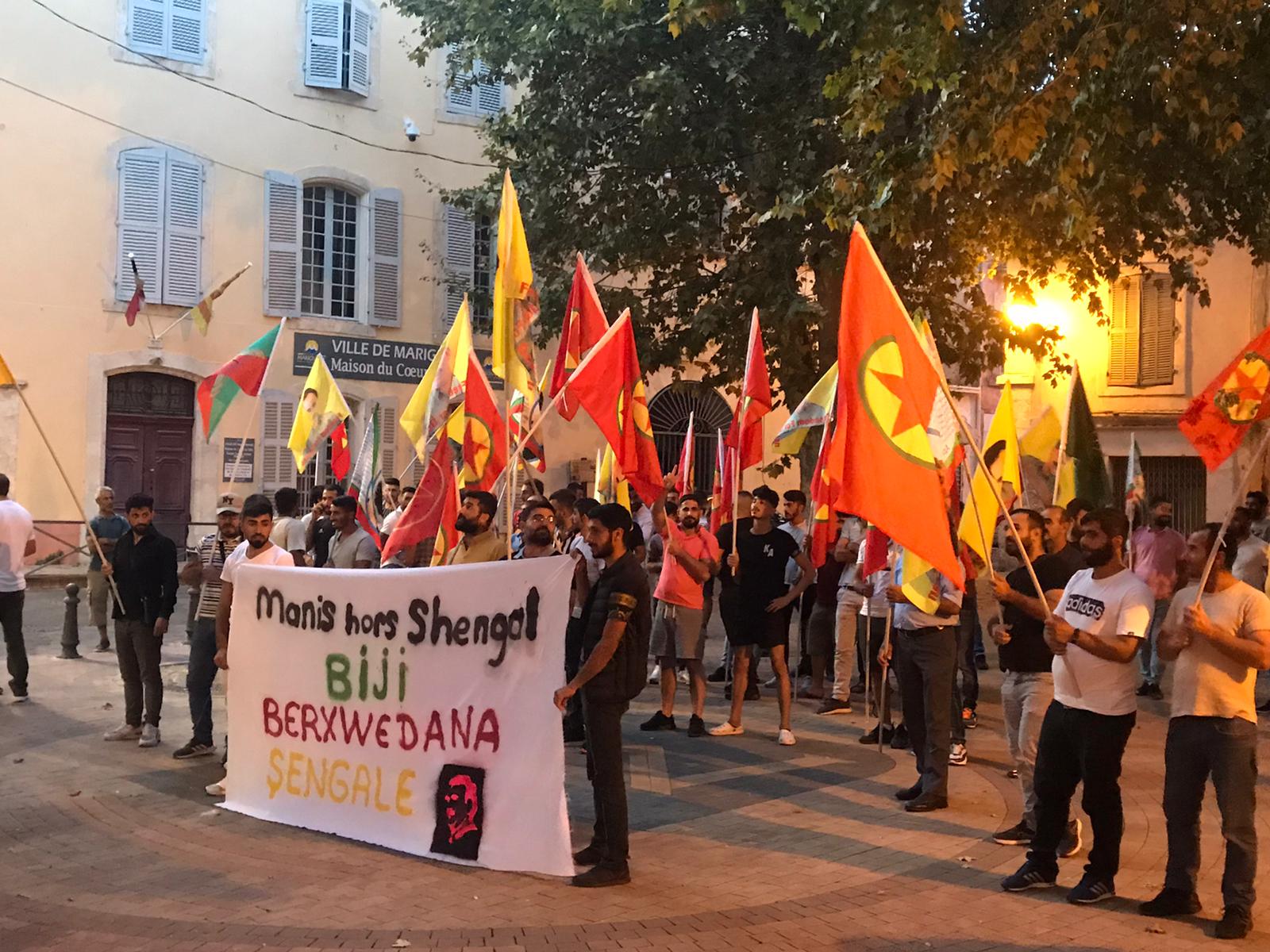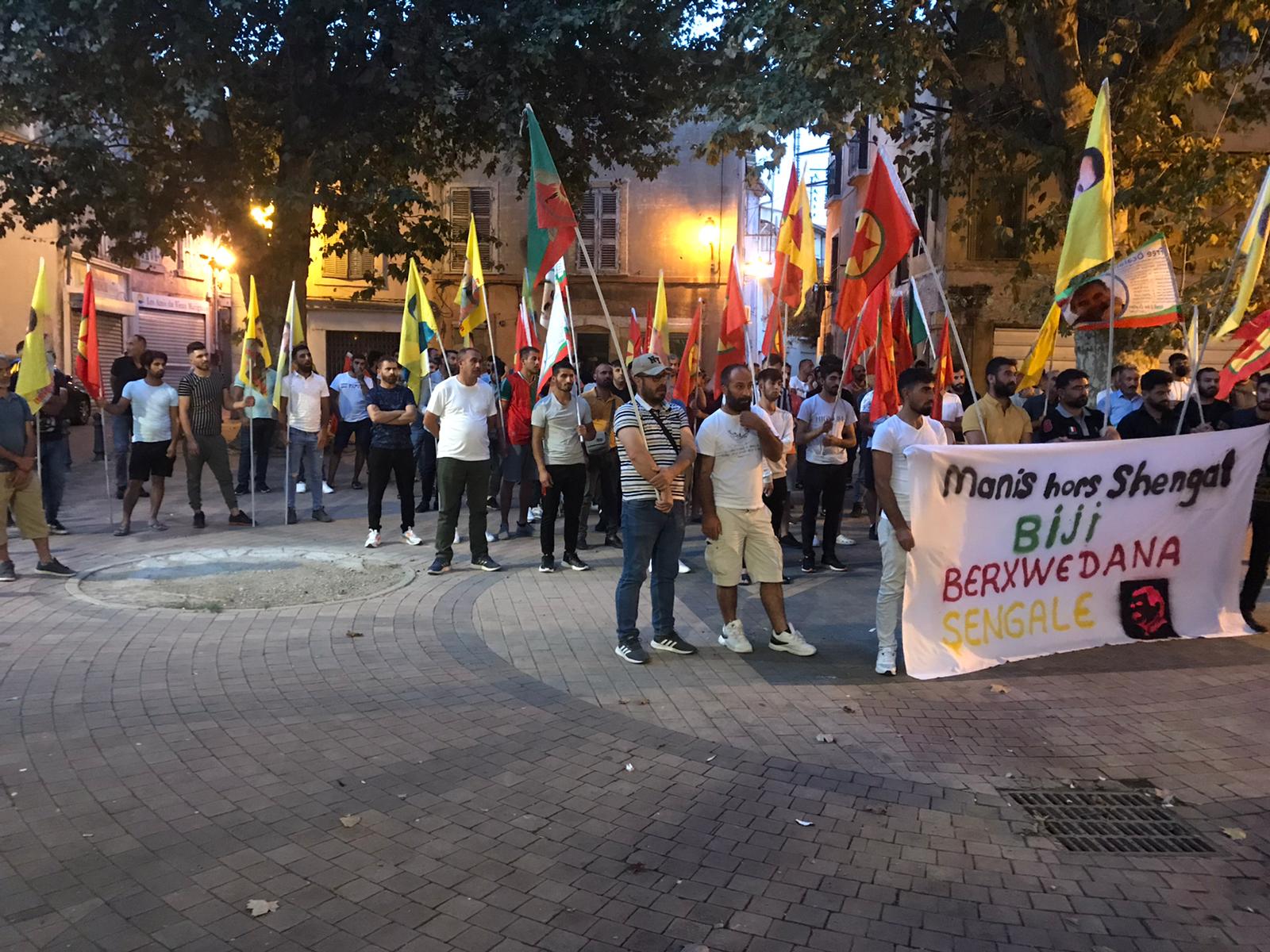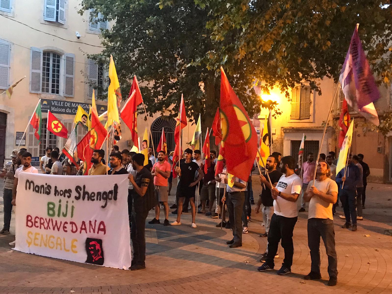 MARİGNANE – Akşam saatlerinde bir araya gelen Kürdistanlılar, Kürdistan Devrim Şehitleri anısına bir dakikalık saygı duruşunun ardından eylemlerine başladılar.