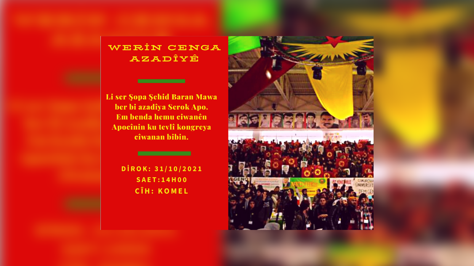 Siz değerli gençleri 31 Ekim Pazar günü Marsilya Kürt Kültür Merkezinde yapacağımız 1.TCŞ Meclis Kongremize davet ediyoruz. Bu süreçte hep beraber mücadeleyi sürdürmek istiyoruz.