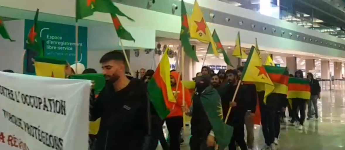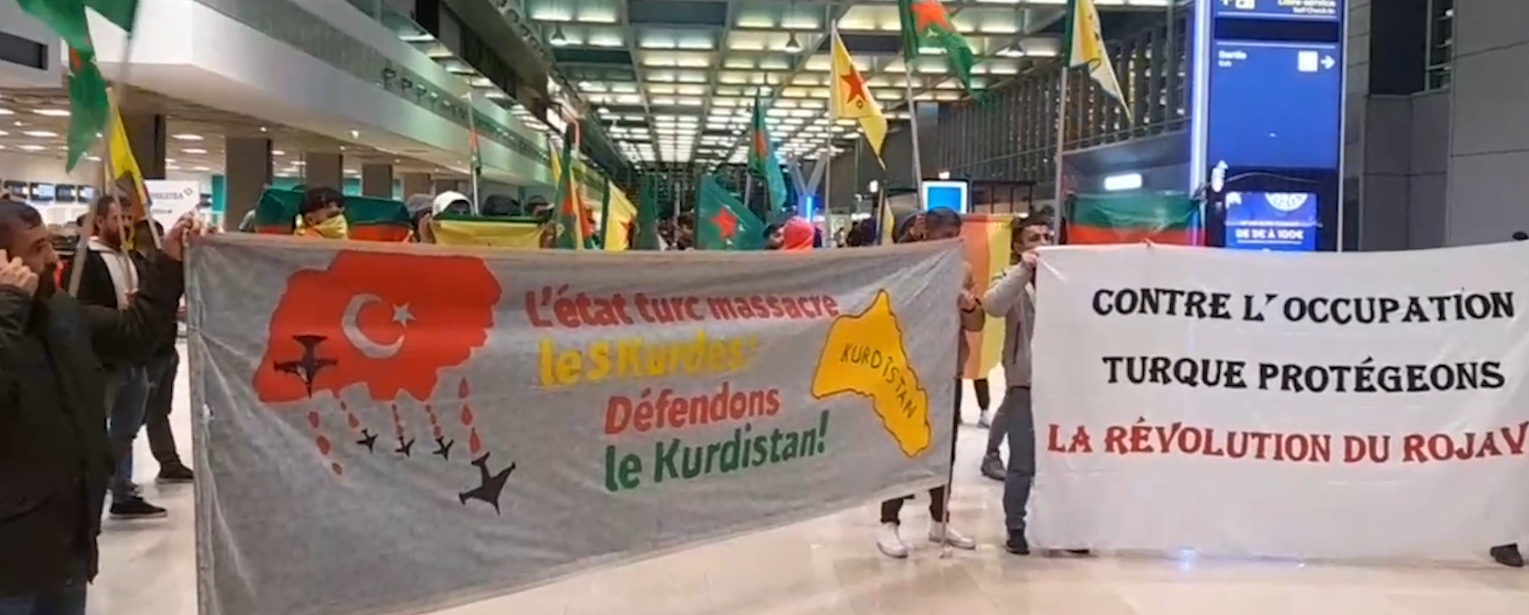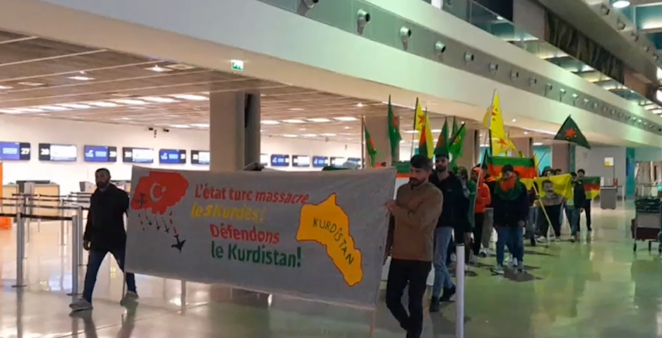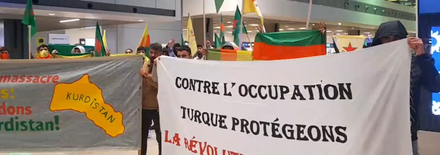 Havaalanı içerisinde “L’etat turc massacre les Kurdes! Défendons le Kurdistan!” (Türk devleti Kürtleri katlediyor! Kürdistan’ı savunalım!) ve Contre L’occupation Turquie Protégeons La Révolution Du Rojava” (Türk Devletinin İşgaline Karşı Rojava Devrimini Koruyalım”pankartları açan gençler, “Défendons Kurdistan”, “Vivle YPG” ve “ava régime fasciste aq Turquie” sloganları atarak 27 Kasım’dan bu yana başlayan Rojava’ya yönelik saldırıları kınadı.