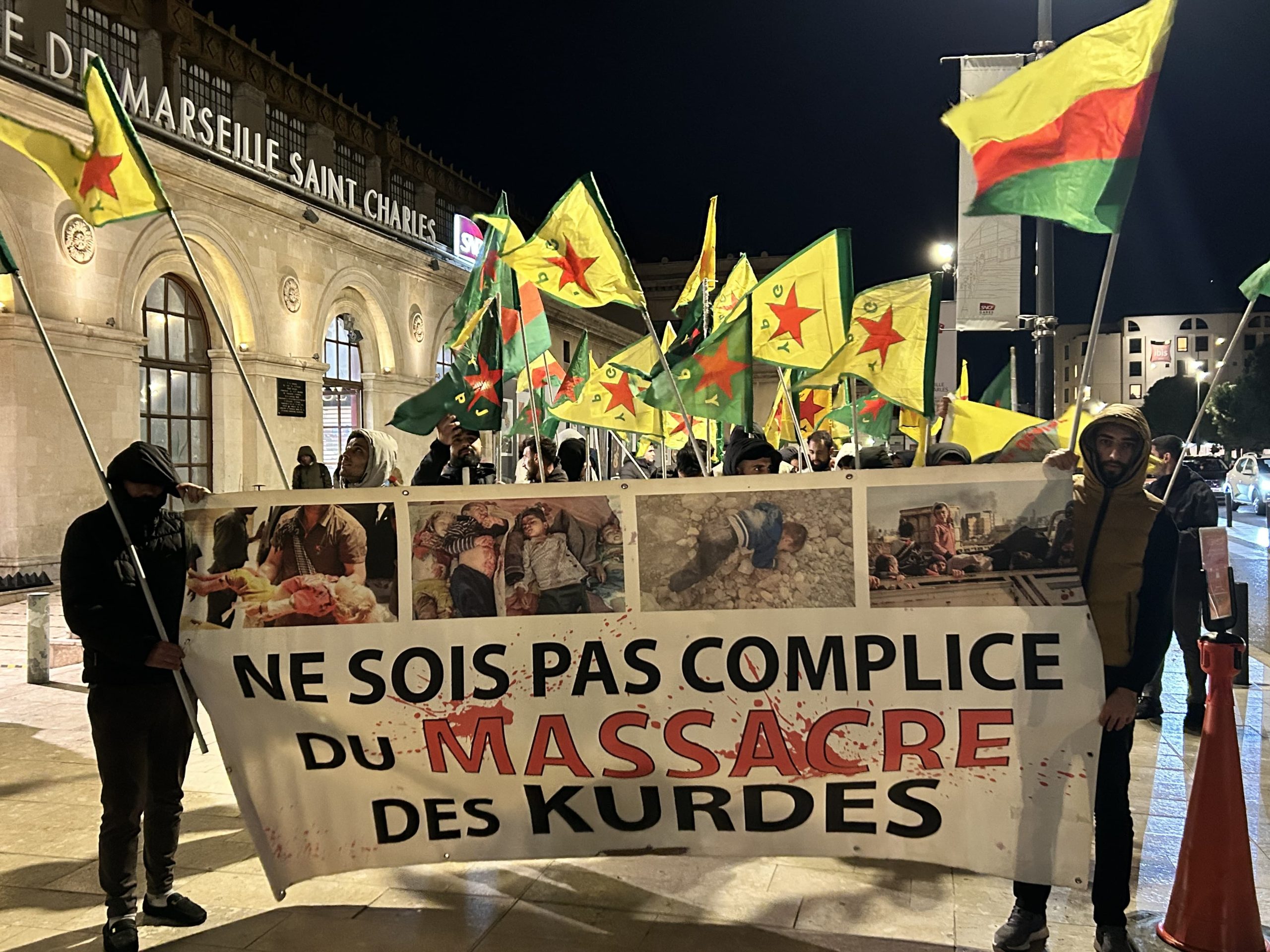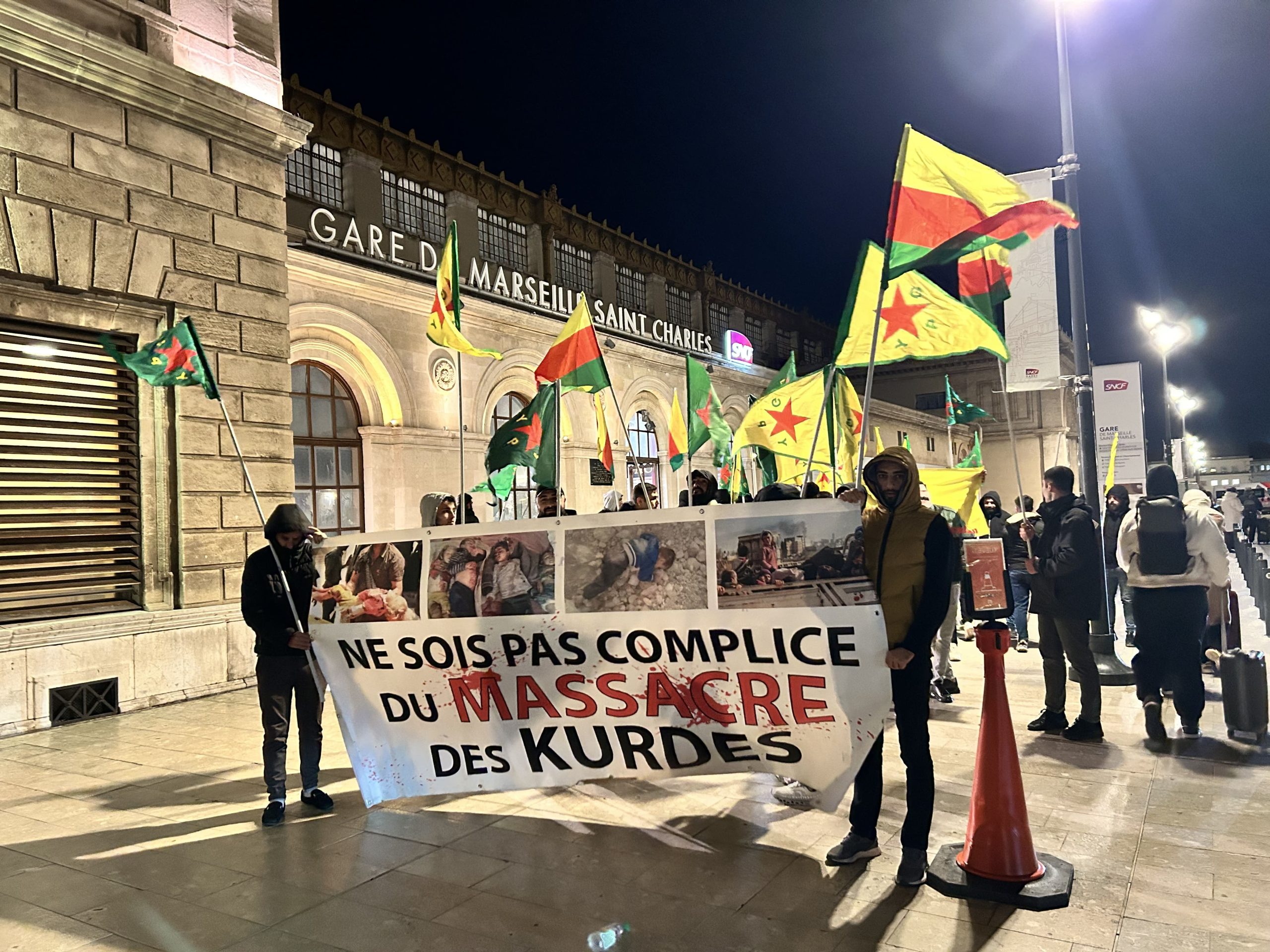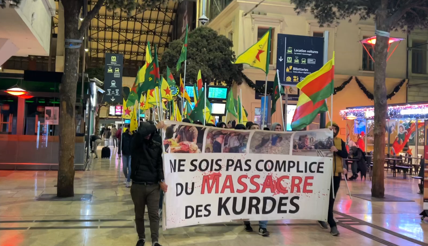 Marsilya Tren Garı içerisinde sloganlarla ile yürüyüş yapan gençler, sık sık “Bijî Serok APO”, “Bijî Berxwedana Rojava” ve “Ciwan Fedaiyên Rêber APO Ne” sloganları attı.