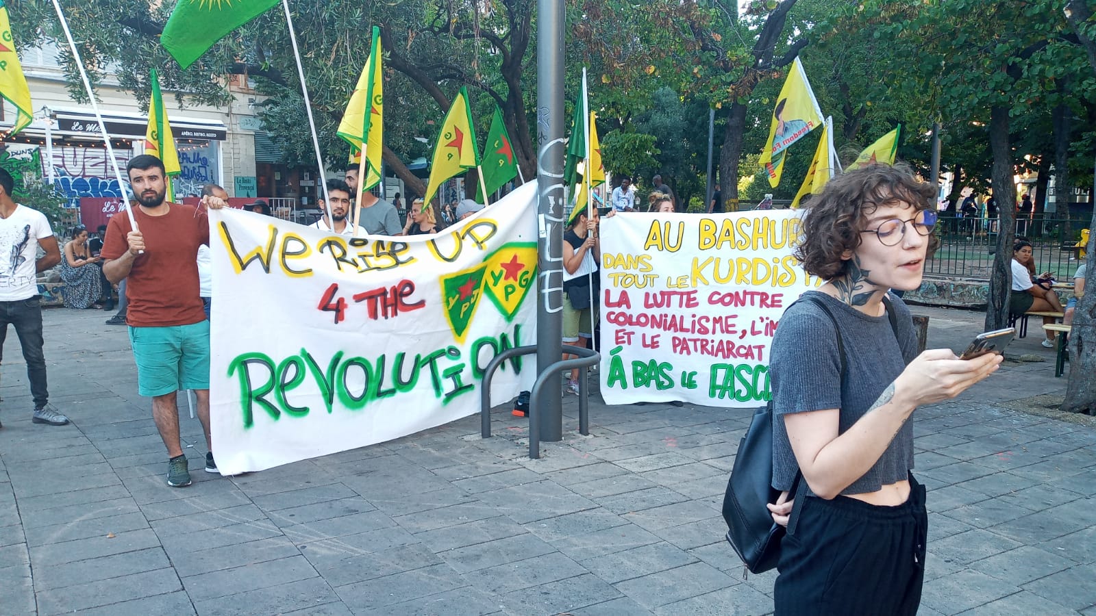 Antifa tarafından 2 gündür Rojava hakkında Fransa halkına bilgi vermek amacıyla açılan standın bulunduğu La Plaine meydanında saat 18’de toplanan Kürt ve antifaşist gençler, buradan yürüyüşe başladı. Fransızca ve Kürtçe Rojava devriminin yıldönümünü kutlayan pankartları açan gençler kent merkezinde yürüyüş gerçekleştirdi. Halklar Önderi Abdullah Öcalan’ın posterlerinin yanı sıra YPG-YPJ ve TCŞ bayraklarının açıldığı eylemde sık sık Fransızca ve Kürtçe sloganlar ile devrim selamlandı.