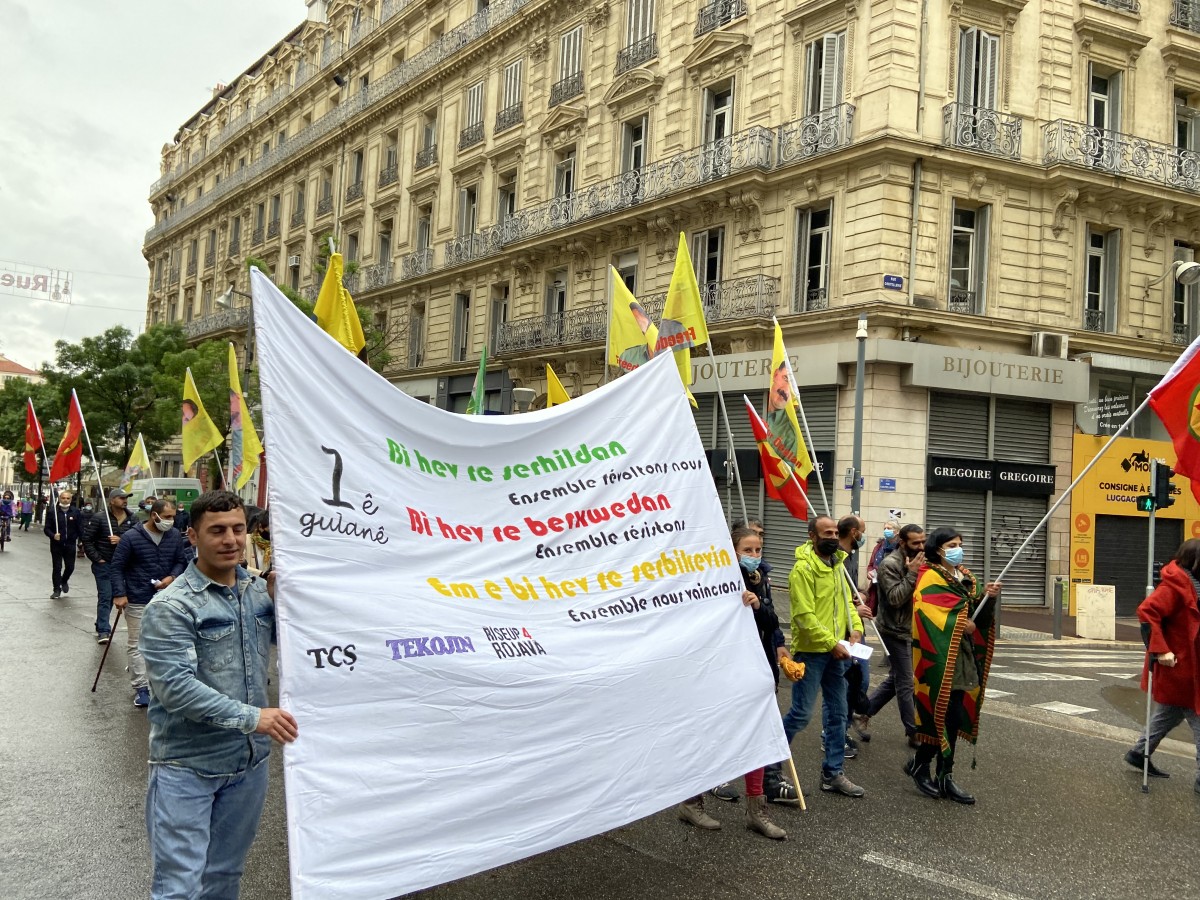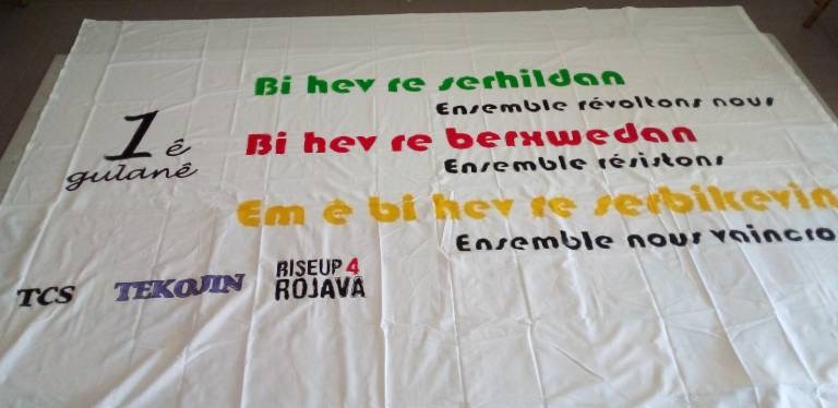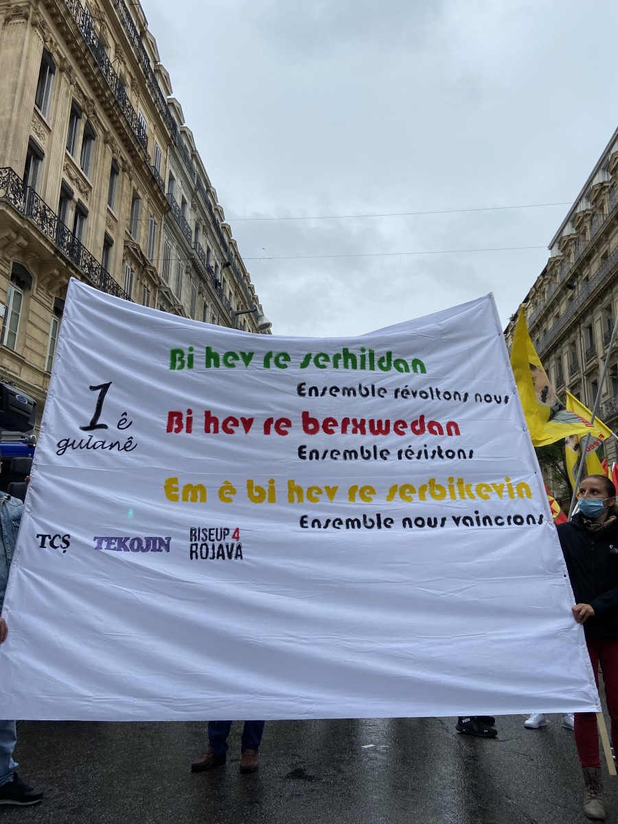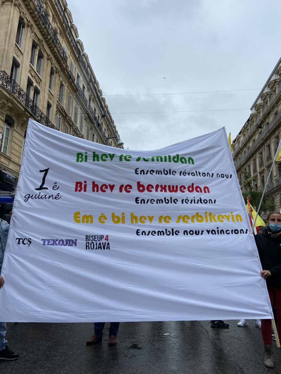 TCŞ, TekoJIN ve Enternasyonalist aktivistlerin yürüyüşte oluşturdukları korteje katılım ve ilgi yoğundu. Gençler eylemde üzerinde Kürtçe ve Fransızca “Bi Hev Re Serhildan”, “Bi Hev Re Berxwedan” ve “Em ê Bi Hev Re Serbikevin” yazan pankart, PKK ve Önder Öcalan’ın bayraklarını taşıdılar.