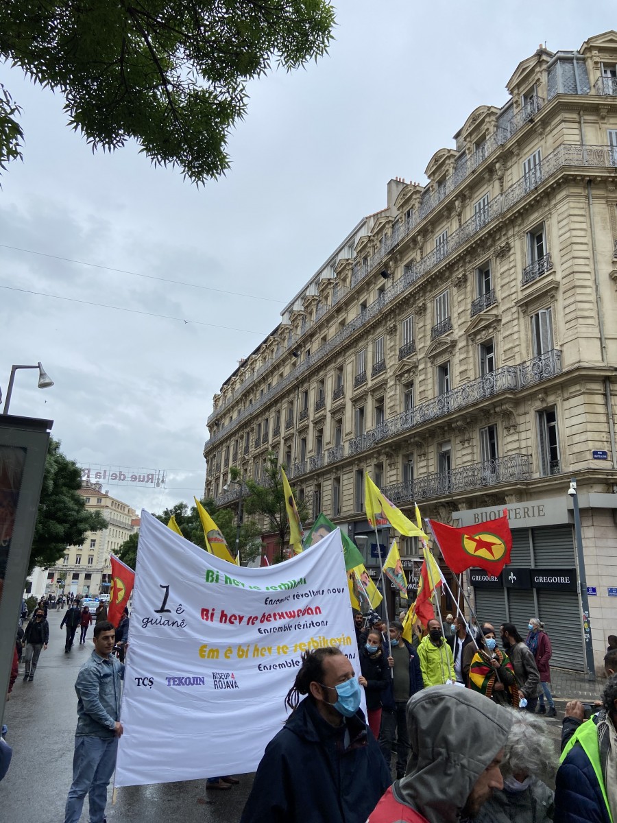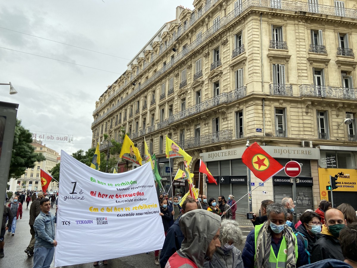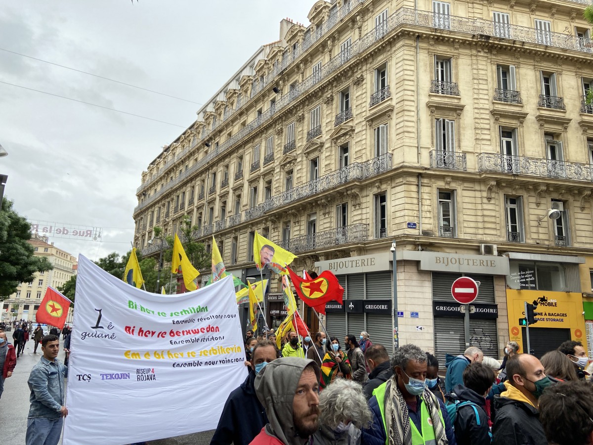 TCŞ, TekoJIN ve Enternasyonalist aktivistlerin yürüyüşte oluşturdukları korteje katılım ve ilgi yoğundu. Gençler eylemde üzerinde Kürtçe ve Fransızca “Bi Hev Re Serhildan”, “Bi Hev Re Berxwedan” ve “Em ê Bi Hev Re Serbikevin” yazan pankart, PKK ve Önder Öcalan’ın bayraklarını taşıdılar.