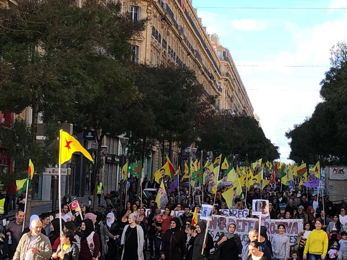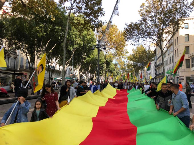 Fransız basınının yoğun ilgi gösterdiği yürüyüşte ‘Kuzey-Doğu Suriye’nin ve Rojava’nın hava sahasının kapatılması’, ‘Rojava yalnız değildir’ ve Türkiye’nin Rojava işgal girişiminde kimyasal silah kullandığına dair çok sayıda döviz ve pankart taşındı. YPG, YPJ ve Halklar Önderi Abdullah Öcalan’ın flamalarının taşındığı yürüyüşe; Draguignan ve Montpellier’de yaşayan Kürdistanlıların da katılımıyla sayı on bini buldu. Kitle yürüyüşte sık sık ‘Bijî berxwedana Rojava’, ‘Kahrolsun faşişt Türk rejimi’, ‘Katil Erdoğan’ ve ‘Bijî Serok APO’ sloganlarını attı. Yol güzergahının bulunduğu Avrupa parlementosu bölge temsilciliği binasının önüne yürüyüşe ‘Nehêle’ eylem hamlesi kapsamında katılan Tevgera Ciwanên Şoreşger aktivistleri tarafından kocaman PKK ve Tevgera Ciwanên Şoreşger bayrakları asıldı.