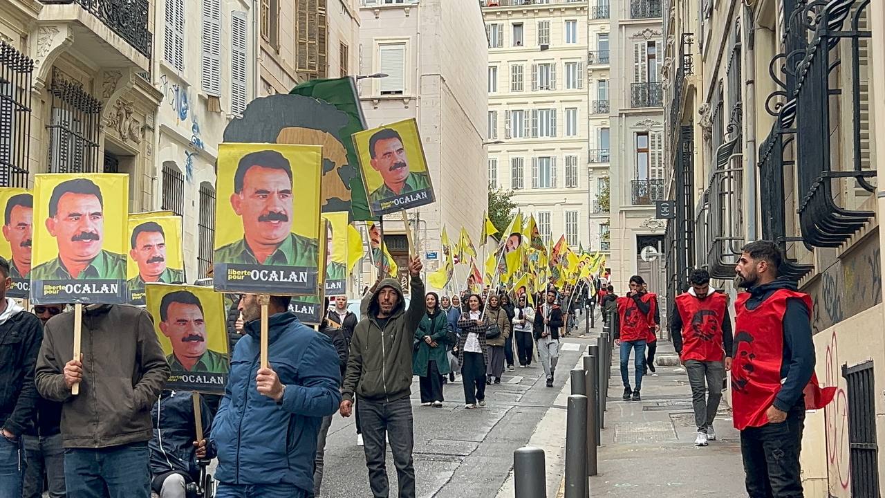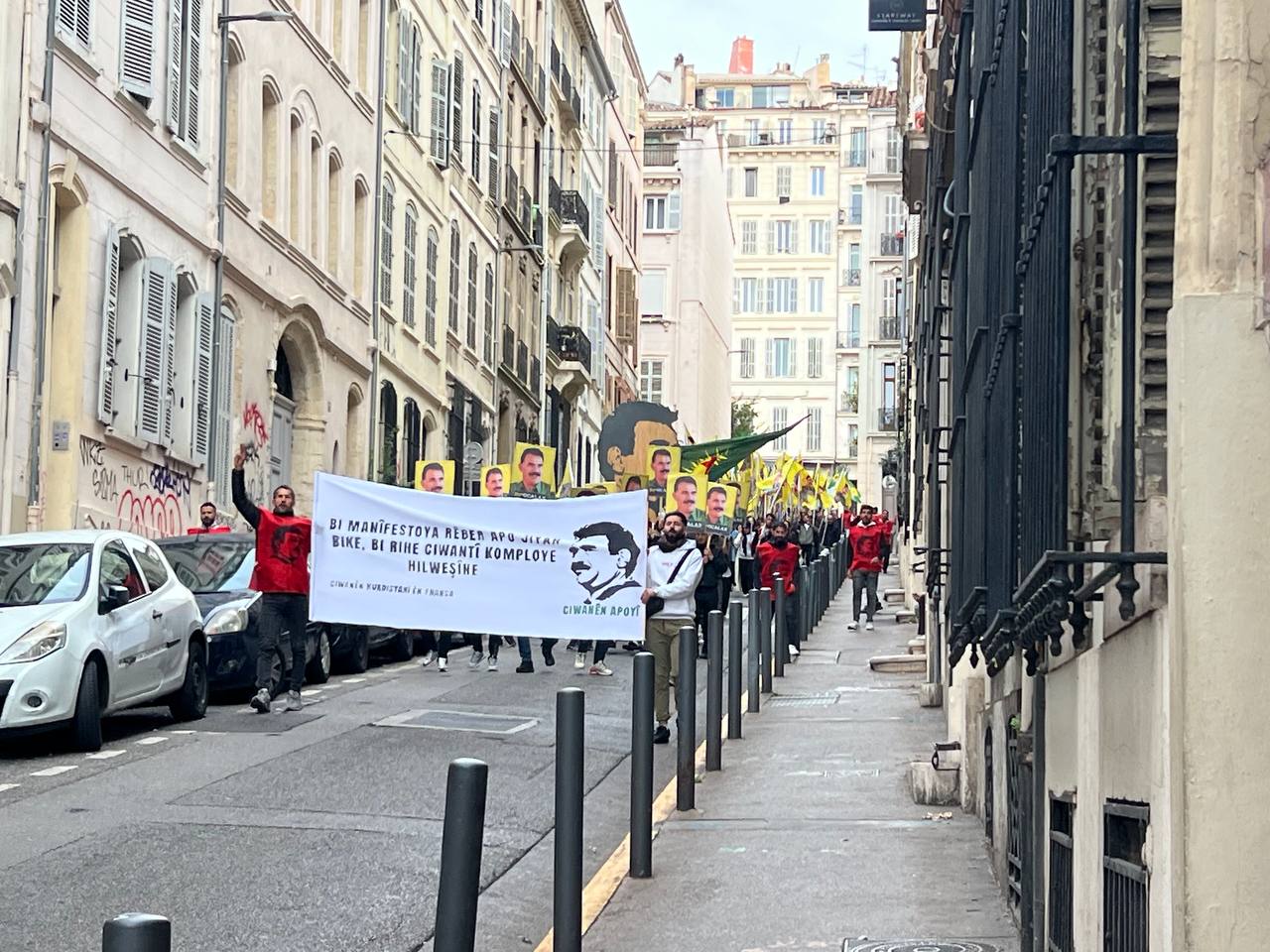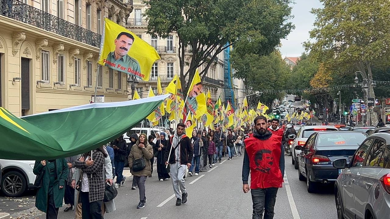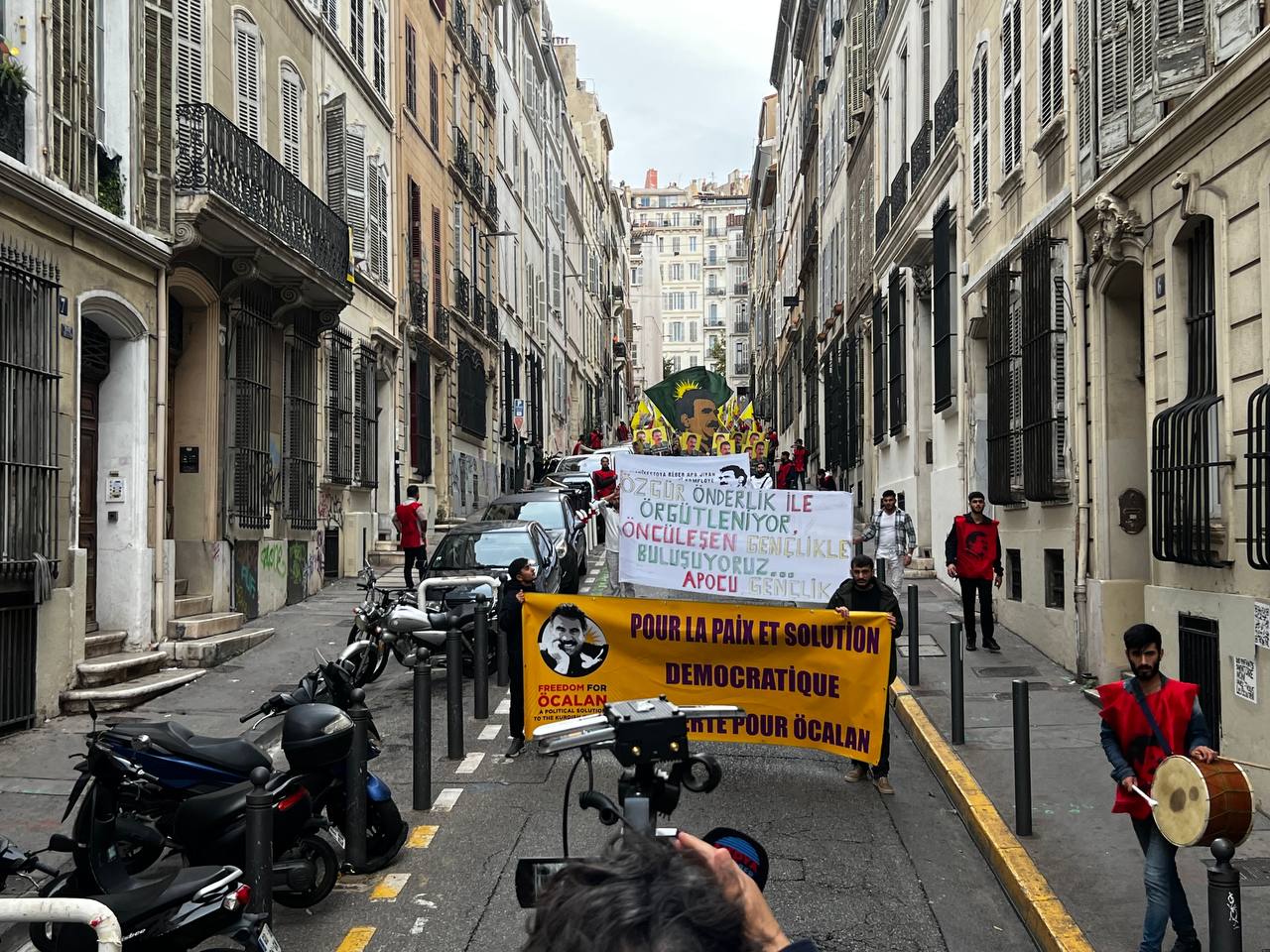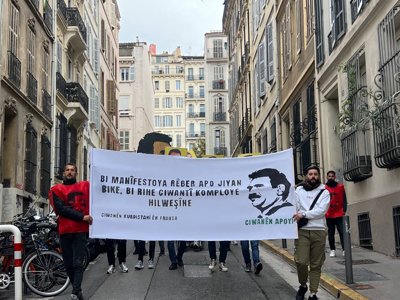 Yürüyüş boyunca “Bijî Serok APO” ve “Liberté pour Öcalan” sloganları sık sık yankılandı. Marsilya Préfecture binası önünde yapılan mitingte, Kürdistan şehitleri anısına bir dakikalık saygı duruşunda bulunuldu.