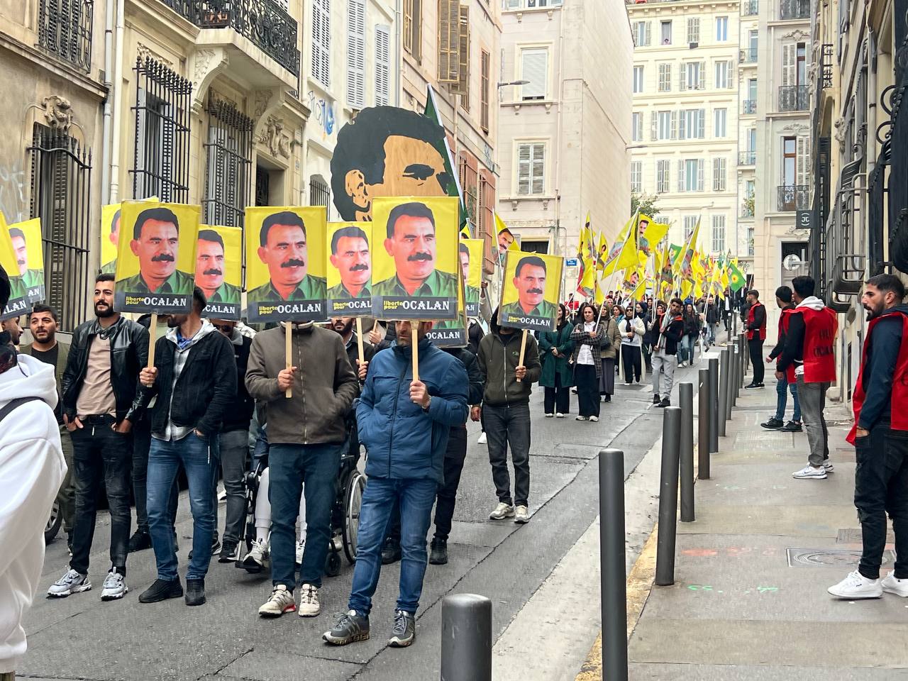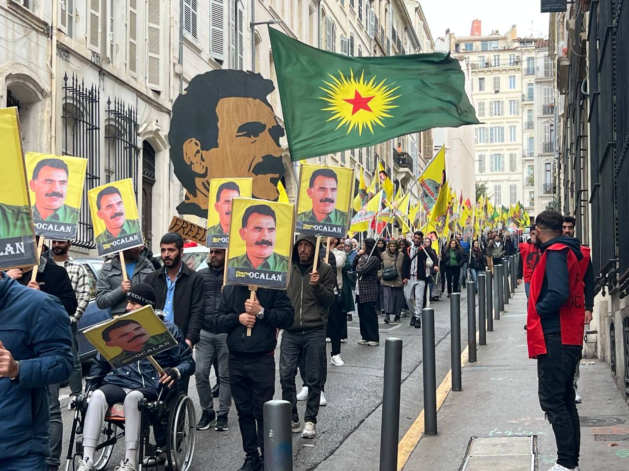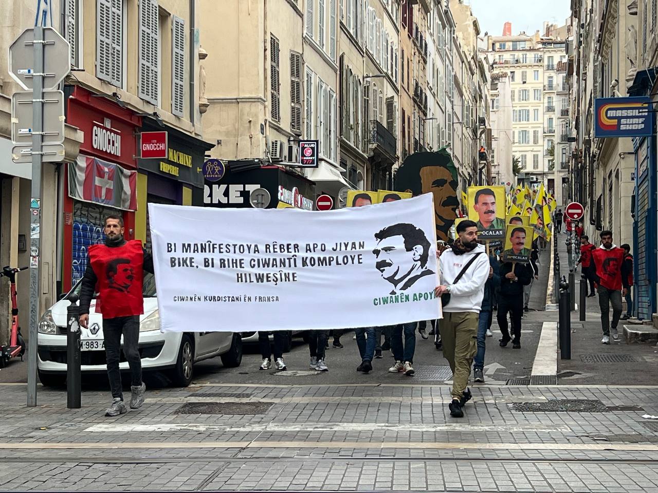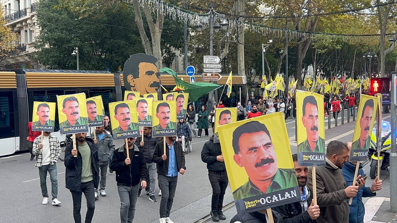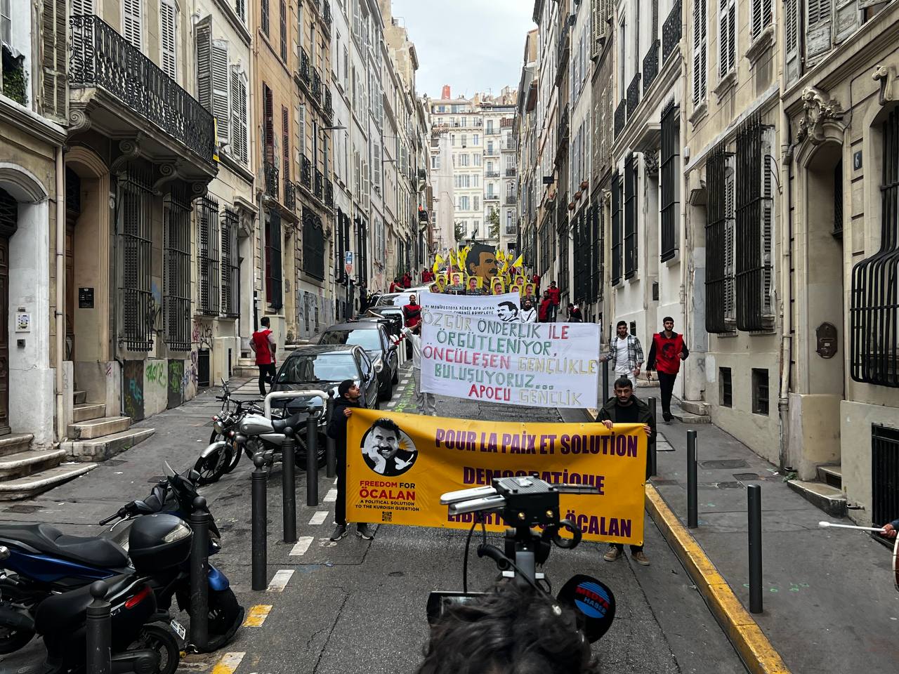 Yürüyüş boyunca “Bijî Serok APO” ve “Liberté pour Öcalan” sloganları sık sık yankılandı. Marsilya Préfecture binası önünde yapılan mitingte, Kürdistan şehitleri anısına bir dakikalık saygı duruşunda bulunuldu.