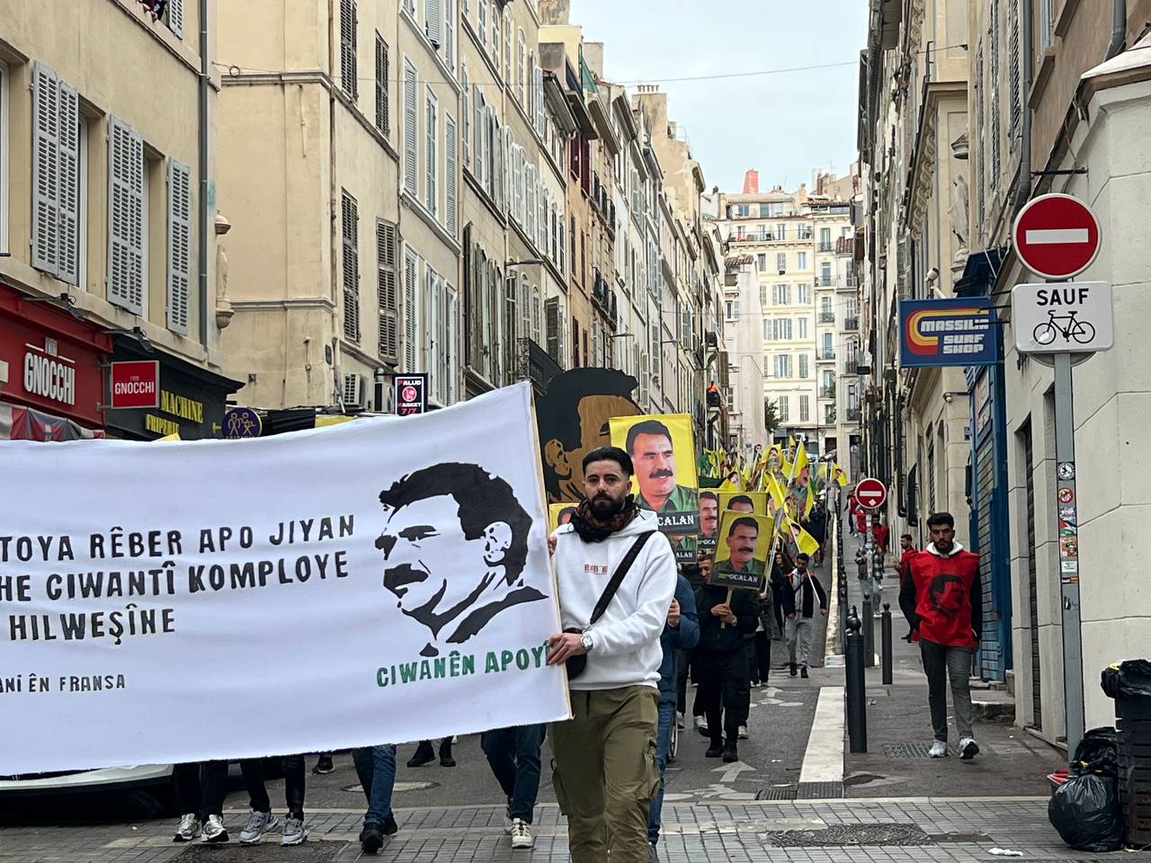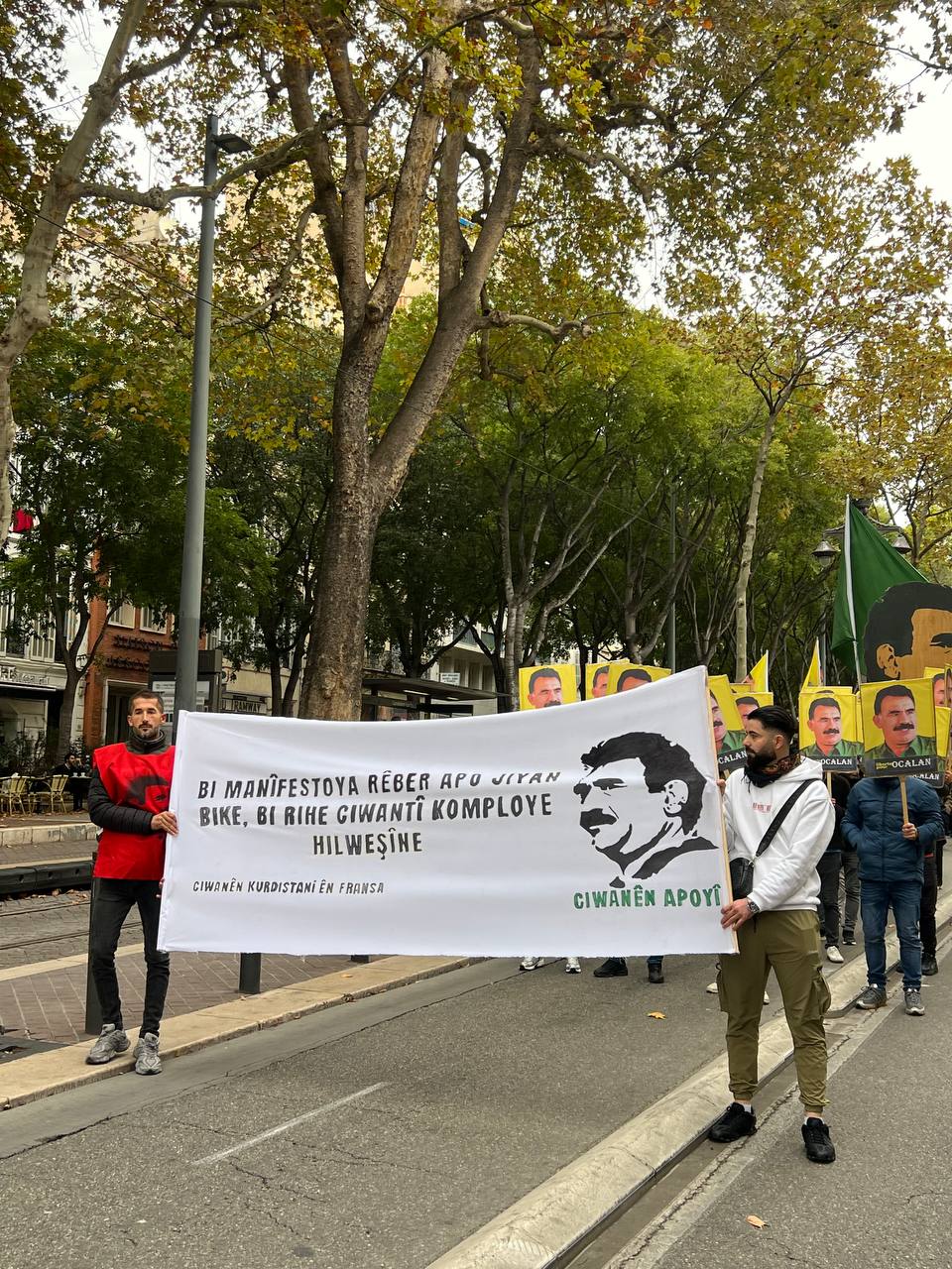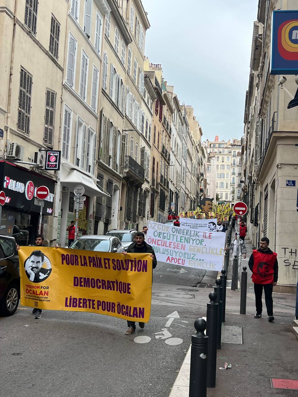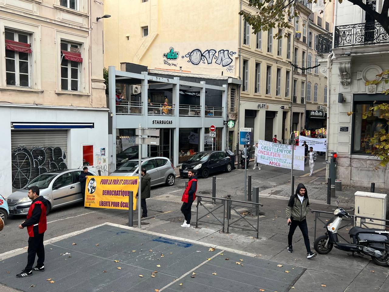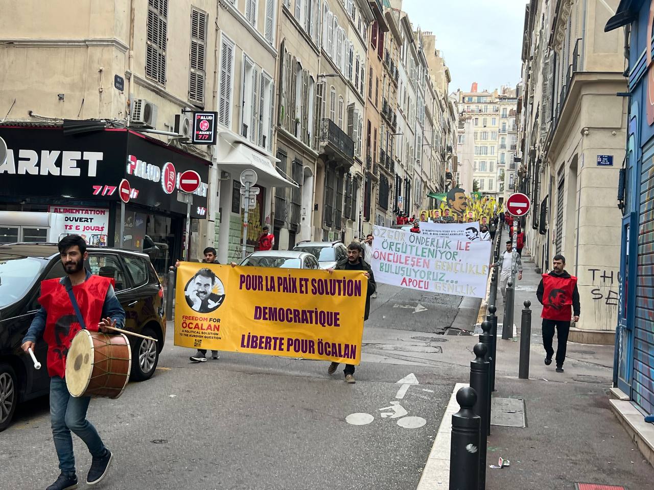 Yürüyüş boyunca “Bijî Serok APO” ve “Liberté pour Öcalan” sloganları sık sık yankılandı. Marsilya Préfecture binası önünde yapılan mitingte, Kürdistan şehitleri anısına bir dakikalık saygı duruşunda bulunuldu.
