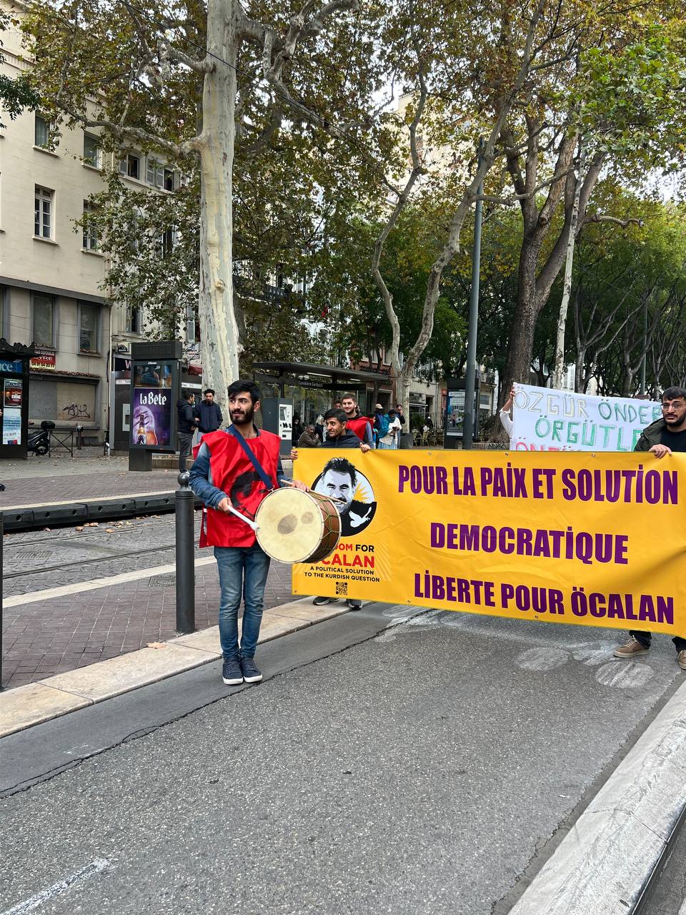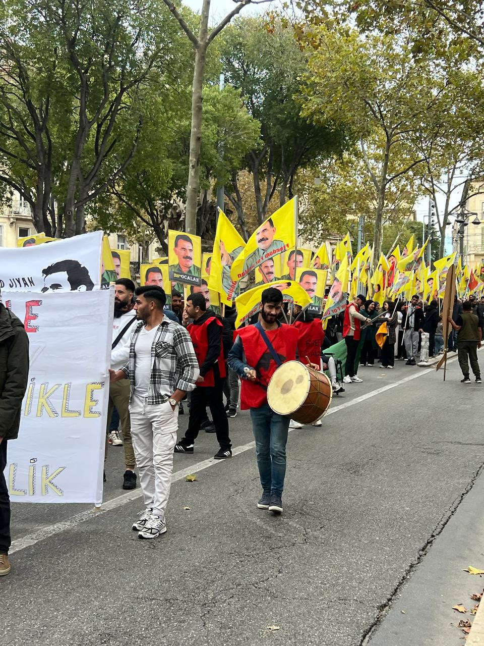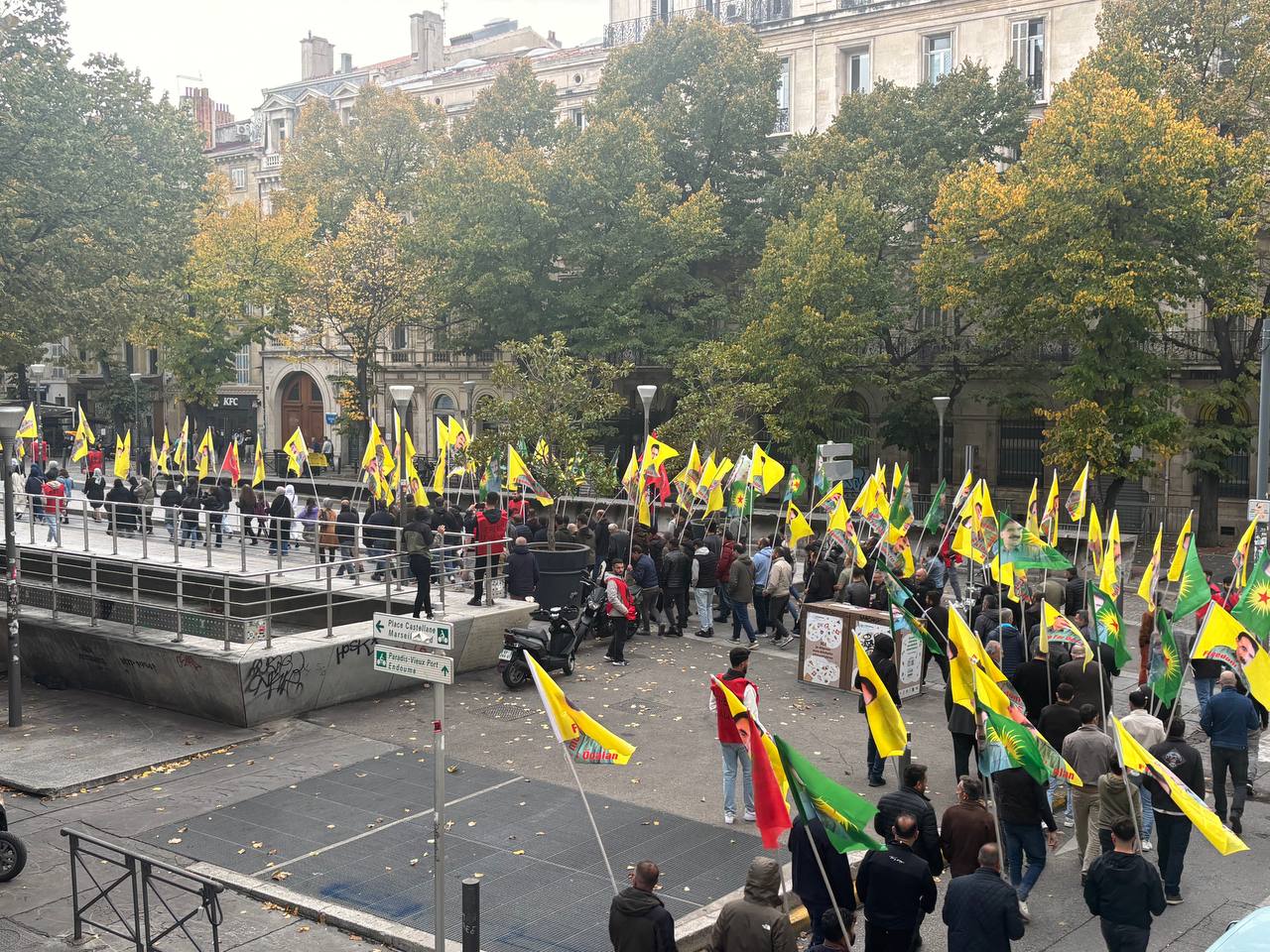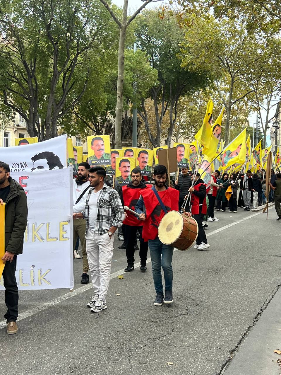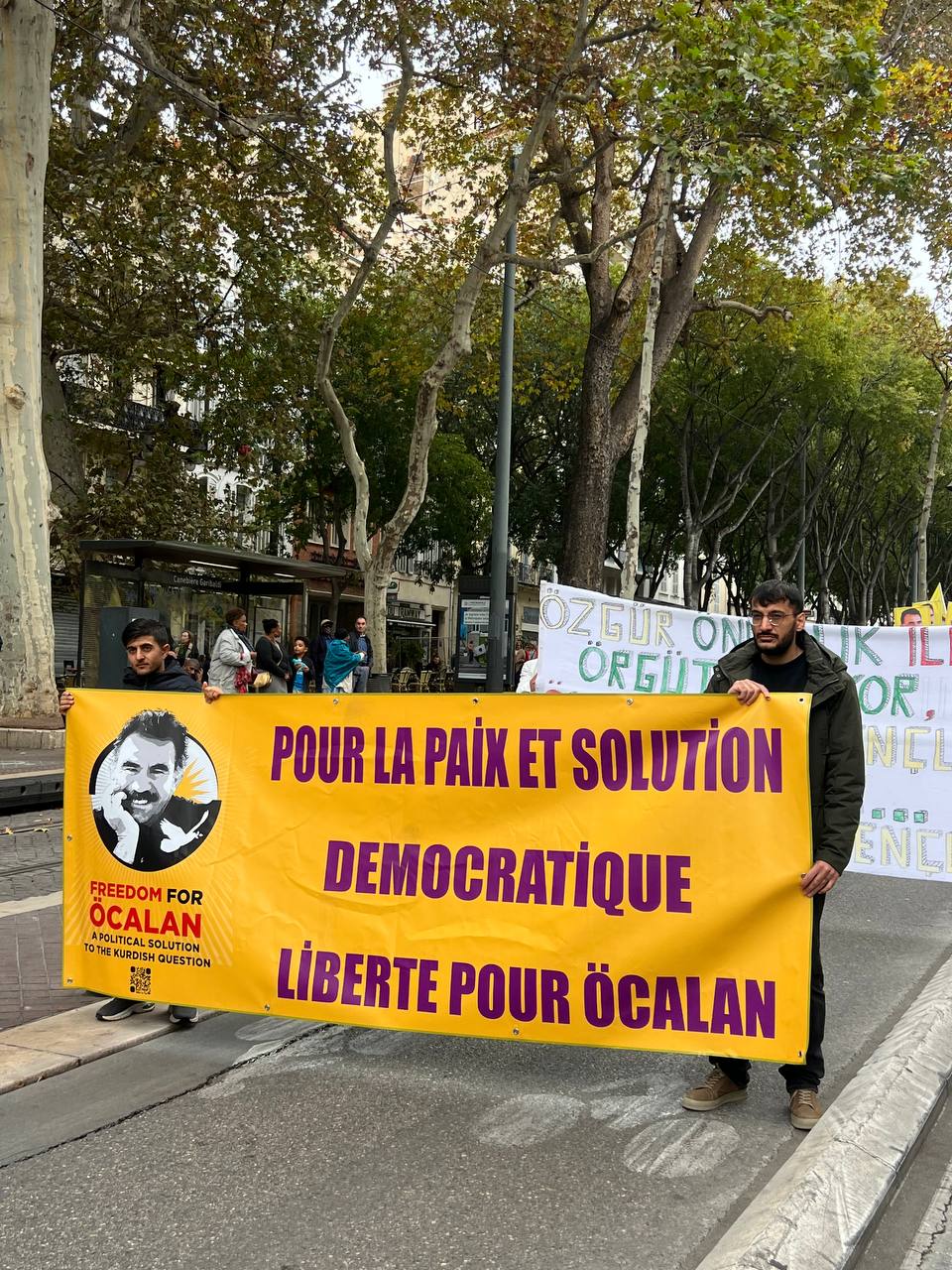 Yürüyüş boyunca “Bijî Serok APO” ve “Liberté pour Öcalan” sloganları sık sık yankılandı. Marsilya Préfecture binası önünde yapılan mitingte, Kürdistan şehitleri anısına bir dakikalık saygı duruşunda bulunuldu.
