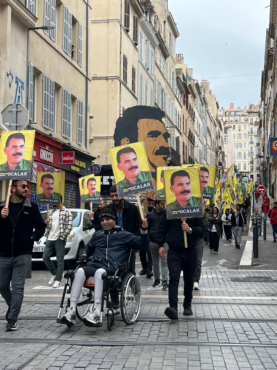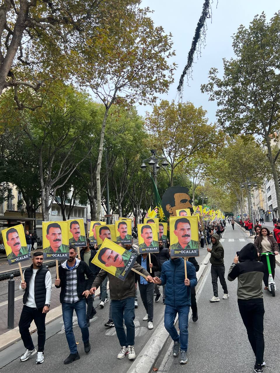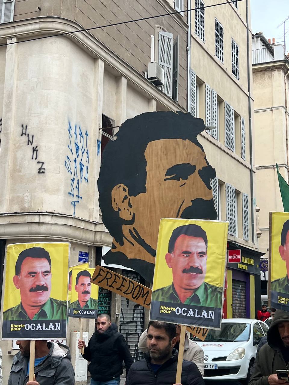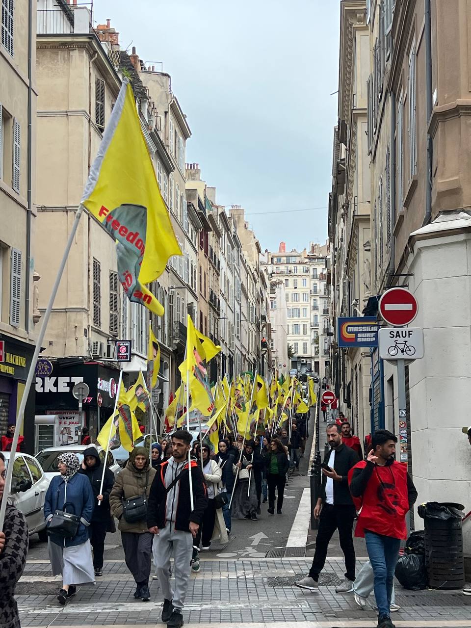Yürüyüş boyunca “Bijî Serok APO” ve “Liberté pour Öcalan” sloganları sık sık yankılandı. Marsilya Préfecture binası önünde yapılan mitingte, Kürdistan şehitleri anısına bir dakikalık saygı duruşunda bulunuldu.