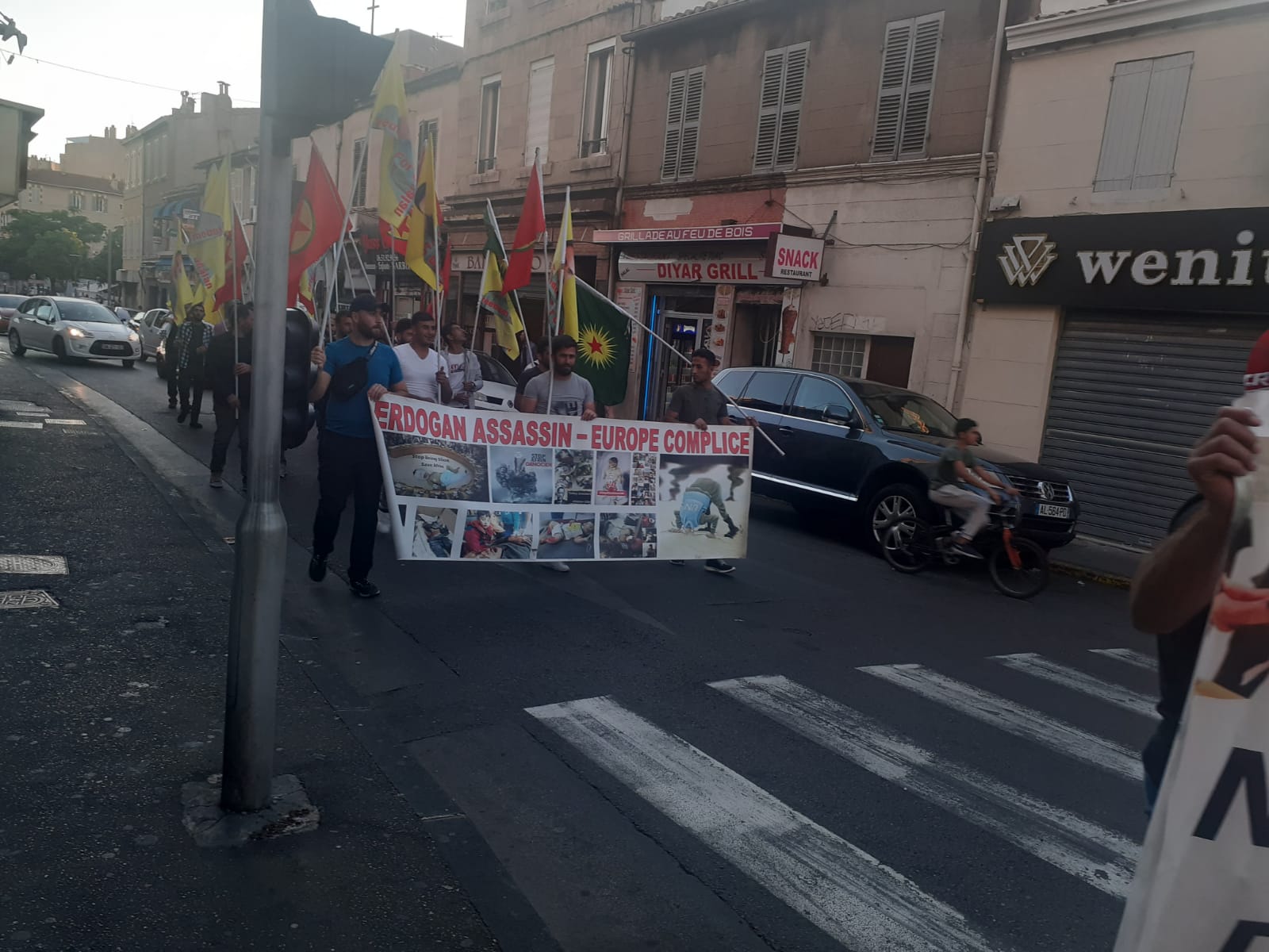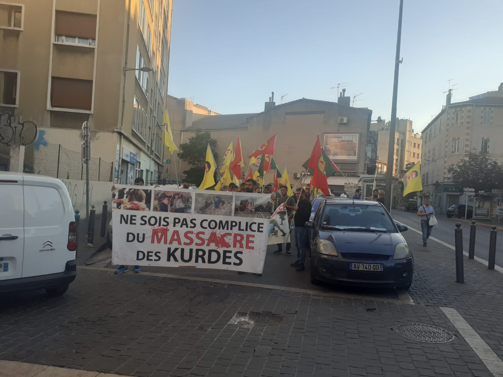 Saat 20’de Belle Mai meydanında bir araya gelen gençler, burada yürüyüşe başladı. Fransızca, “Kürtlerin katledilmesinin suç ortağı olma” yazılı pankart ile yürüyen gençler, kent merkezindeki birçok sokakta yürüyüşlerini sürdürdü. Sık sık Fransızca ve Kürtçe Türk faşizmini teşhir eden sloganlar atan gençler, yürüyüşte Halklar Önderi Abdullah Öcalan’ın posteri, PKK ve KCK bayraklarını taşıdı.