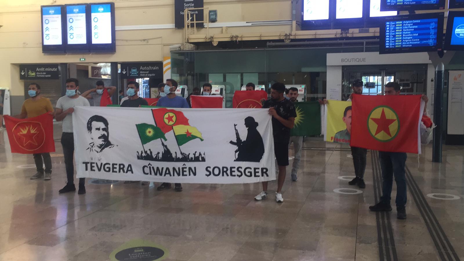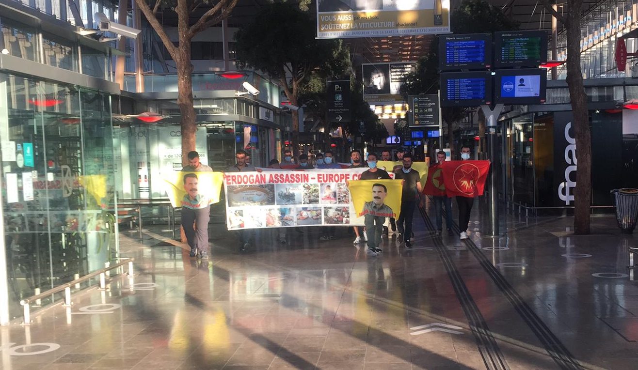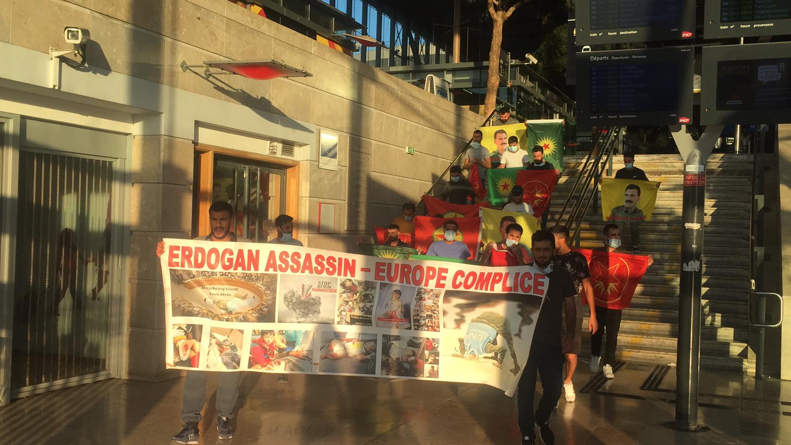 Saat 20’de St.Charles tren istasyonunda bir araya gelen gençler, burada yürüyüşlerine başladı. Fransızca, “Katil Erdoğan” yazılı pankart ile yürüyüşe başlayan gençler sık sık Kürtçe ve Fransızca sloganlarla Türk faşizmini protesto etti. Eylemde Halklar Önderi Abdullah Öcalan’ın posterleri ve TCŞ, YPG-YPJ, KCK-PKK bayraklarını açan gençler, Fransızca okudukları bildiride Kürdistan’da Türk işgal ve soykırım saldırılarını kabul etmediklerini belirttiler.
