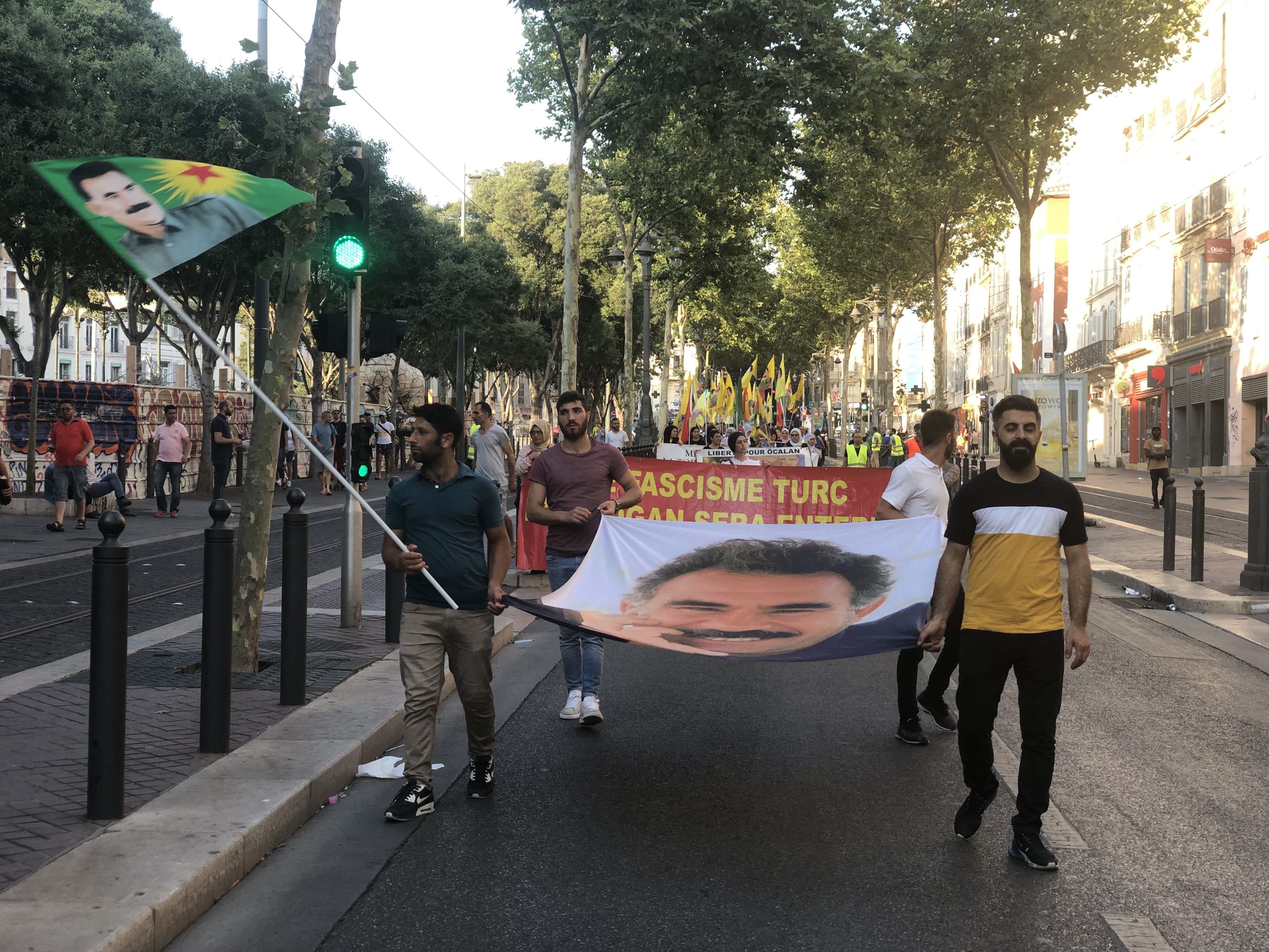 PKK ve KCK bayraklarının yanı sıra Fransızca yazılı döviz ve pankartlar eşliğinde yürüyüşe geçen kitle, sık sık “diktatör Erdoğan” sloganını attı.