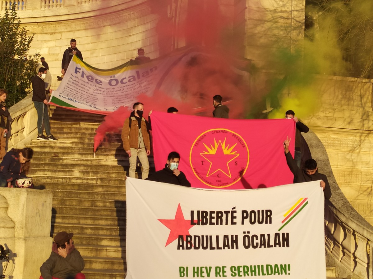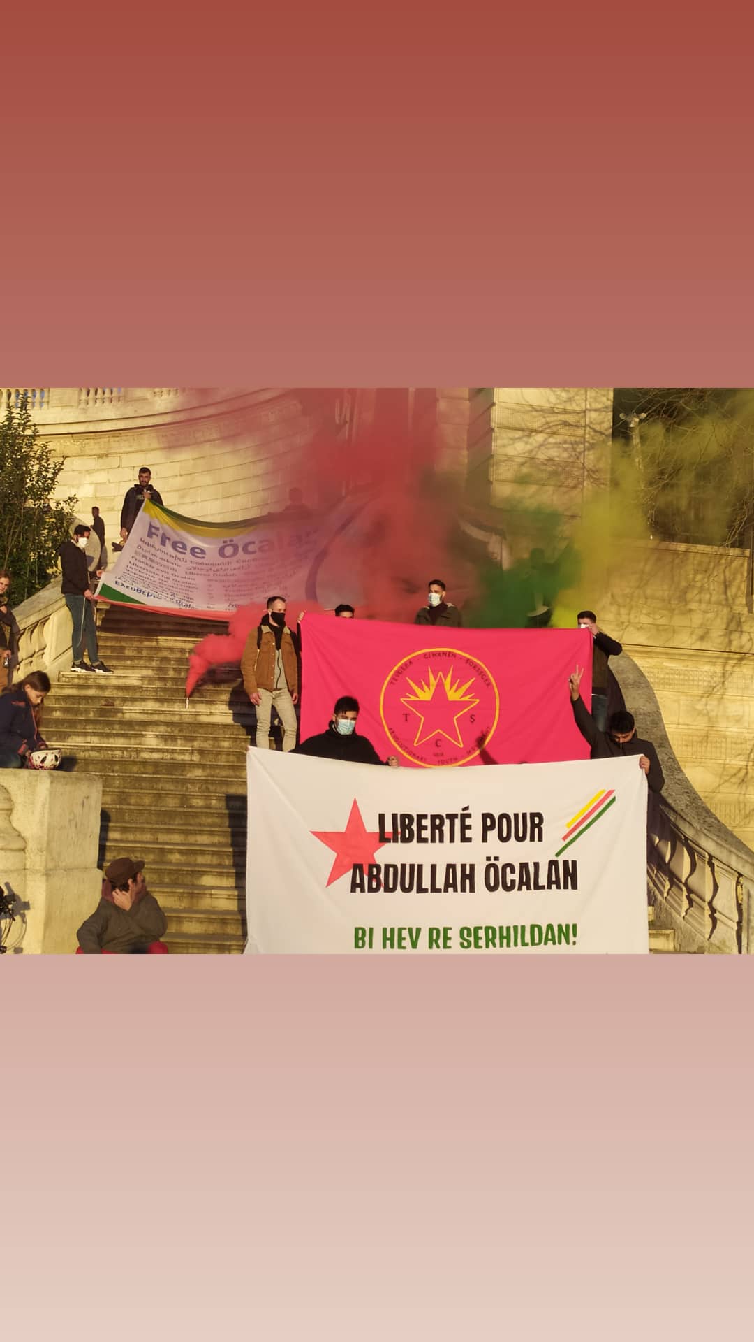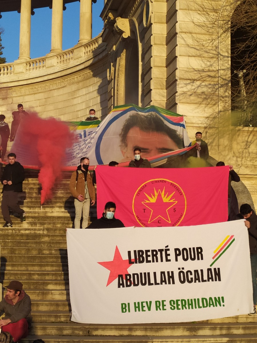 Eylem esnasında Fransızca “Abdullah Öcalan’a Özgürlük” yazan bir pankart ve büyük bir “Free Öcalan” yazan bayrak açan gençler renkli dumanlarla eylemlerine görsellik kattılar. Eylemlerinde sık sık “Assassin Erdogan (Katil Erdoğan)”, “A Bas Le Régime Fasciste En Turquie (Kahrolsun Faşist Türk Rejimi)”, “Bijî Serok APO” ve “Bi Hev Re Serhildan” sloganları attılar.