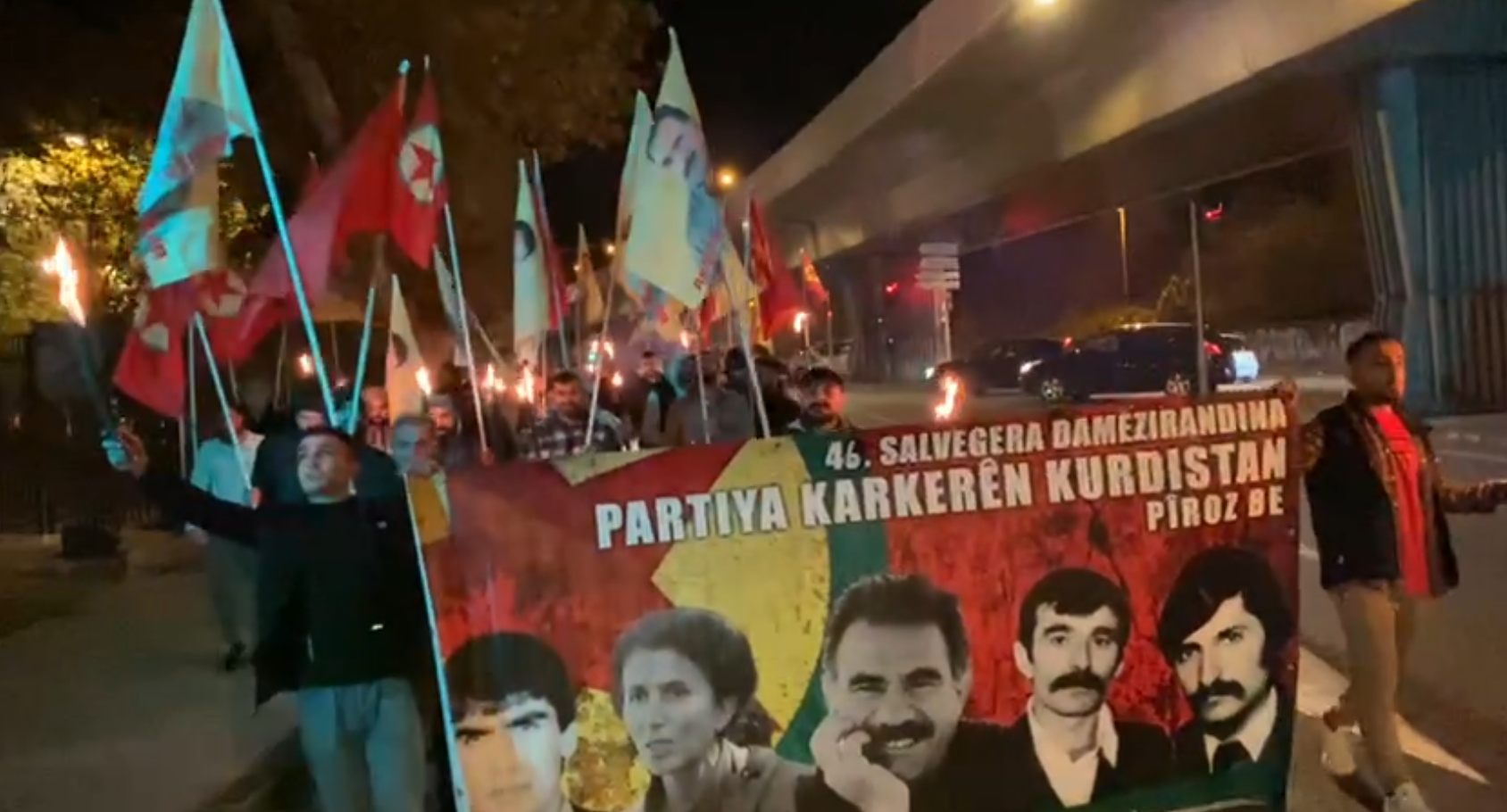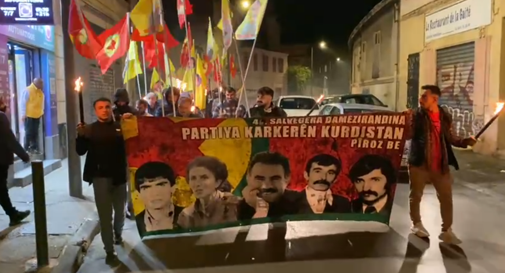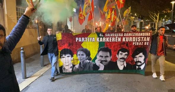 MARSILYA – Fransa’nın Marsilya şehrinden Tevgera Ciwanên Şoreşger (TCŞ) öncülüğünde PKK’nin 46. yıldönümü için meşaleli yürüyüş düzenlendi. Yürüyüşte “46. Salvegara Damezirandina Partiya Karkerên Kurdistan Pîroz be” (PKK’nin 46. Kuruluş yıldönümü kutlu olsun) yazılı ve Önder APO ve PKK’nin kurucularından Şehit Mazlum Doğan, Sakine Cansız, Kemal Pir ve Mehmet Hayri Durmuş’un resimlerinin olduğu pankart açıldı.