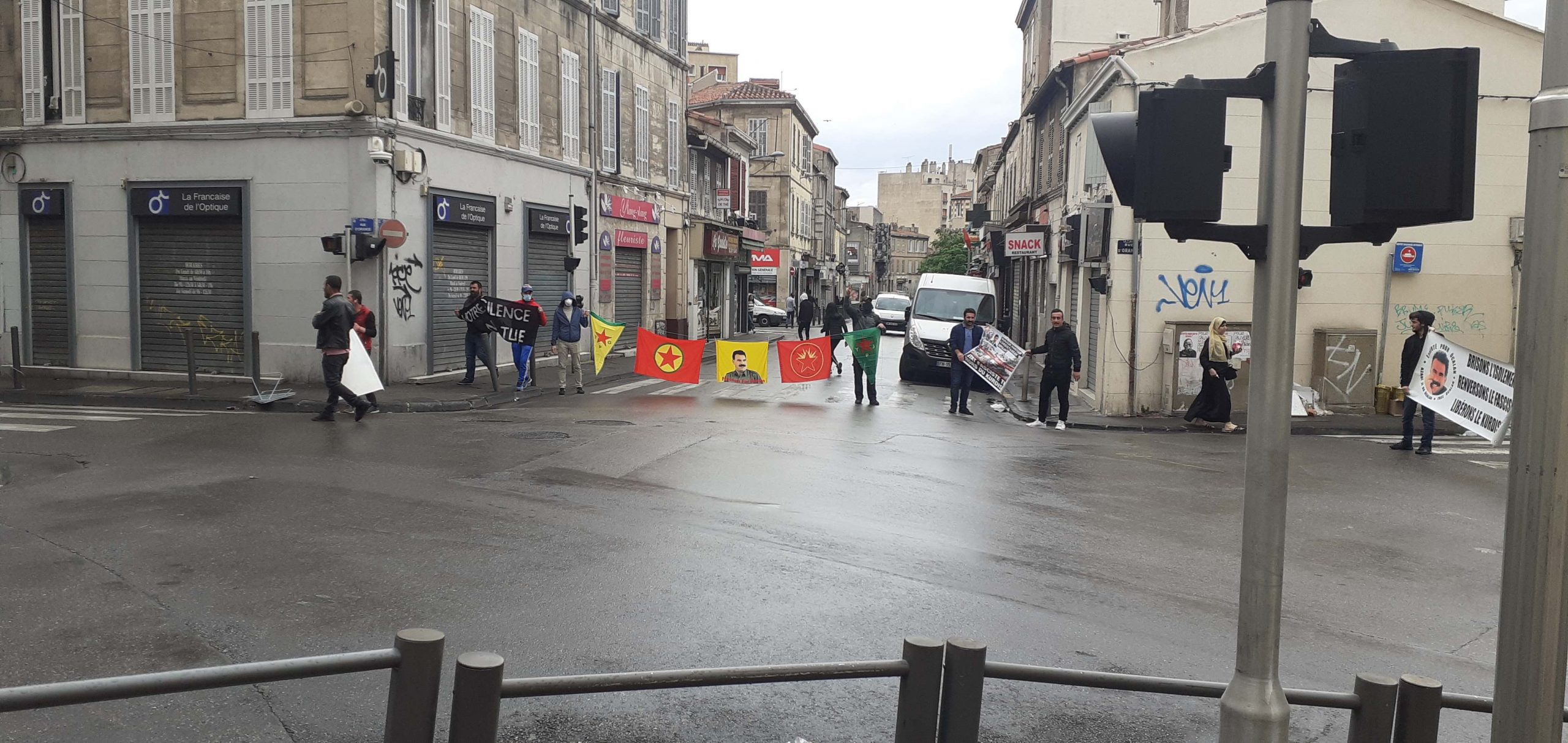 MARSİLYA – Tevgera Ciwanên Şoreşger aktivistleri 10 Mayıs akşam saatlerinde Marsilya’ya bağlı Belle de Mai ve Marignane bölgelerinde bir araya gelerek soykırımcı Türk devletinin Kürdistan’a yönelik işgal saldırılarını ve KDP yönetiminin Kürdistan’daki işbirlikçi ve ihanetçi çizgisini protesto etti.