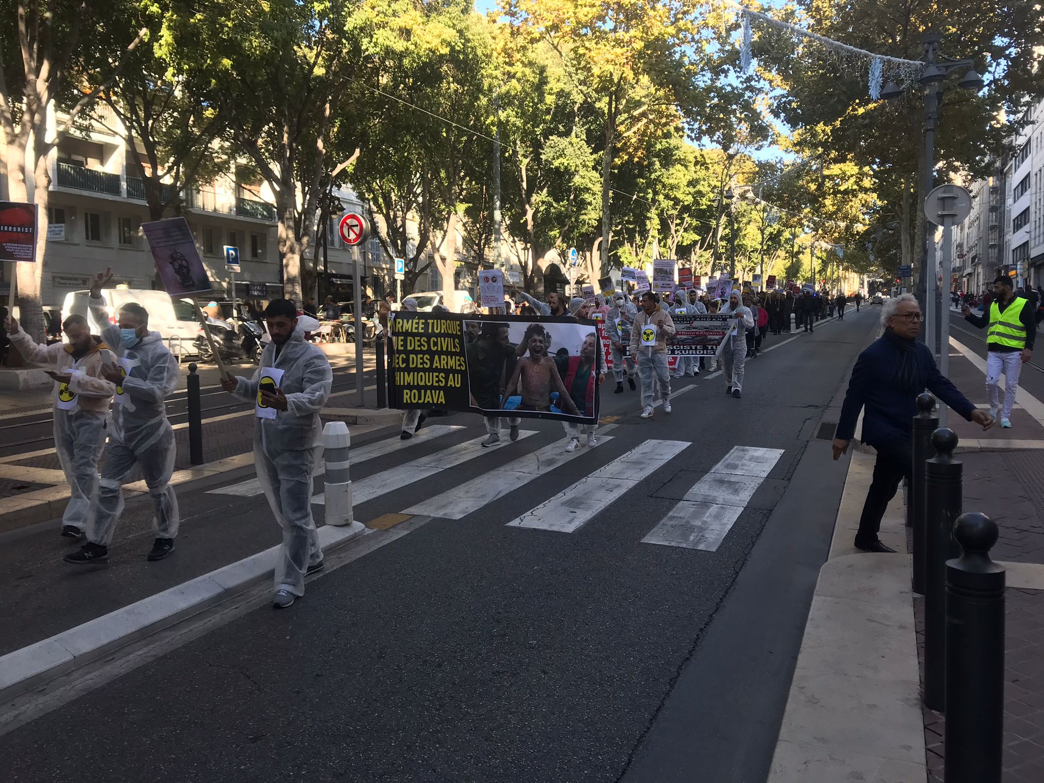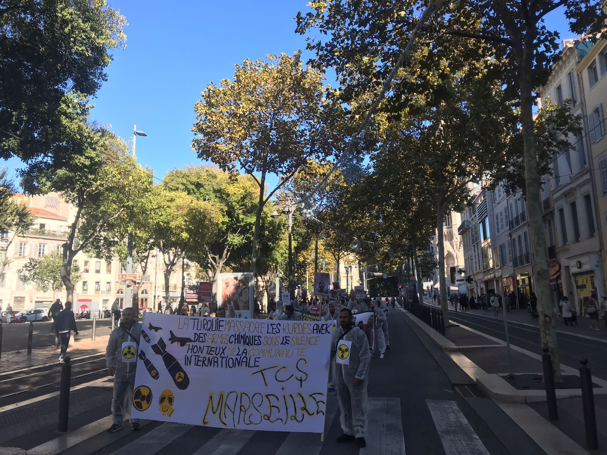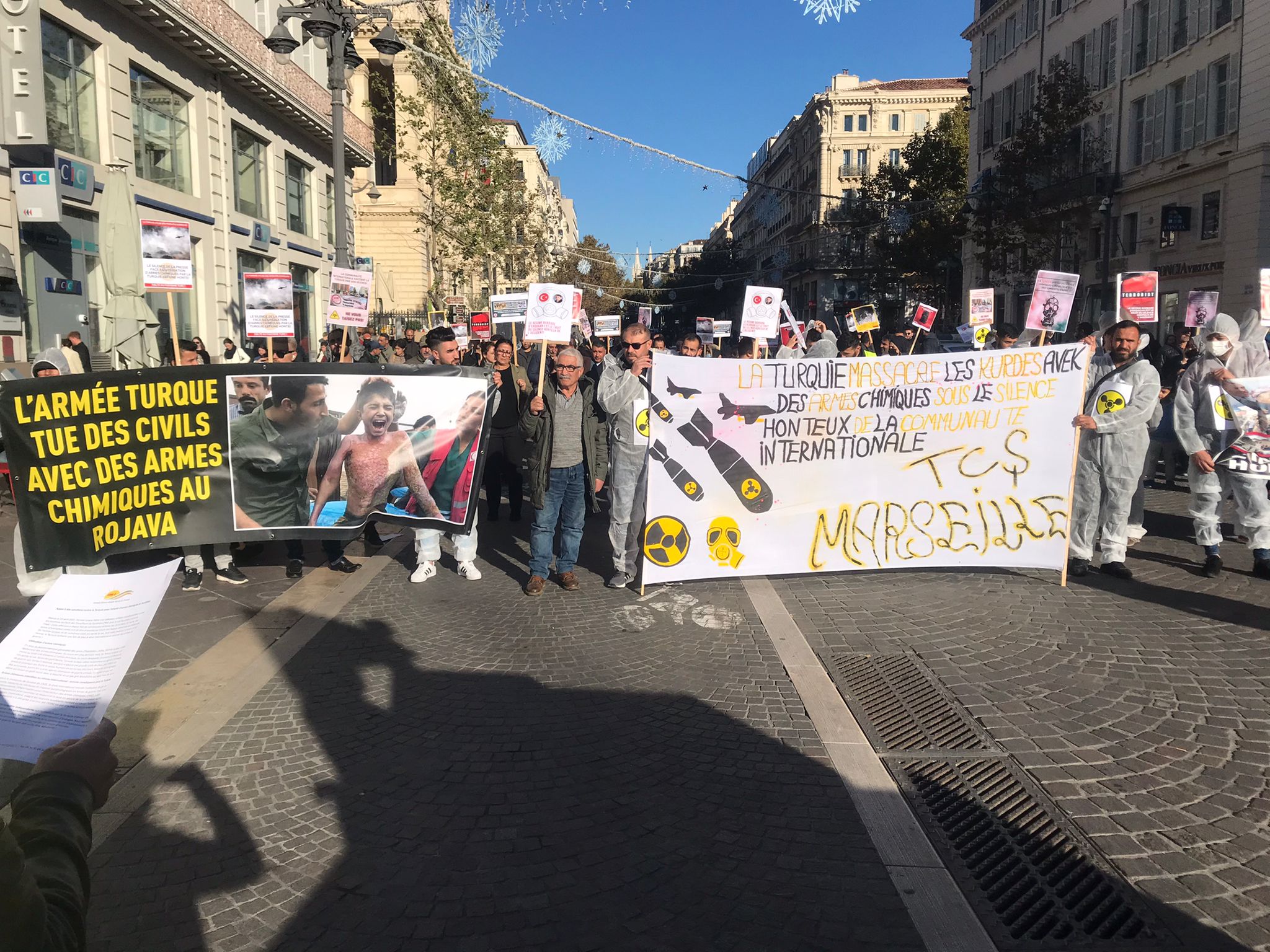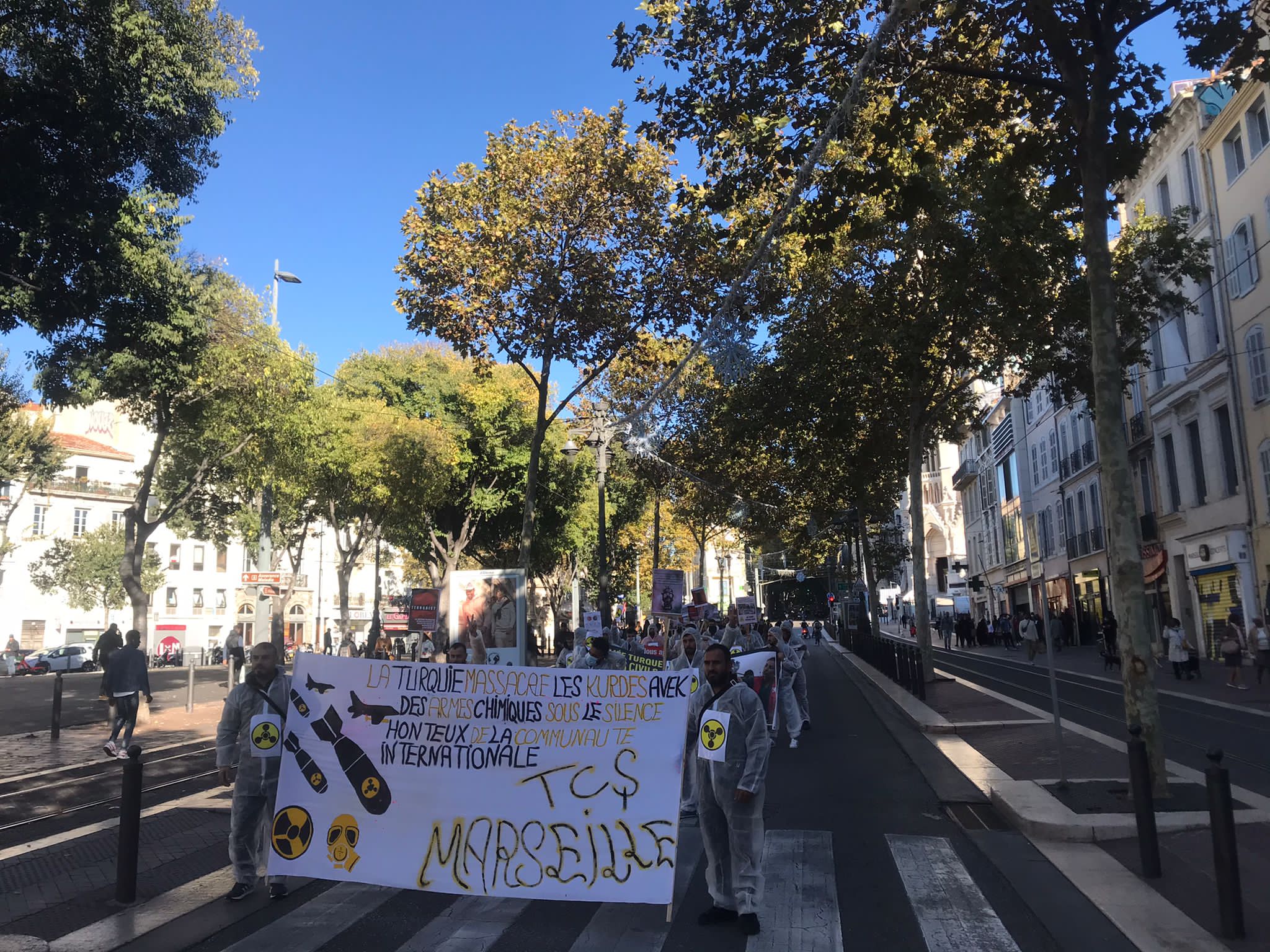 Kent merkezinde bir araya gelen yüzlerce genç ve yurtsever halk faşist TC zihniyetini teşhir etmek için kimyasal silah kullanımı anlatan pankartlar taşıdı. Türk devletinin kirli yüzü teşhir edildi. Yürüyüş boyunca eylemciler tarafından Fransızca bildiriler okundu ve etraftaki kitleye dağıtıldı.