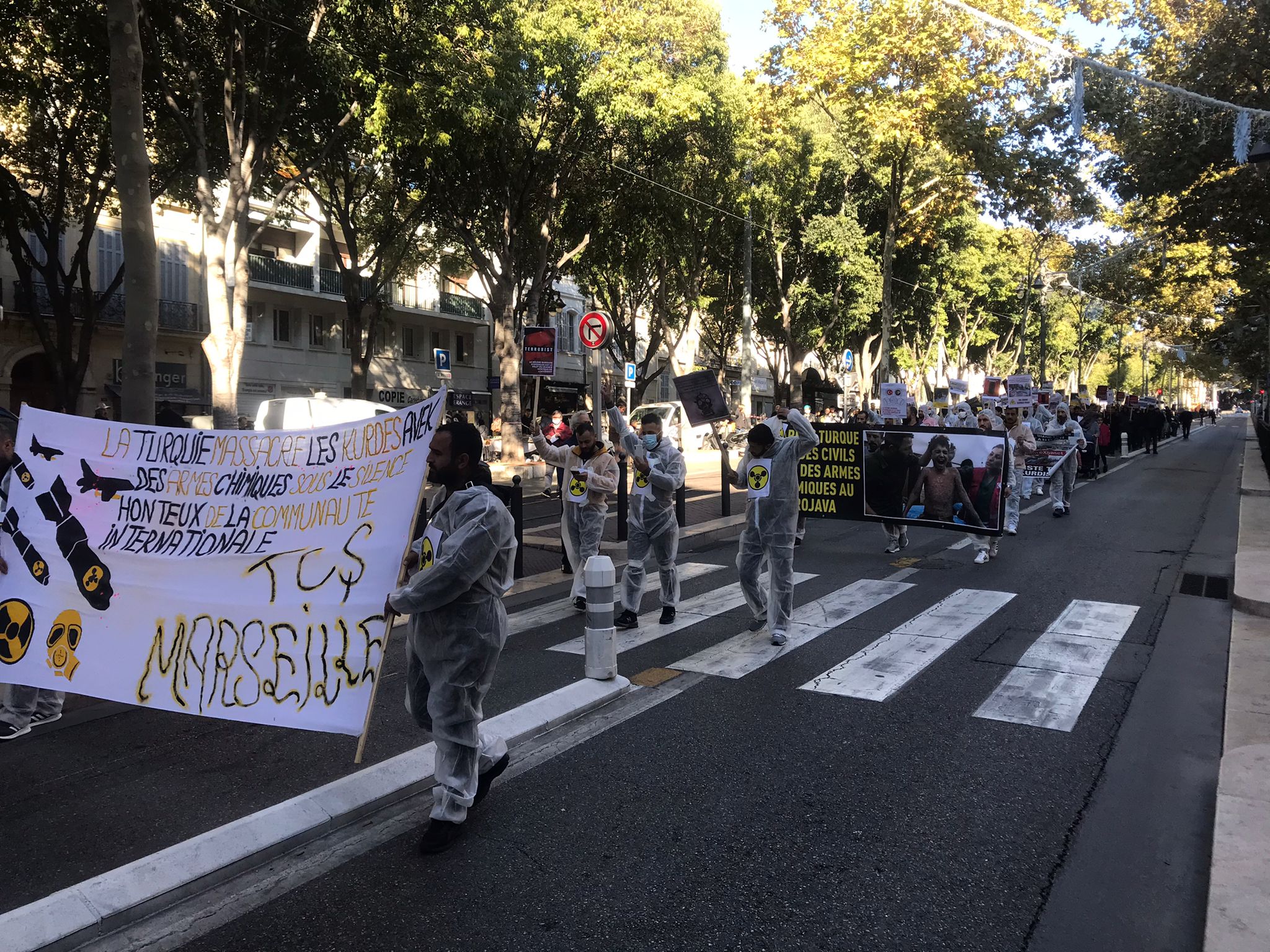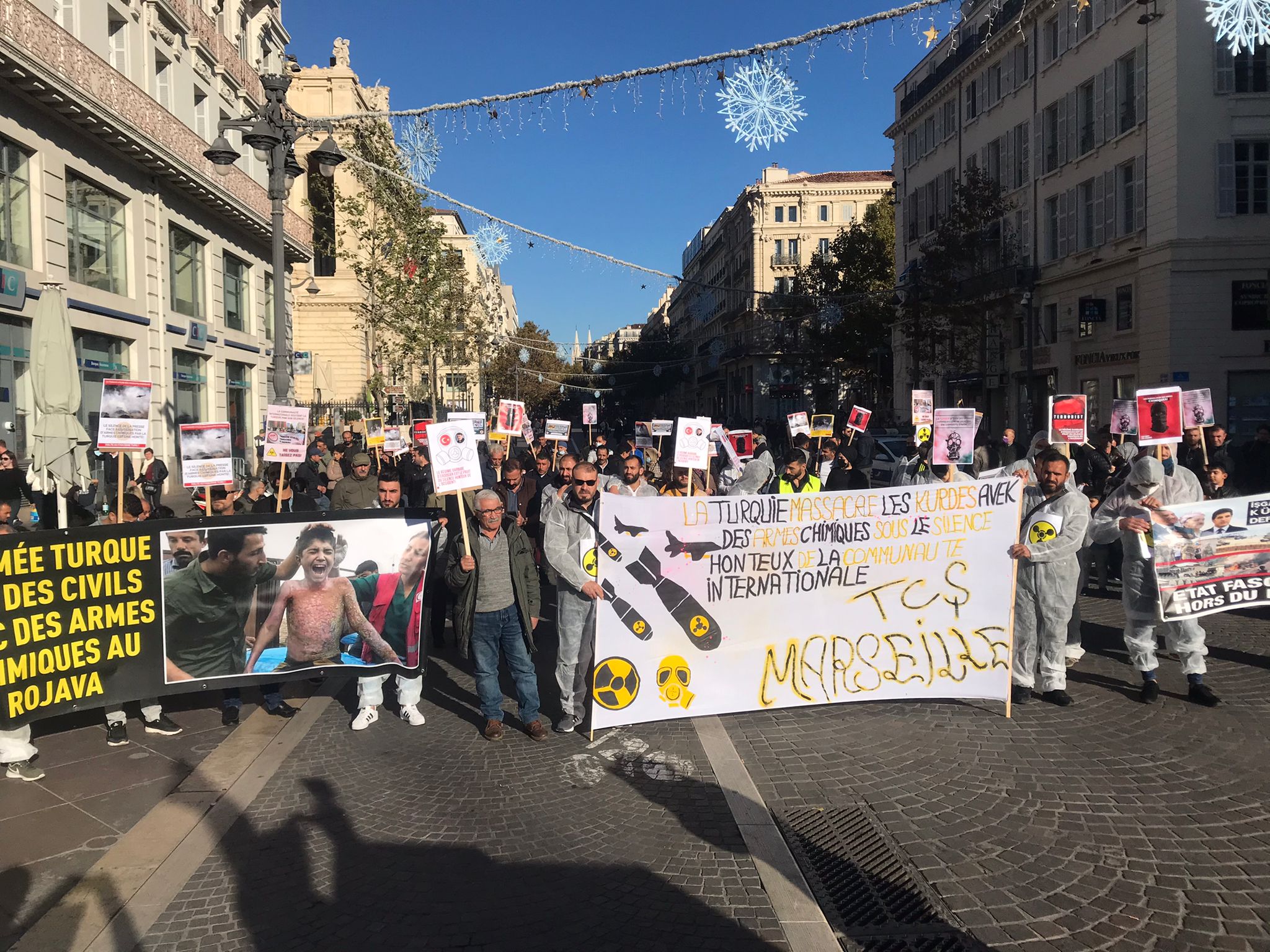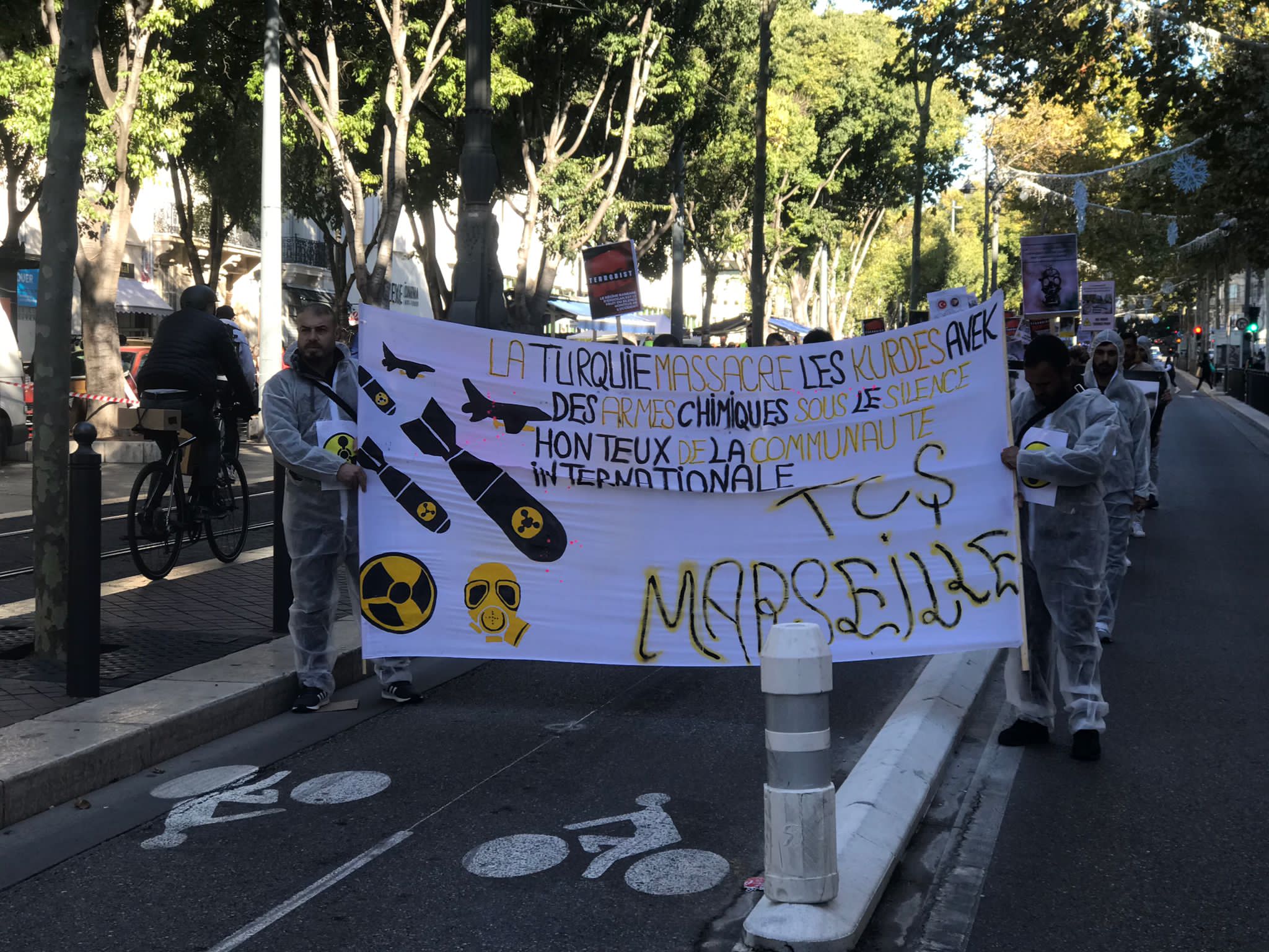 Kent merkezinde bir araya gelen yüzlerce genç ve yurtsever halk faşist TC zihniyetini teşhir etmek için kimyasal silah kullanımı anlatan pankartlar taşıdı. Türk devletinin kirli yüzü teşhir edildi. Yürüyüş boyunca eylemciler tarafından Fransızca bildiriler okundu ve etraftaki kitleye dağıtıldı.