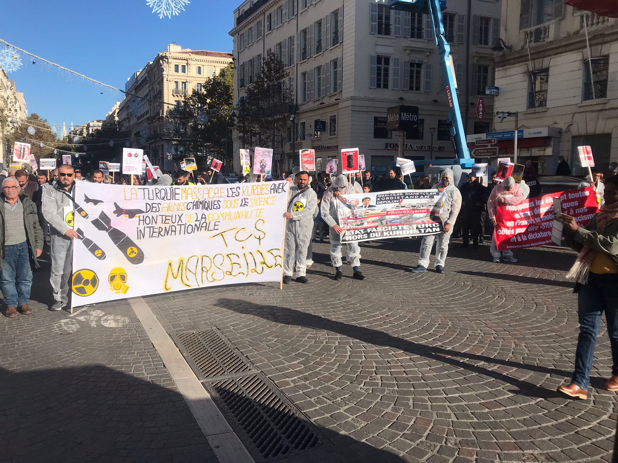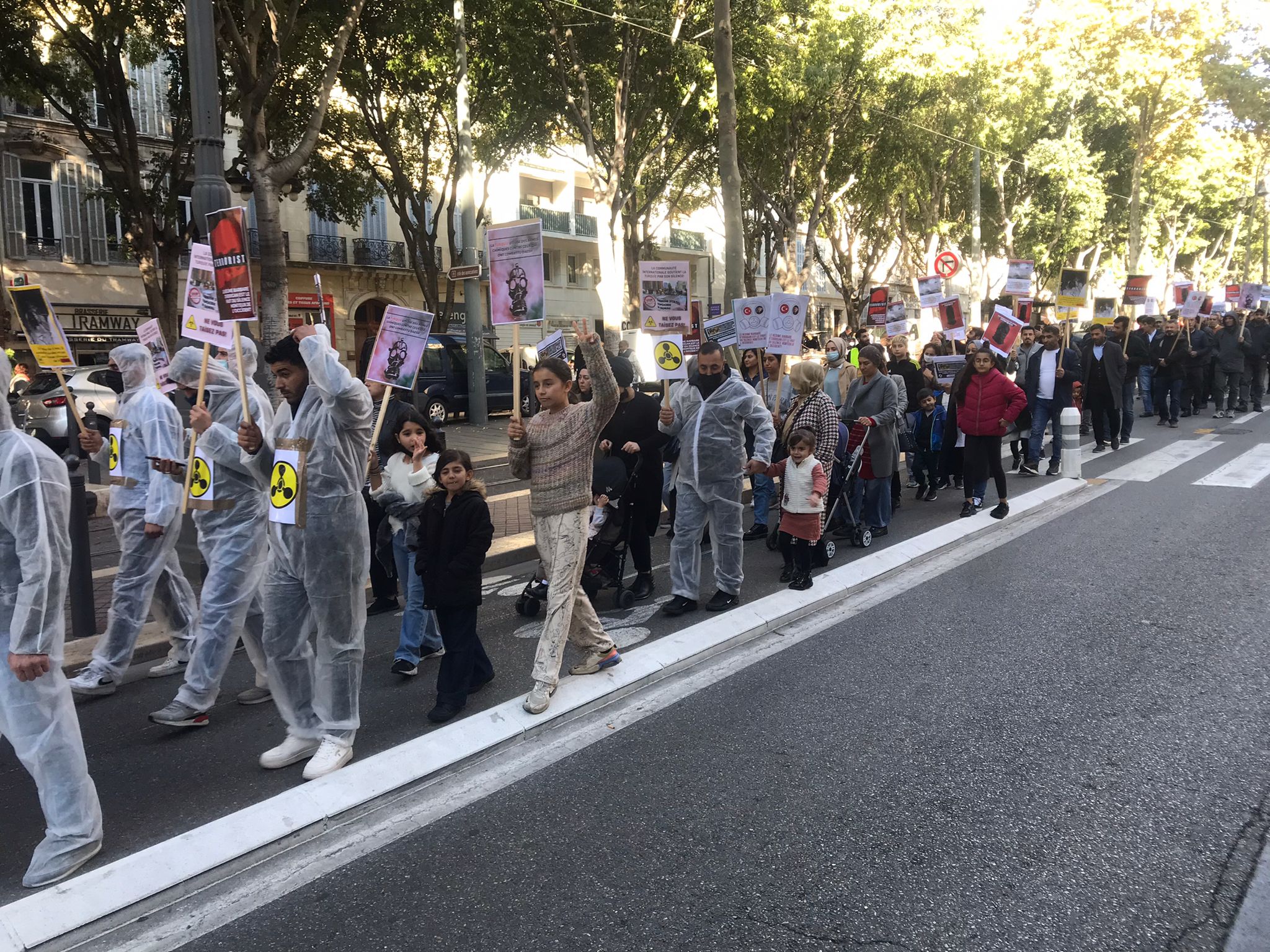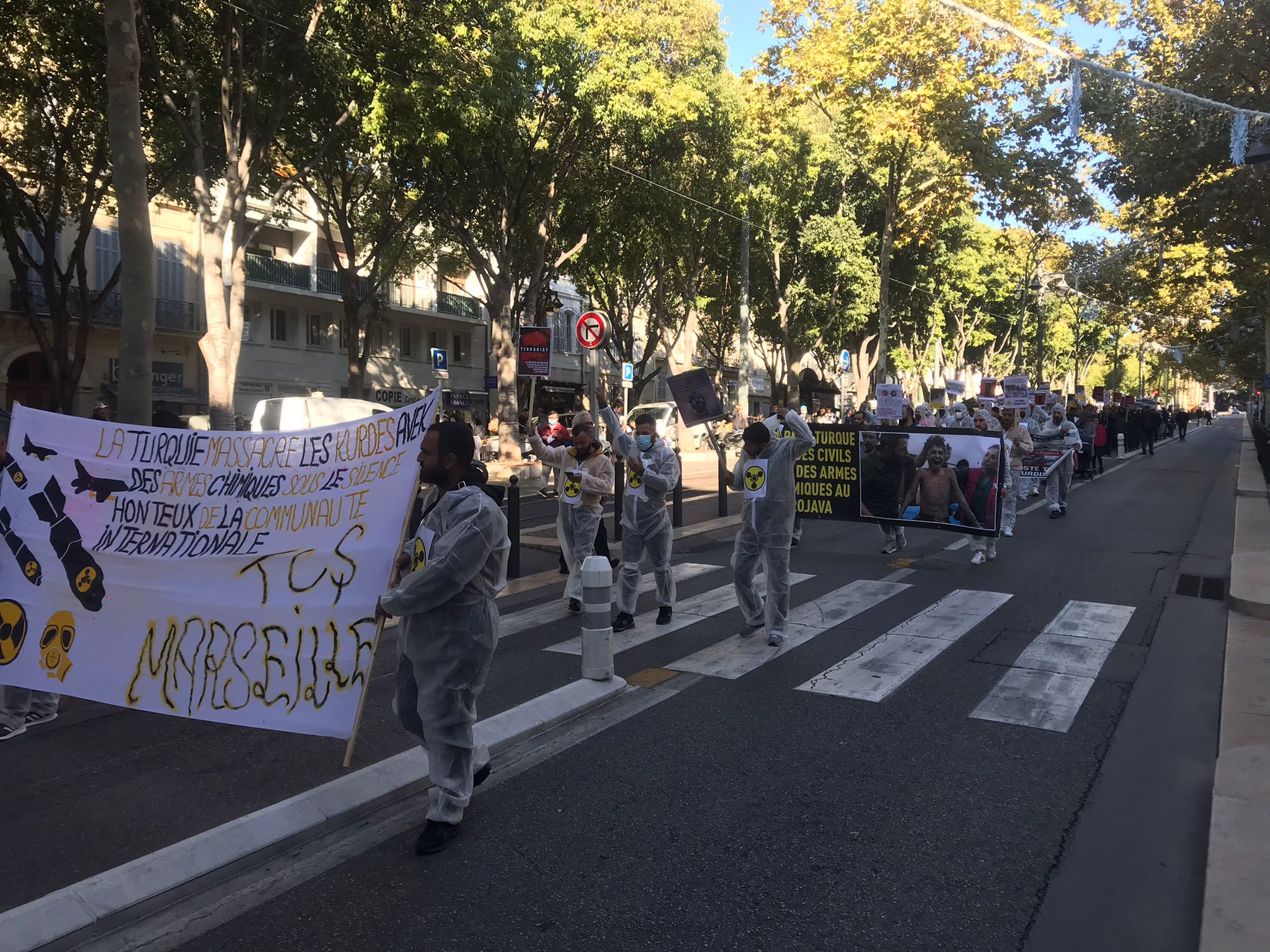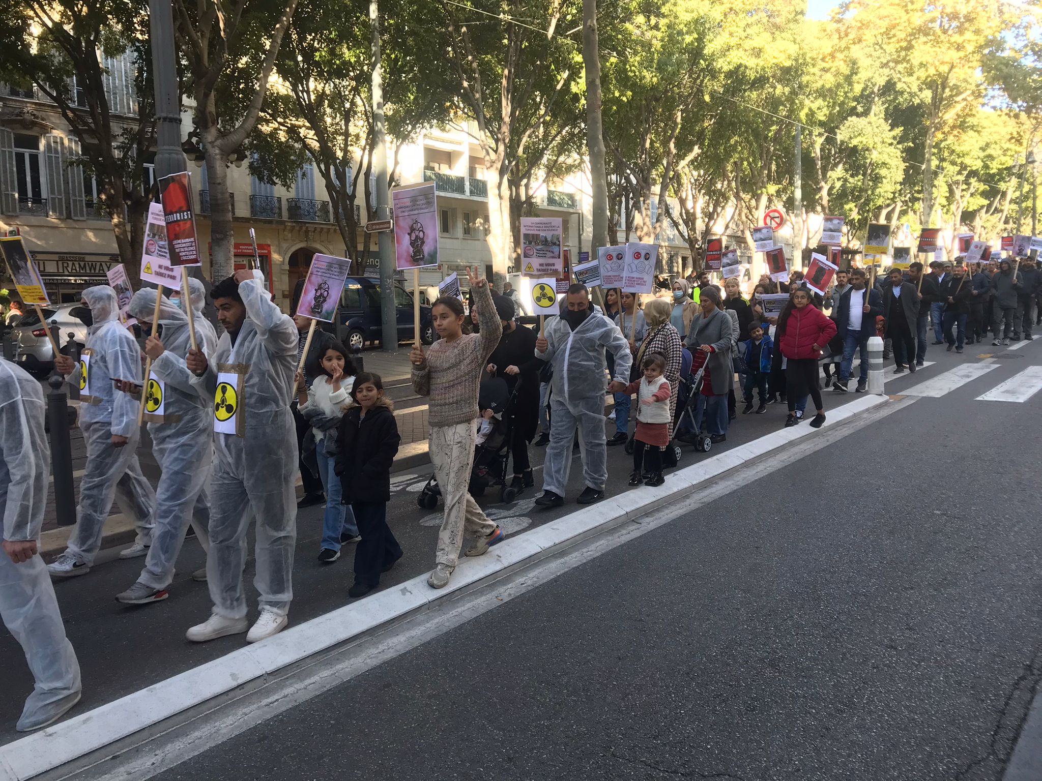 Kent merkezinde bir araya gelen yüzlerce genç ve yurtsever halk faşist TC zihniyetini teşhir etmek için kimyasal silah kullanımı anlatan pankartlar taşıdı. Türk devletinin kirli yüzü teşhir edildi. Yürüyüş boyunca eylemciler tarafından Fransızca bildiriler okundu ve etraftaki kitleye dağıtıldı.
