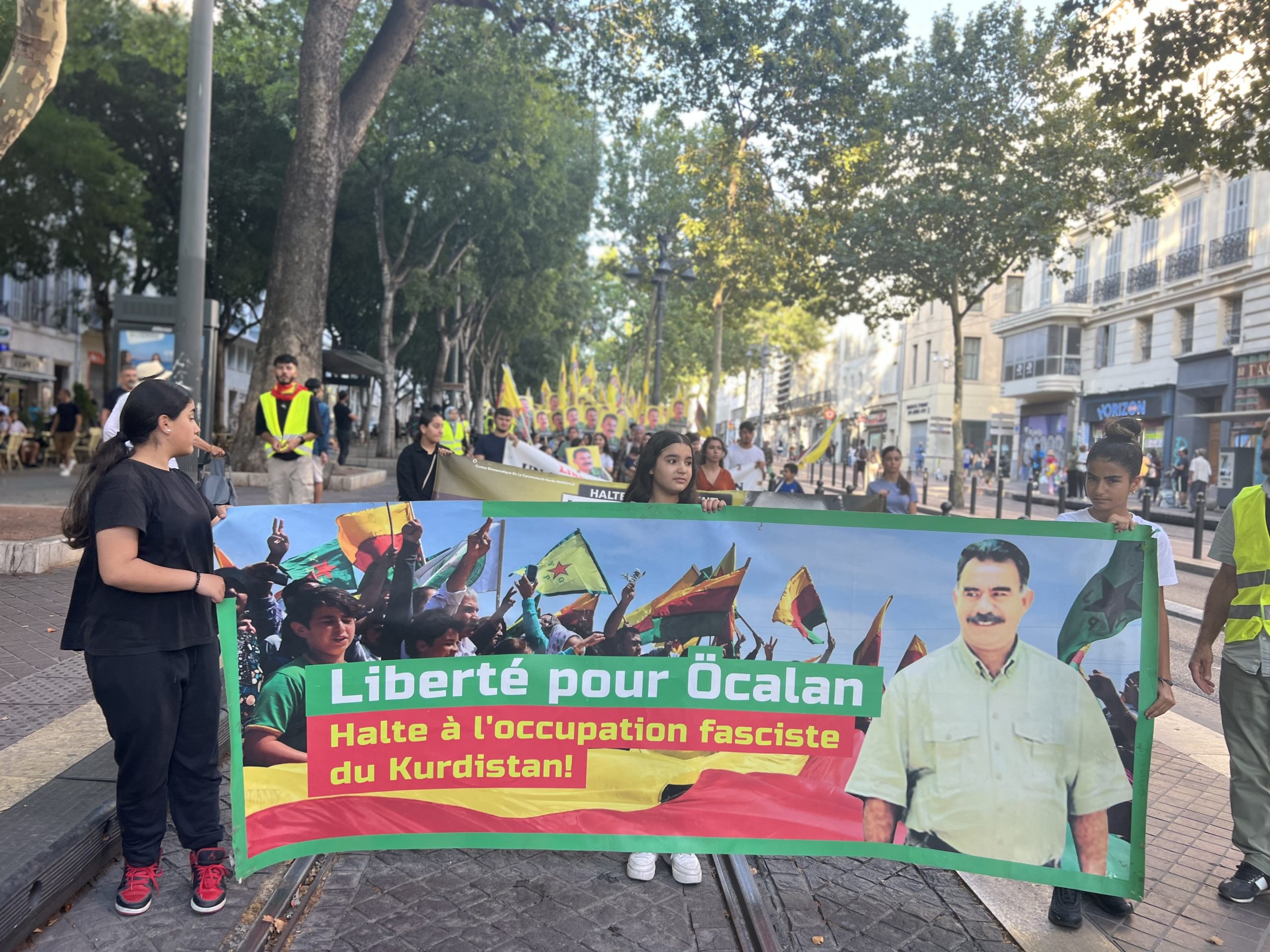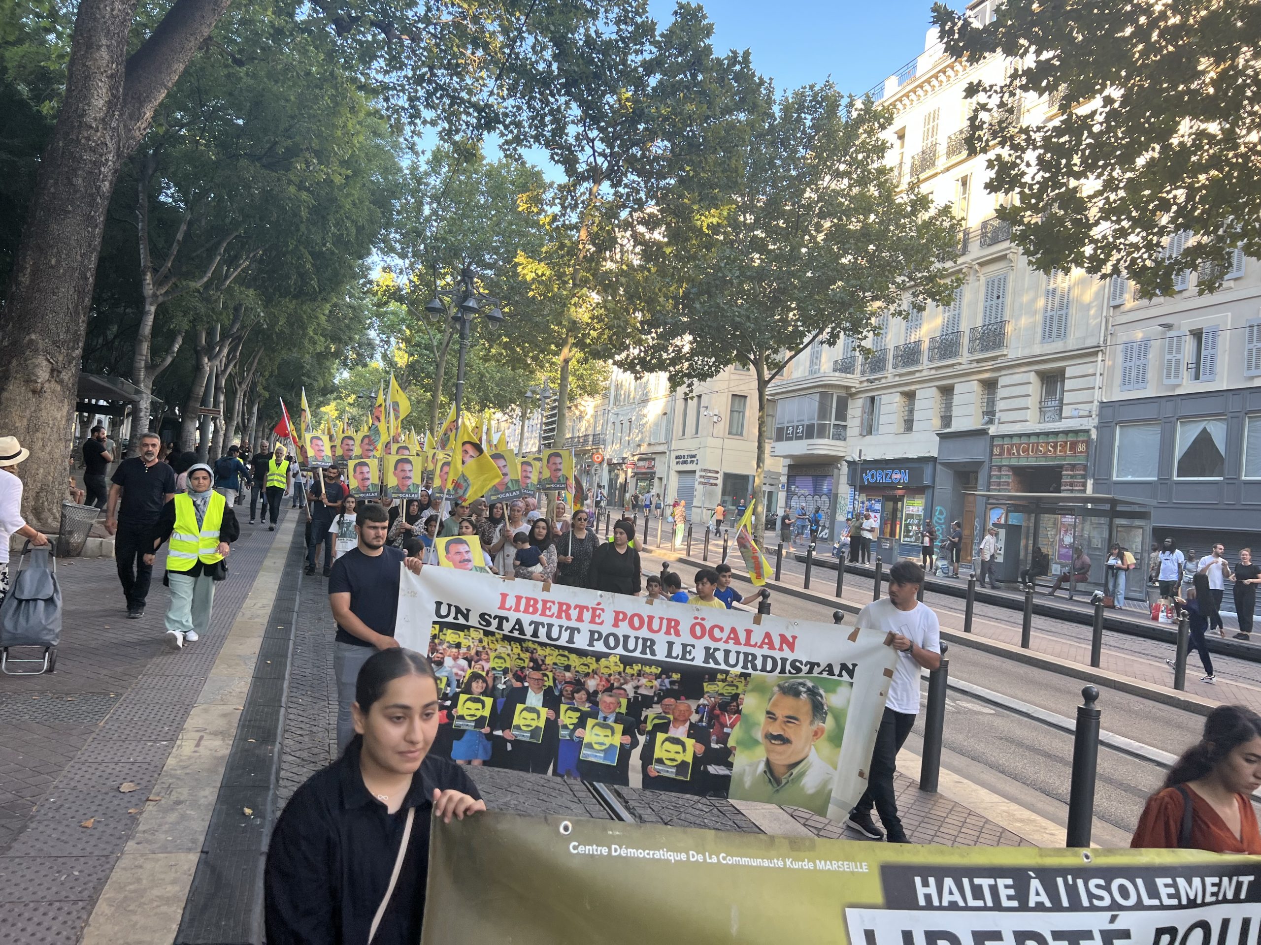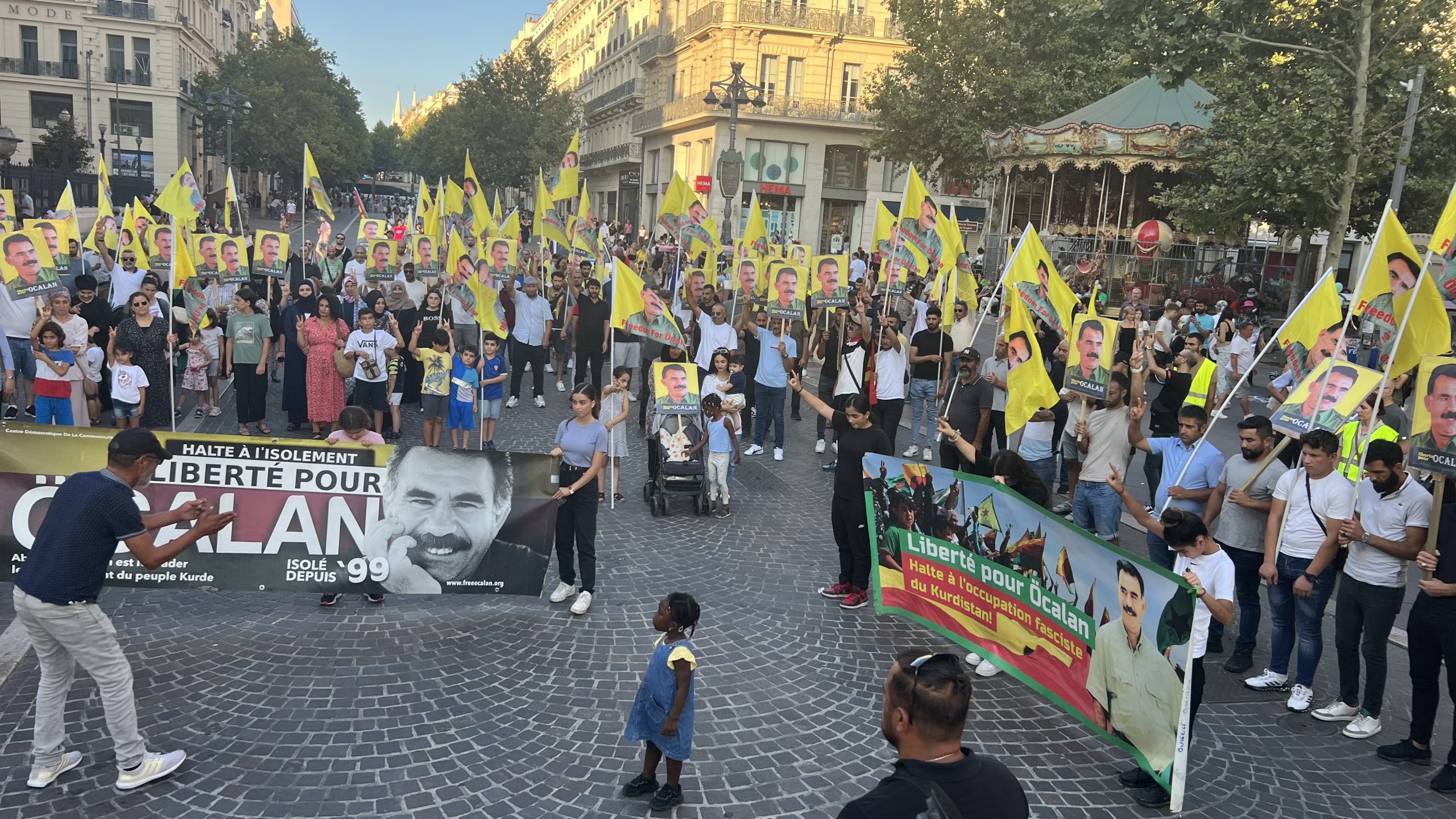 Marsilya’nın Canebièr meydanından Vieux Port meydanında kadar yürüyüş gerçekleştiren kitle, “Bijî Serok Apo” ve “Bê Serok jiyan nabe” sloganlarıyla Önder APO’nun fiziki özgürlüğünü haykırdı.