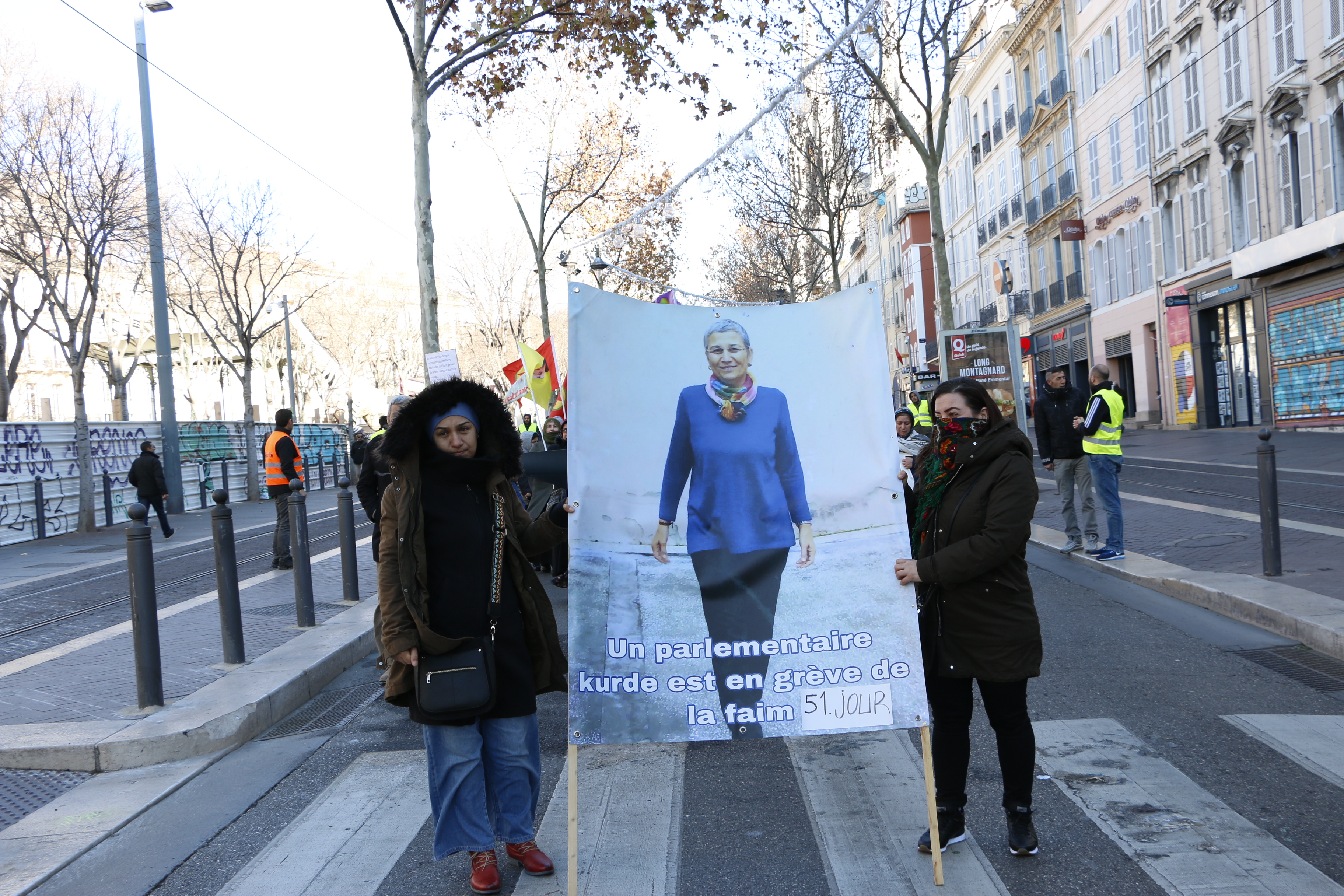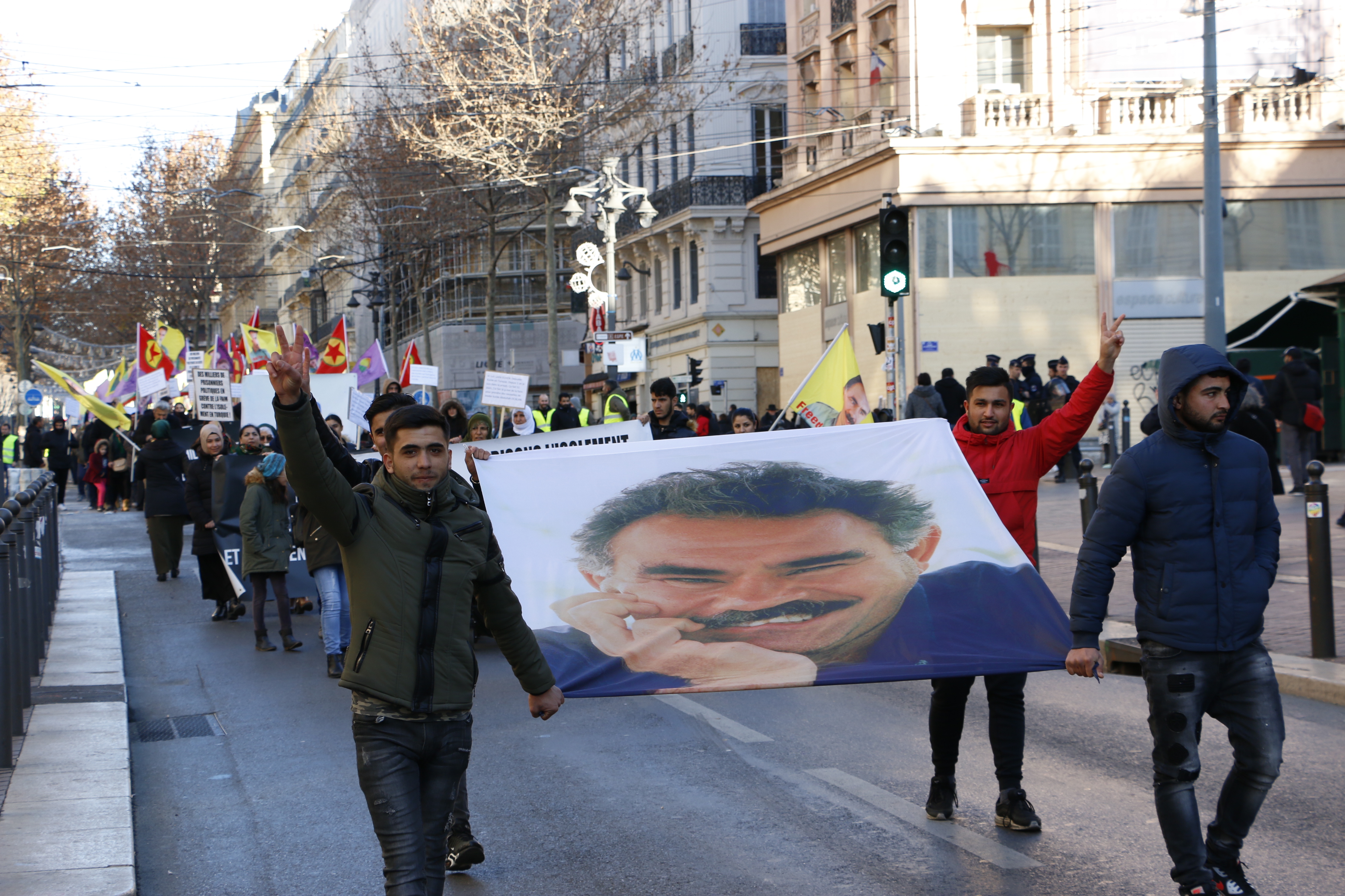HABER MERKEZİ – Fransa’nın Marsilya kenti ve çevresinde yaşayan yüzlerce Kürdistanlı, Abdullah Öcalan üzerinde devam eden ağırlaştırılmış tecrite dikkat çekmek için Türkiye cezaevlerinde, Strasbourg’ta ve Leyla Güven’in başlattığı süresiz ve dönüşümsüz açlık grevi eylemlerine dikkat çekmek amacıyla bir yürüyüş ve miting düzenledi.Öğlen saatlerine doğru Canebière Meydan’ında toplanmaya başlayan kalabalık ‘katil Erdoğan’ , ‘Öcalan’a özgürlük’ ve ‘hepimiz Öcalanız’ sloganı attı. Slogan ve konuşmaların ardından Öcalan’ın ve Leyla Güven’in büyük posterleri eşliğinde yürüyüşe geçen kitle, taşıdıkları değişik döviz ve pankartlarla Türk devletinin Rojava’ya dönük tasfiye politikalarını protesto etti. Açlık grevi eyleminin selamlandığı eylemde Avrupa İşkenceyi Önleme Komitesi’ne (CPT) bir an önce açlık grevinde bulunan eylemcilerin talebini kabul ederek, İmralı’yı ziyaret etme çağrısında bulunuldu.