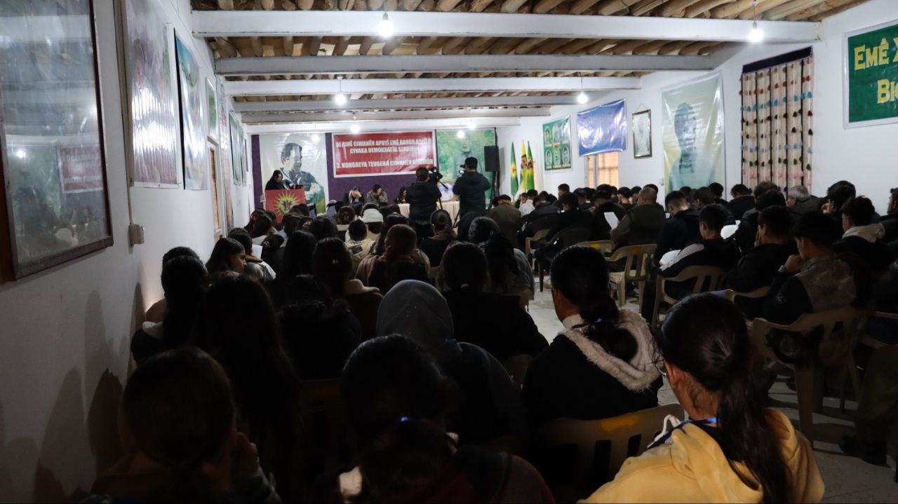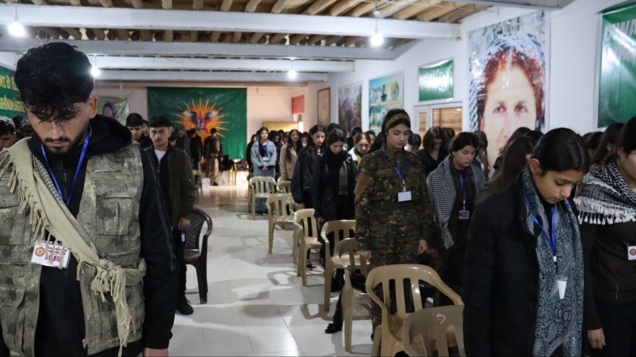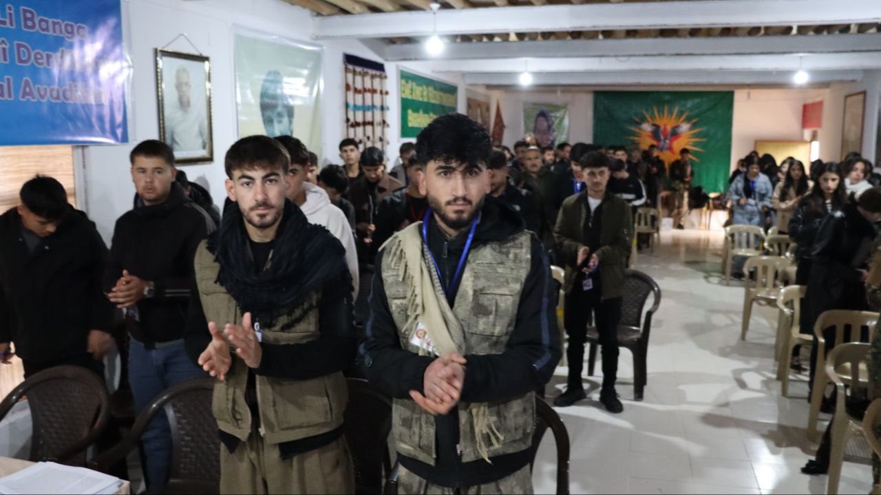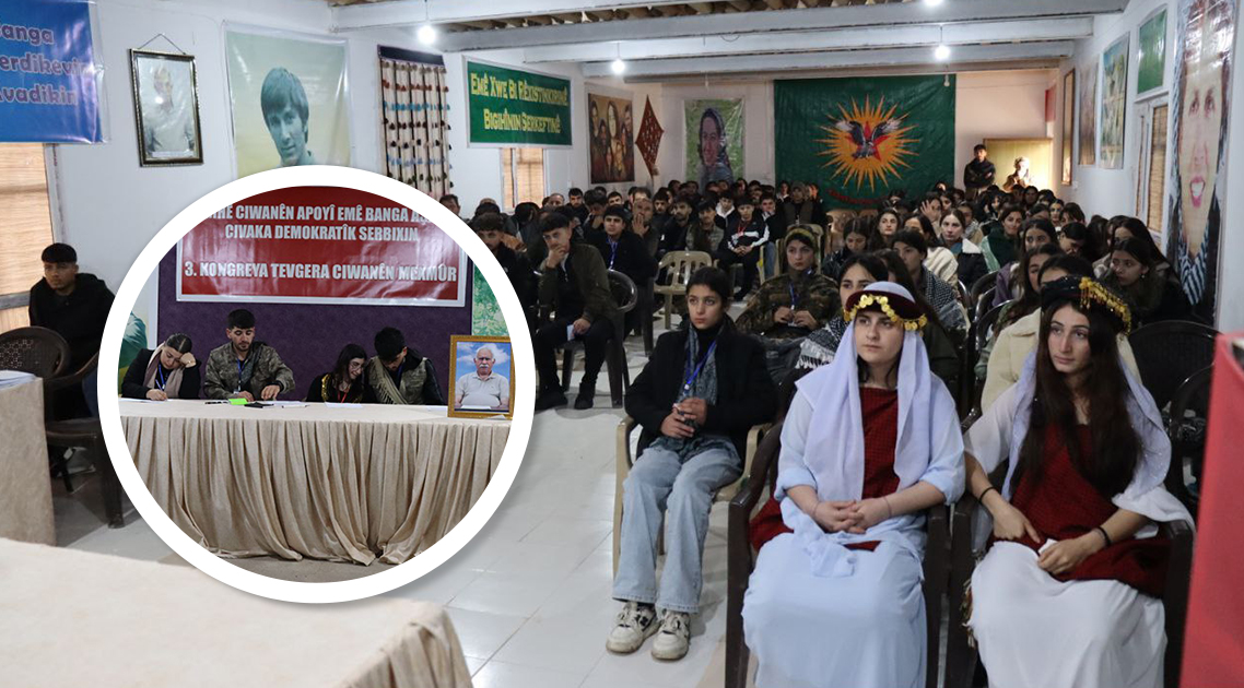 Kongre salonu, Önder Apo, Şehit Kurtay Feraşin, gençlik komutanları ve öncü kadroların posterleri asıldı. Kongre, ‘Bi Rihê Ciwanèn Apoyî Emê Banga Aşitî û Civaka Demokratîk Serbixin’ sloganıyla düzenleniyor. Kongreye 200 delege katılının yanı sıra ayrıca Ciwanen Ezîdxanen Şengal katılım gerçekleştirdi.