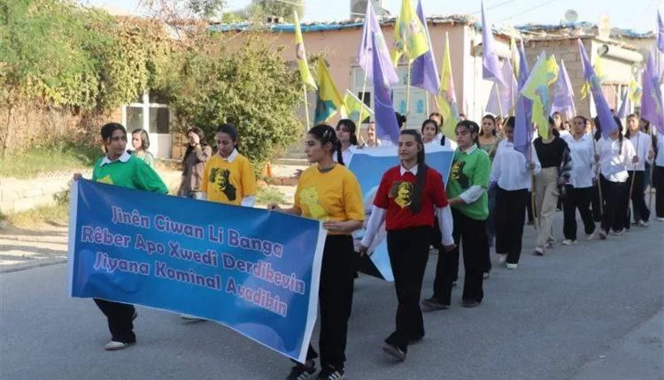 Yürüyüş boyunca “Biji Serok Apo” ve “Jin, Jiyan, Azadî” sloganları atıldı. Aynı zamanda Önder APO’nun posterleri taşındı ve üzerinde “Genç Kadınlar Önder APO’nun çağrısına sahip çıkıyor ve komünal yaşamı inşa ediyor” yazılı bir pankart açıldı.