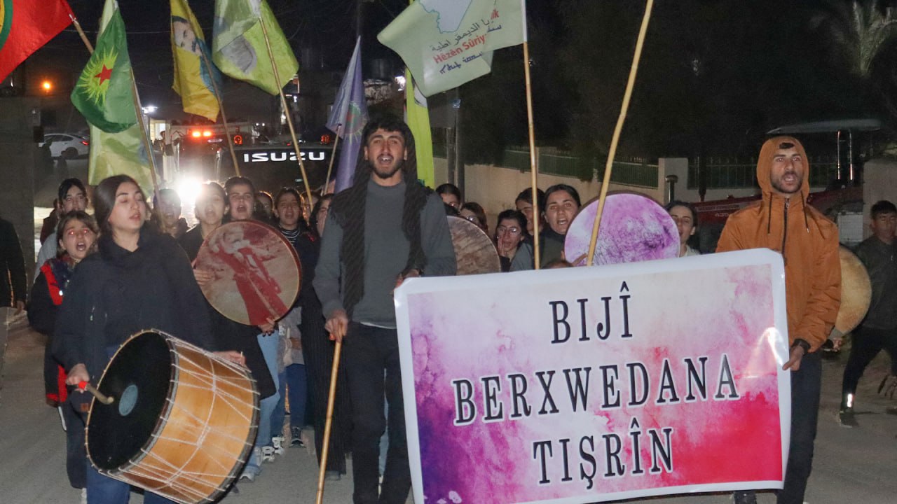 MEXMÛR- Dün gece, TJCM ve TCM öncülüğünde Mexmûr Şehit Rüstem Cudi Kampı’nda, tarihi Tişrin Direnişi’ni selamlamak amacıyla bir eylem düzenlendi. ‘Bijî Berxwedana Tişrînê’ sloganıyla gençler, ellerinde davullar, bayraklar ve pankartlarla ve zılgıtlarıyla kampta yürüyüş gerçekleştirdi. Mexmûr halkı gençlik yürüyüşüne korna çalarak destek verdi. Tüm kampı kapsamlı bir şekilde gezdikten sonra gençler, Gençlik Meclisine doğru yola çıkarak burada bir açıklama gerçekleştirdi.